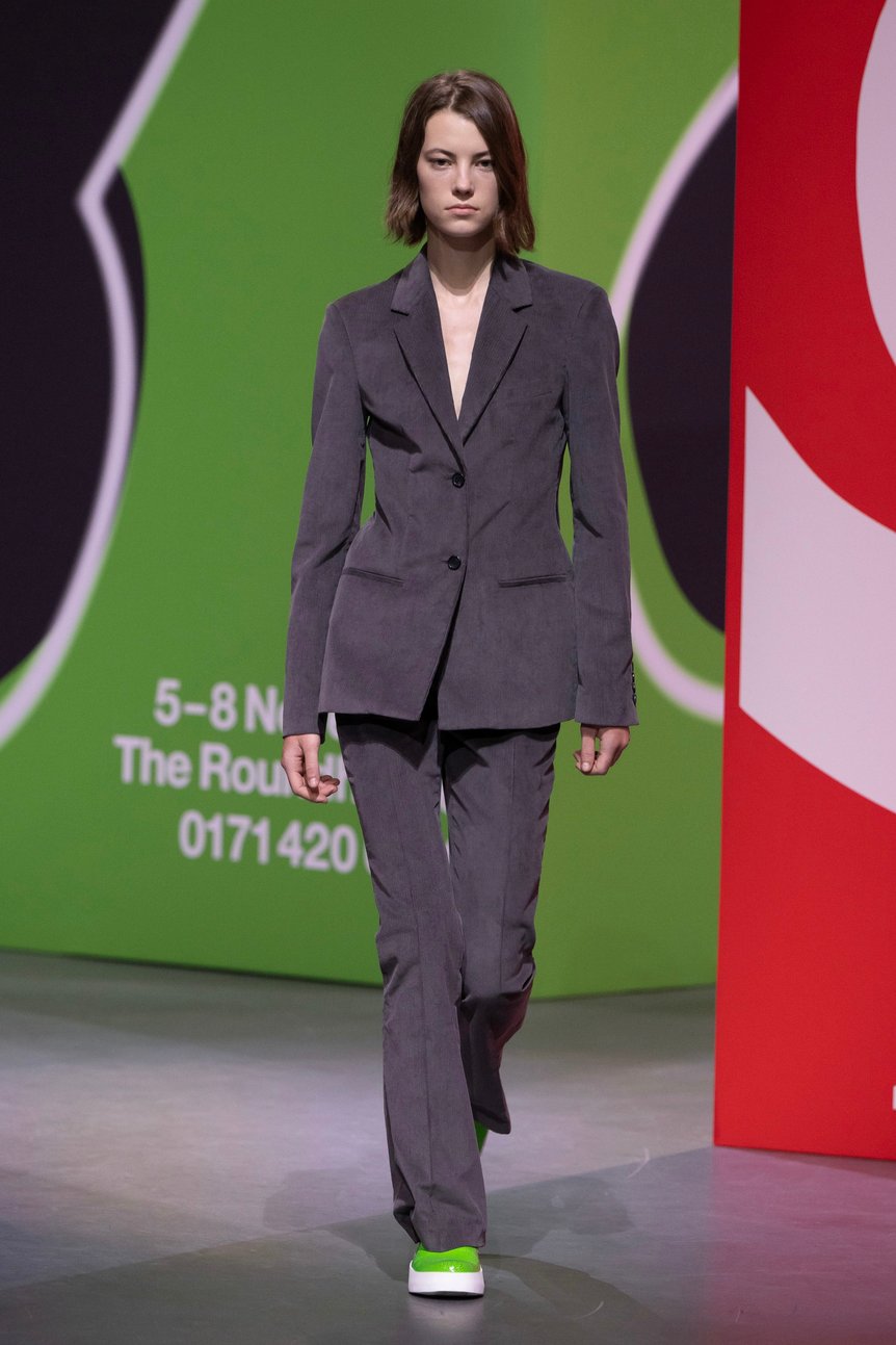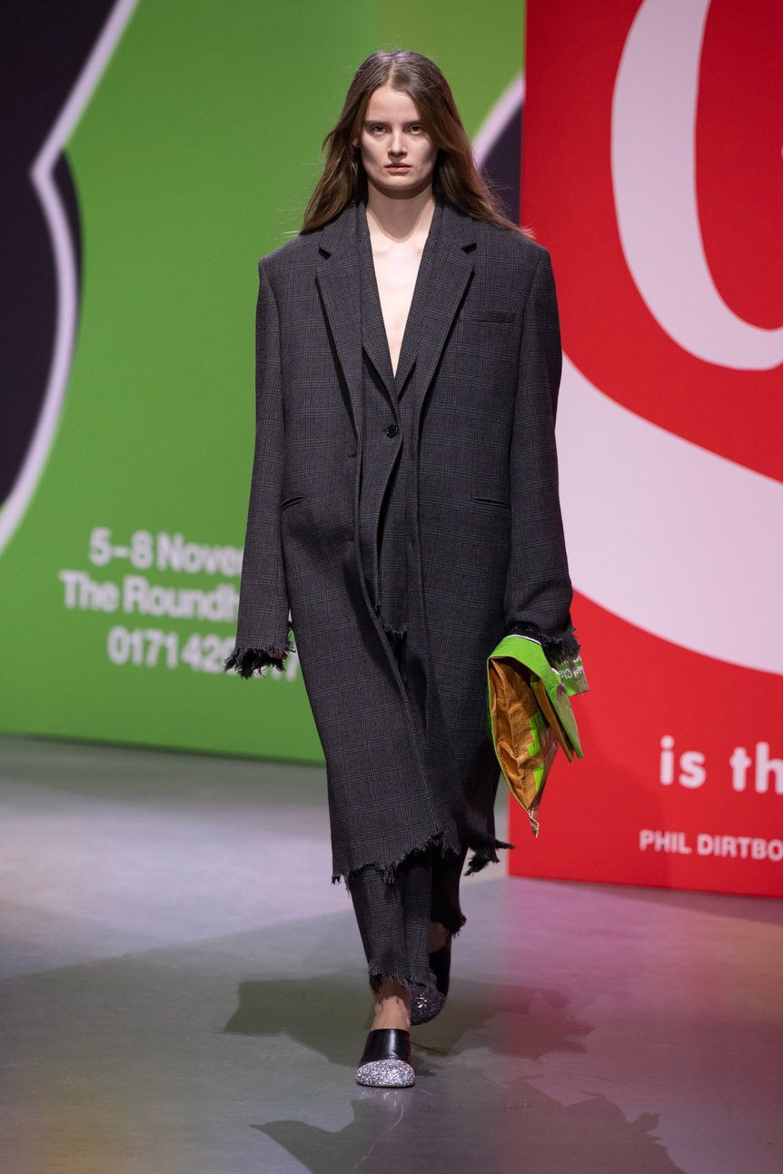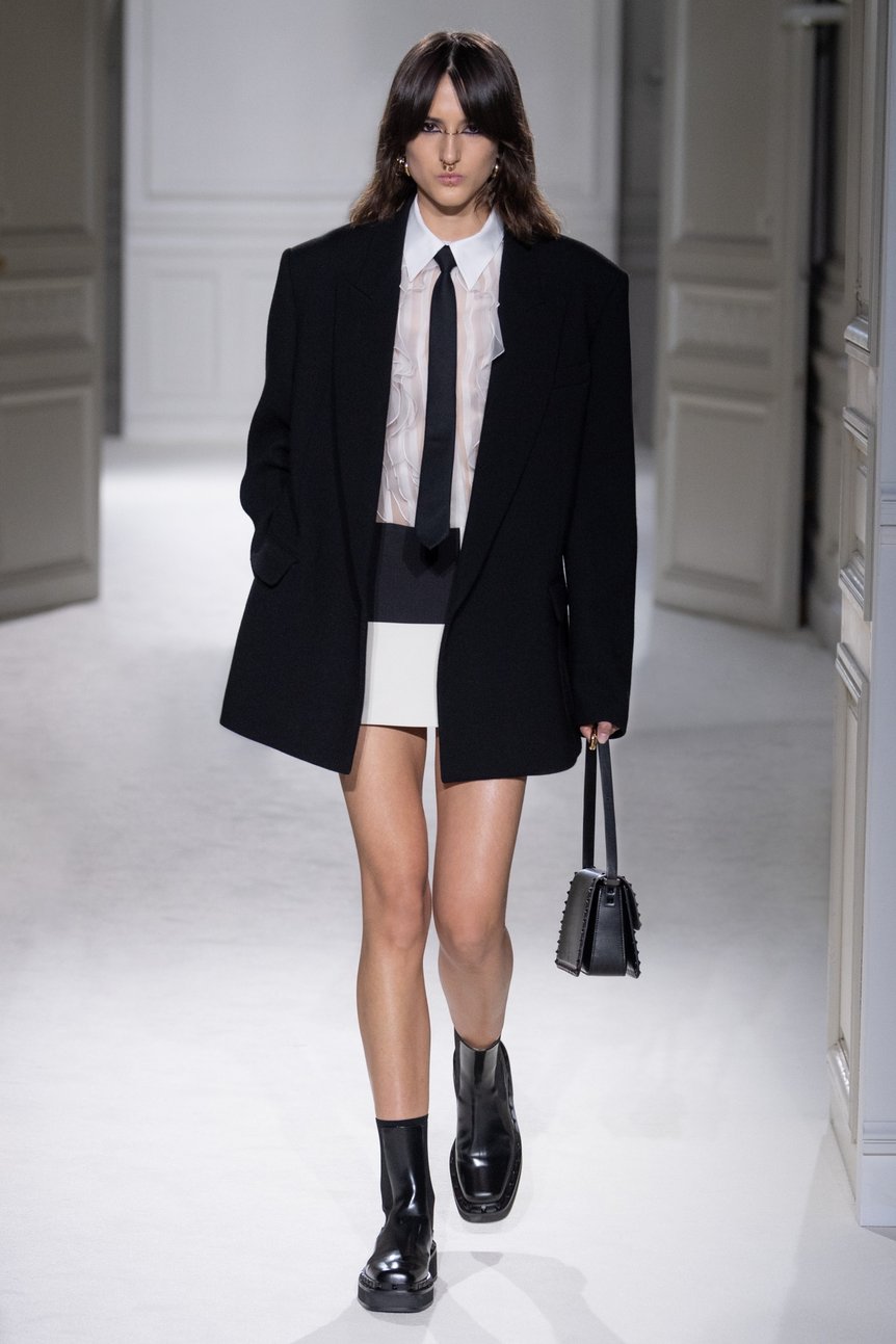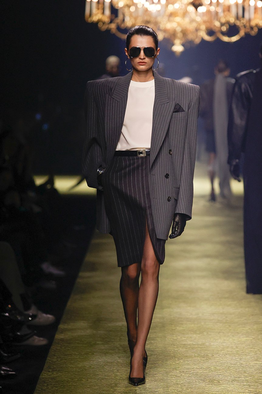 オーバーサイズやパワーショルダーは引き続き健在。これまでよりもボトム部分はタイトなシルエットで「逆三角形」のフォルムを作り、80年代の女性たちのようなパワフルなスタイルが新鮮だ。