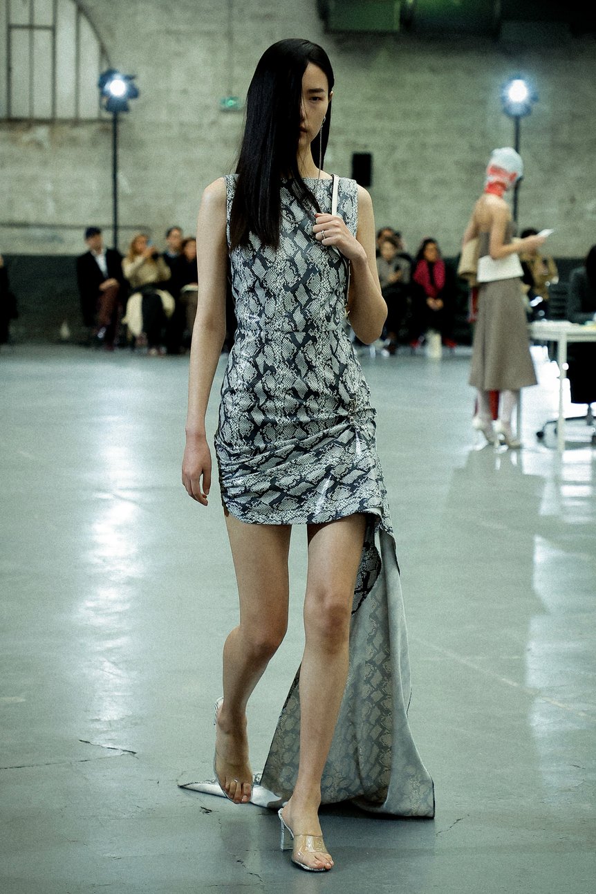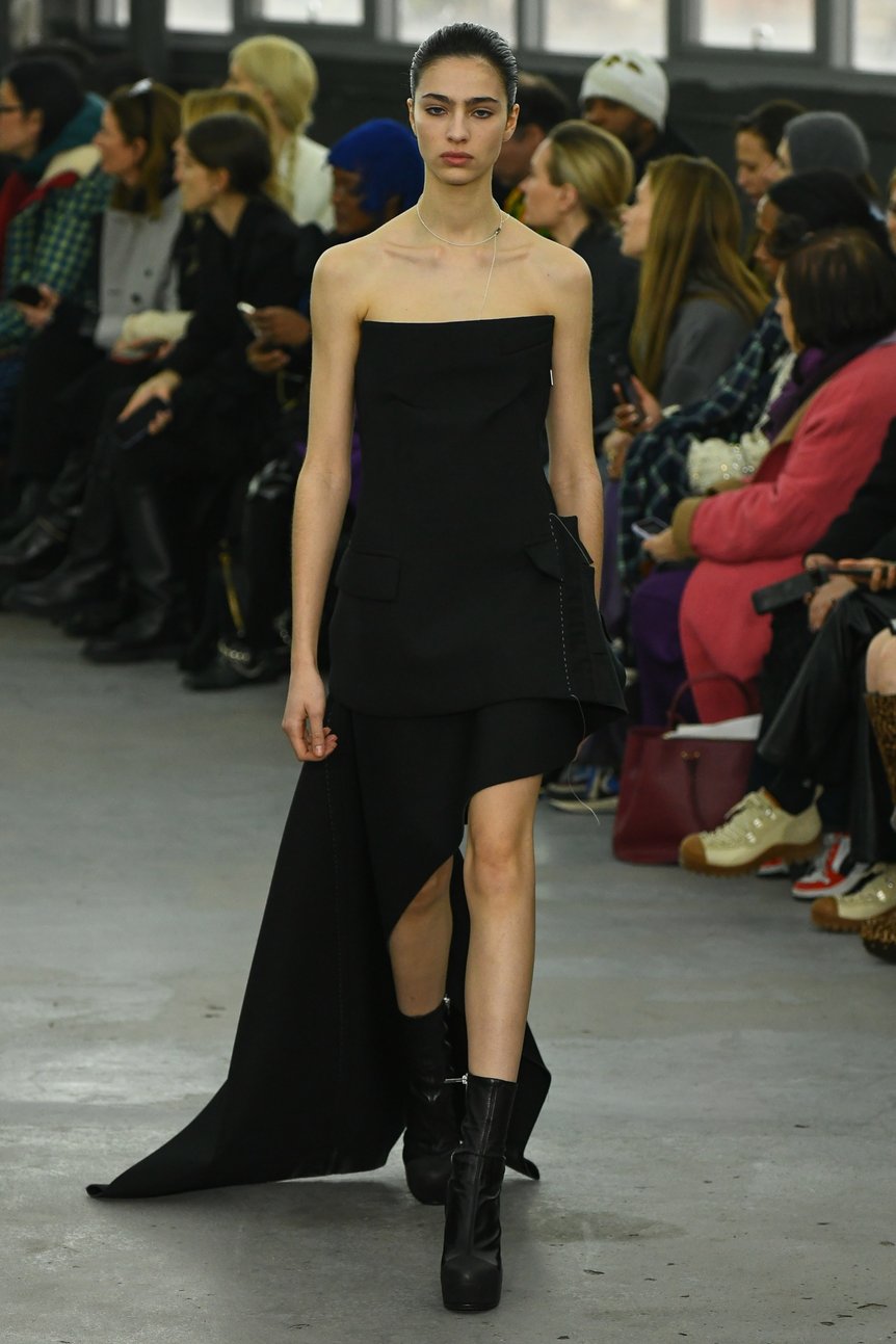 ミニのドレスやスカートに、イヴニングドレスのように長いトレーンがついたスタイルが登場。露出した肌とのギャップとともに、縦長のラインが強調されている。