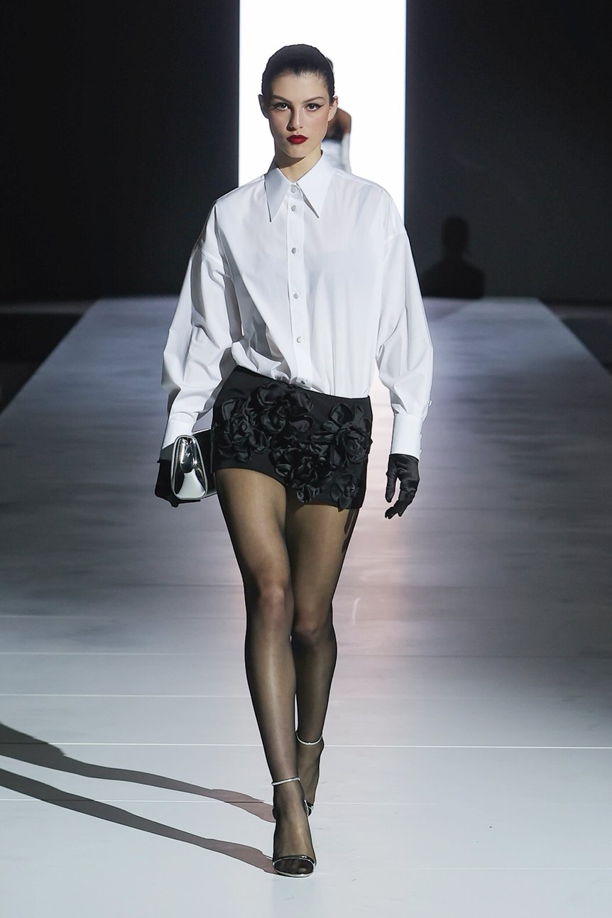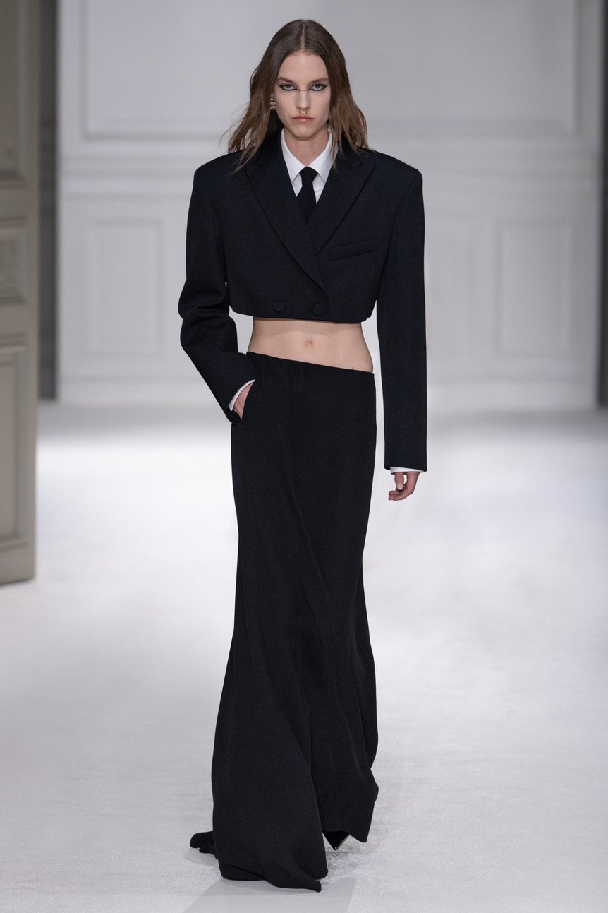 今シーズンは、短いトップスとローウエストのぺンシルロングスカートを組み合わせたスタイルが多く見られた。ボディを優しく包み、縦長のフィットでIラインのシルエットを描く。