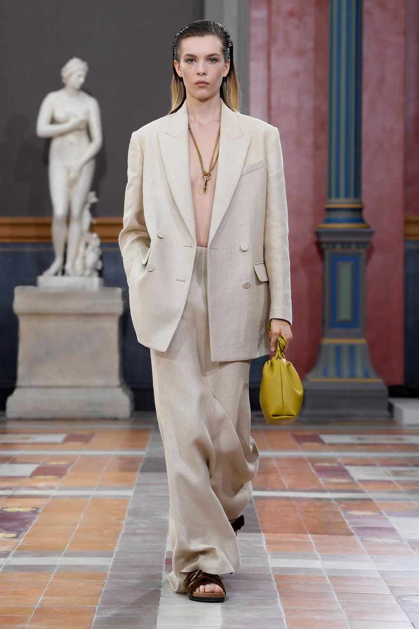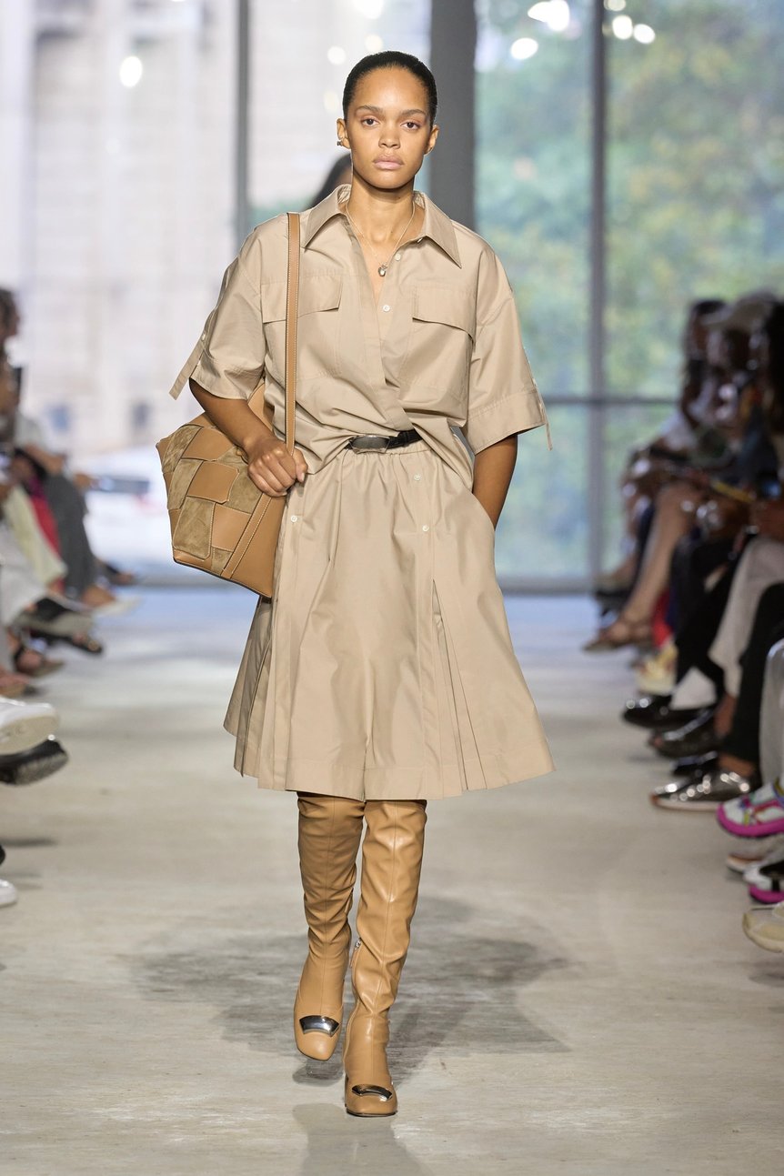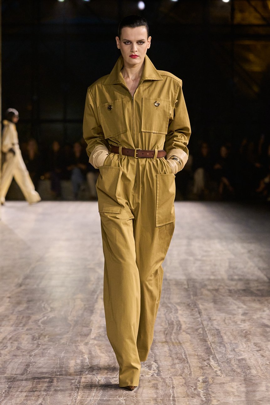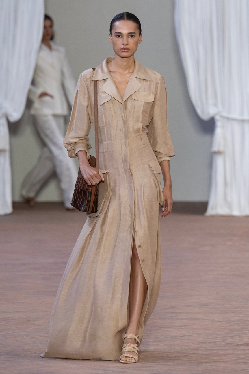 実用的なアイテムをシックに再解釈されたジャンプスーツやシャツジャケット、ドレスなどの数々。ベージュやアイボリーなどの色は、今シーズンの重要なカラー。