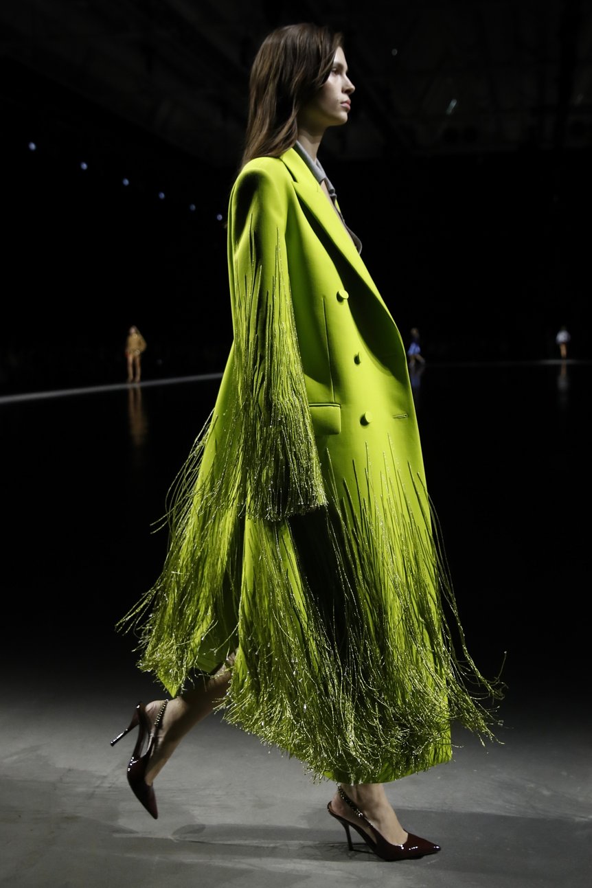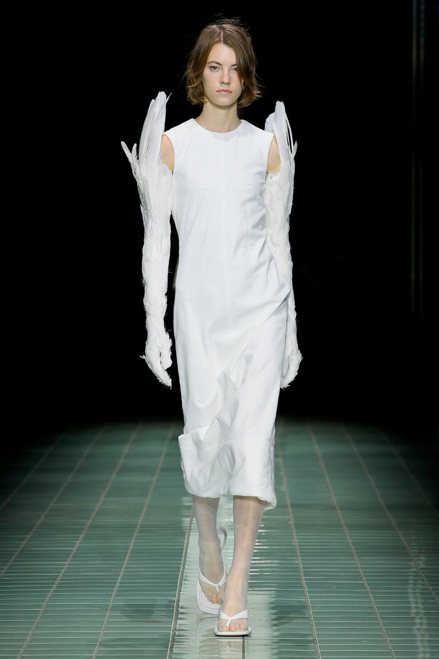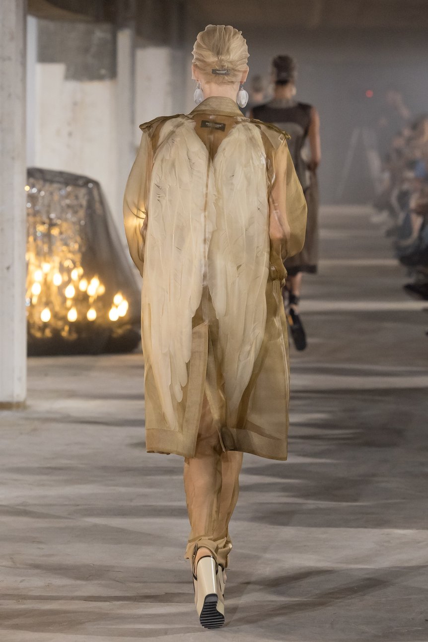 今シーズンの特徴的なデザインとして、天使の羽根を背中につけたコートやドレスが複数のブランドで見られた。また、羽毛が飛び出たブルゾンやフェザーつきのドレスなど、「羽根」にまつわるアイテムも目立つ。
