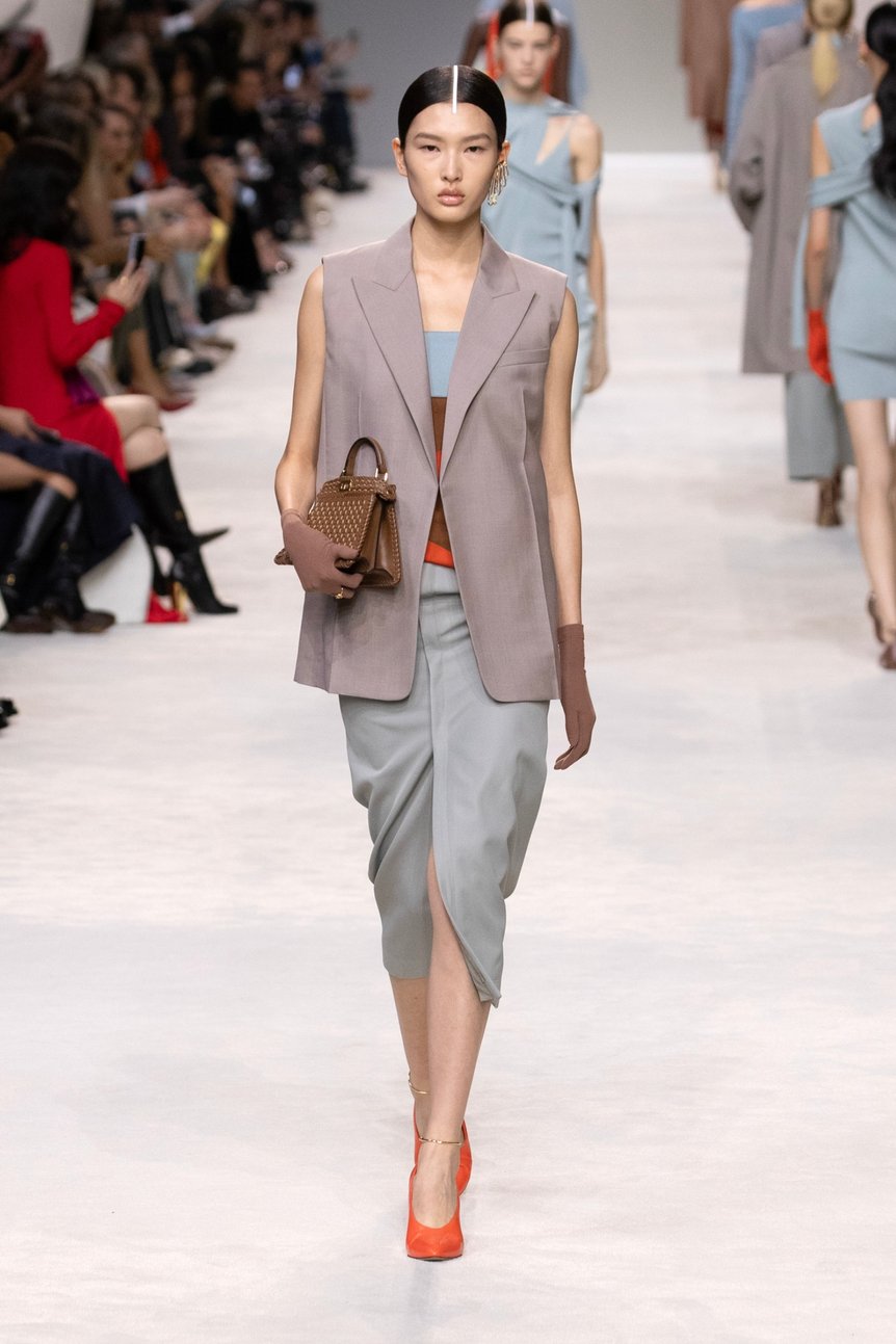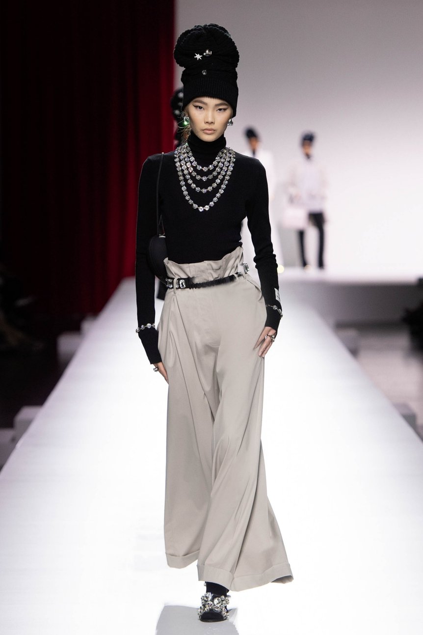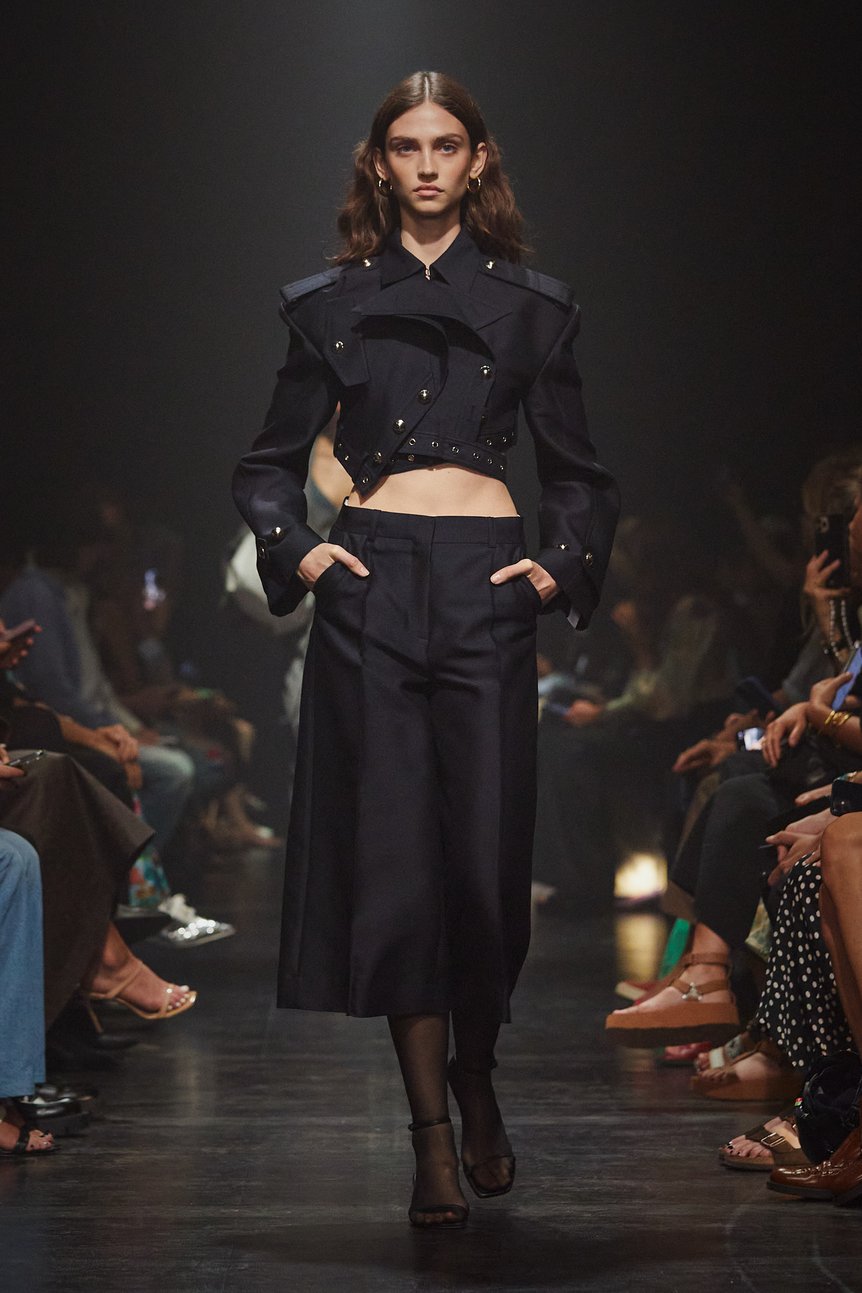 ウエスト位置が高いワイドパンツやテーパードパンツ、ペンシルスカート、またはコルセットのようなアイテムで、ウエストをマークするスタイルが多く見受けられた。