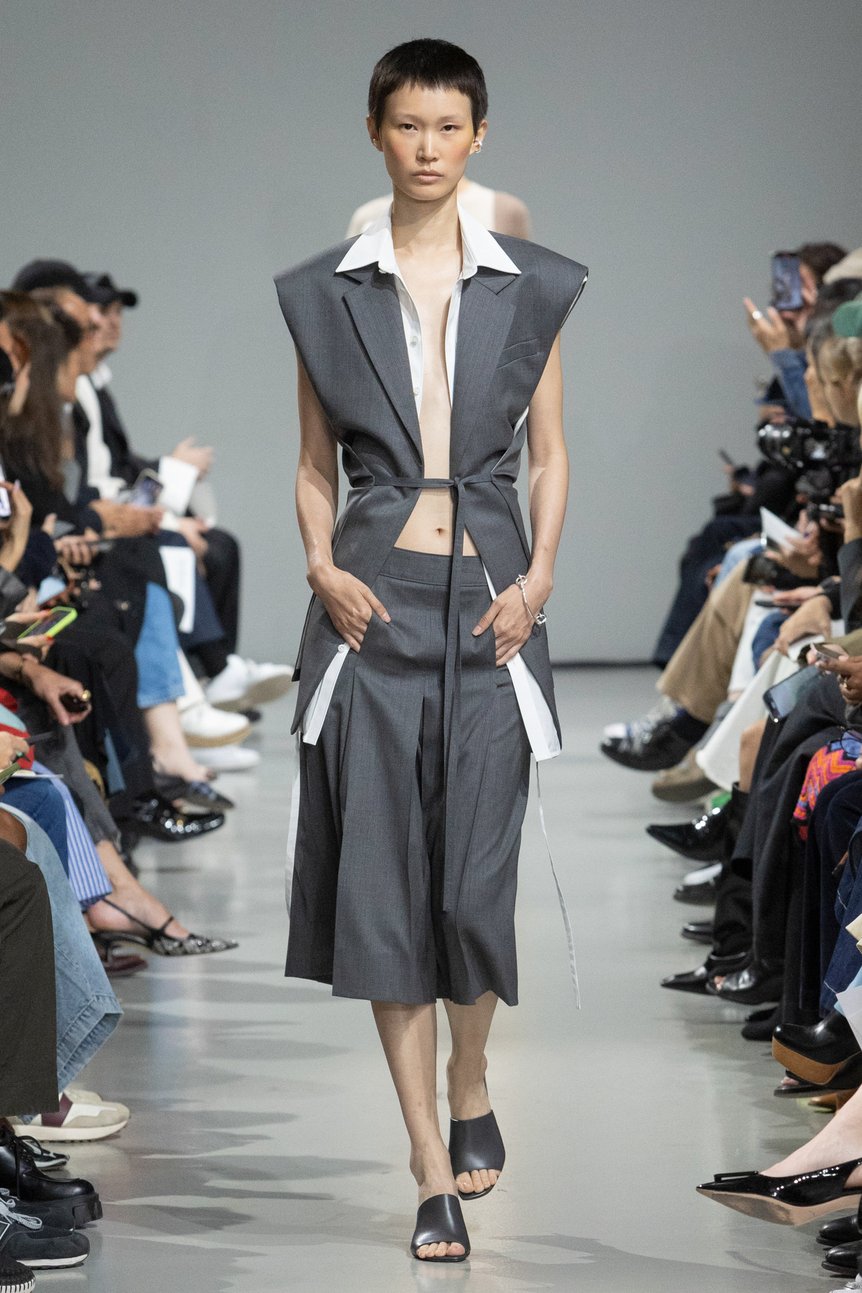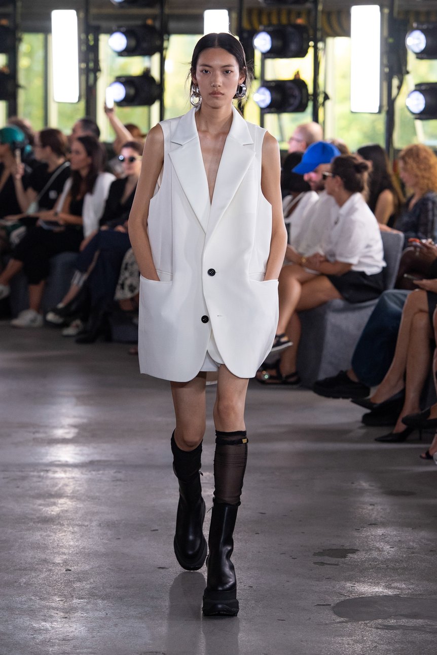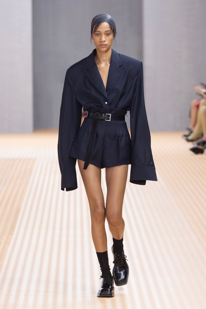 2023年からZ世代セレブの大胆な「ノーパンツ」スタイル(=ボトムを履いていないかのようなマイクロミニのスタイル)が話題だったが、その流れがいよいよトレンドに。仕立ての良いオフィス風メンズジャケットにマイクロミニボトムを合わせるといった、絶妙なバランスの健康的なスタイルが新鮮だ。