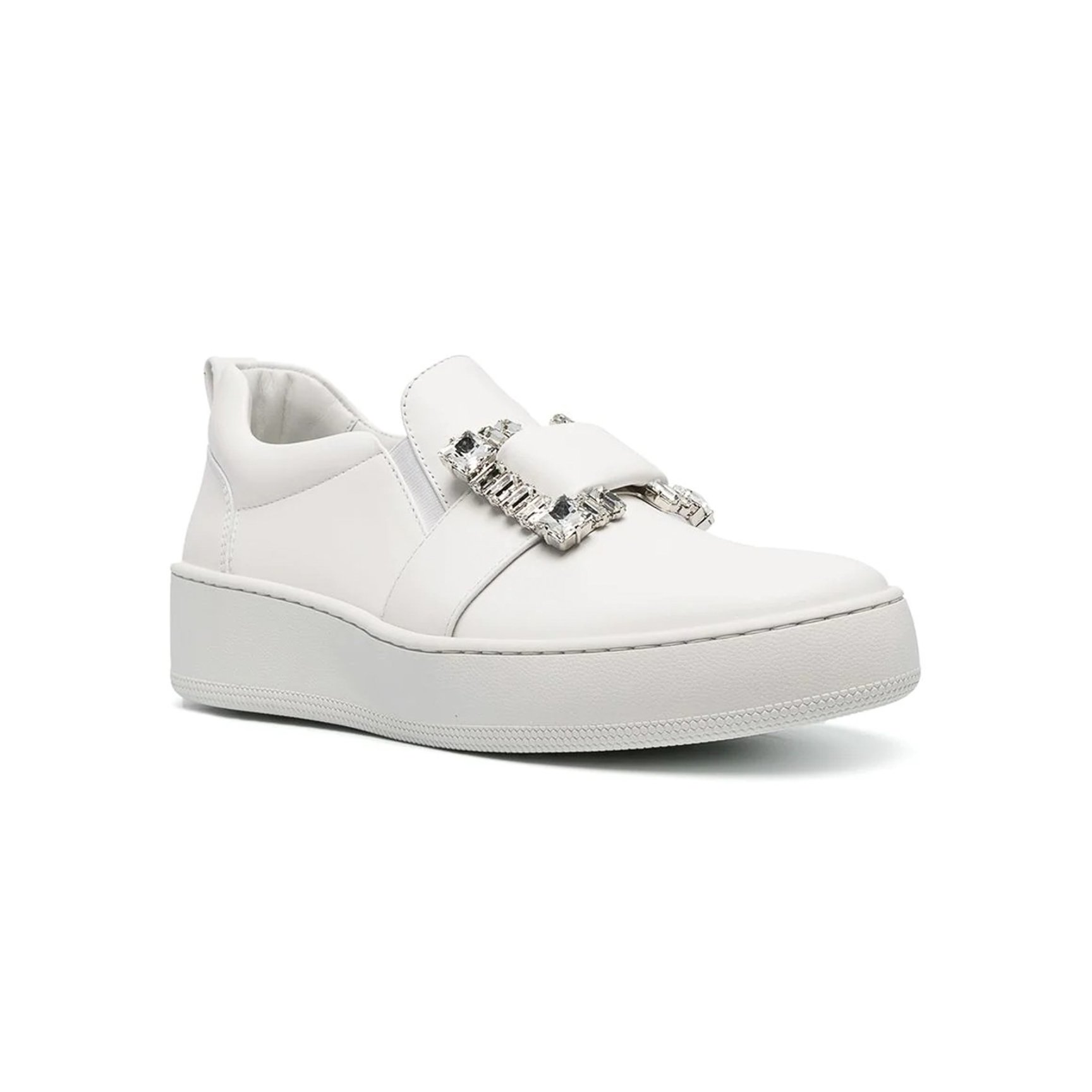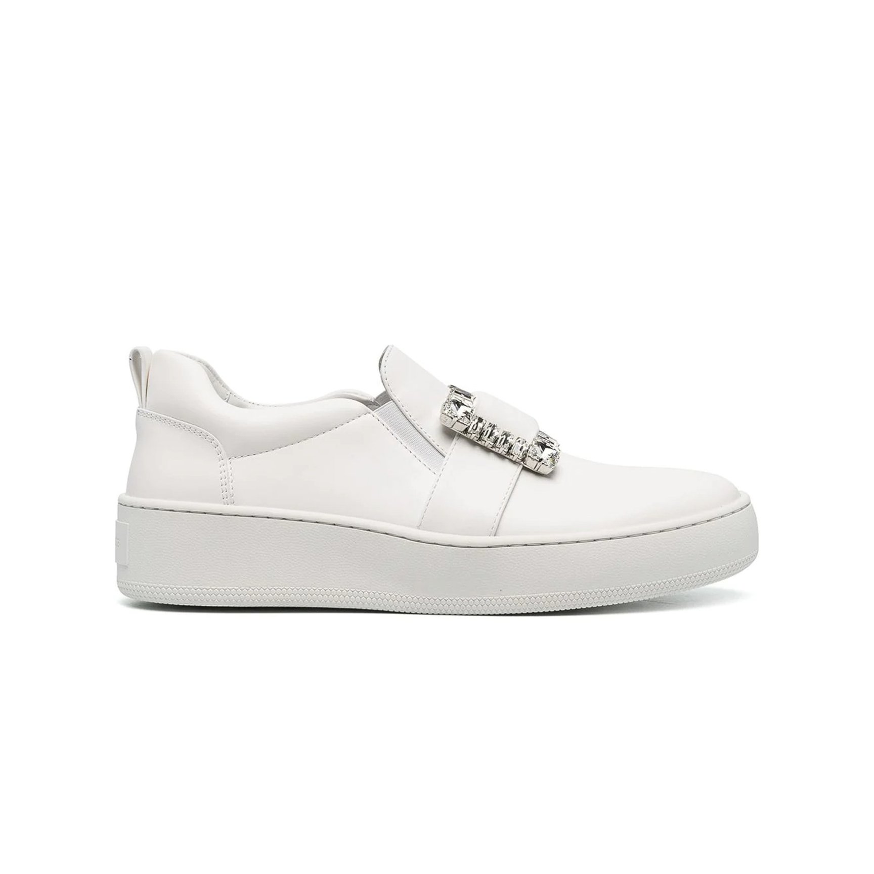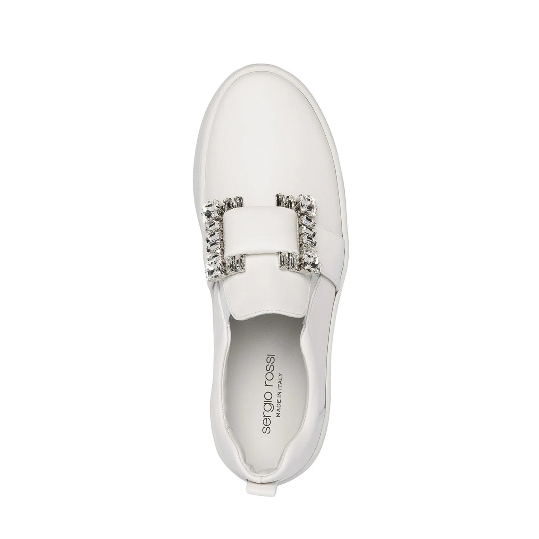 煌びやかなビジューバックルが目を引く、「セルジオ ロッシ(Sergio Rossi)」のリュクスなスニーカー。厚めのソールを採用したスリッポンタイプの一足は、ドレッシーパンプスのようなエレガントさと共に、快適な履き心地を実現します。
