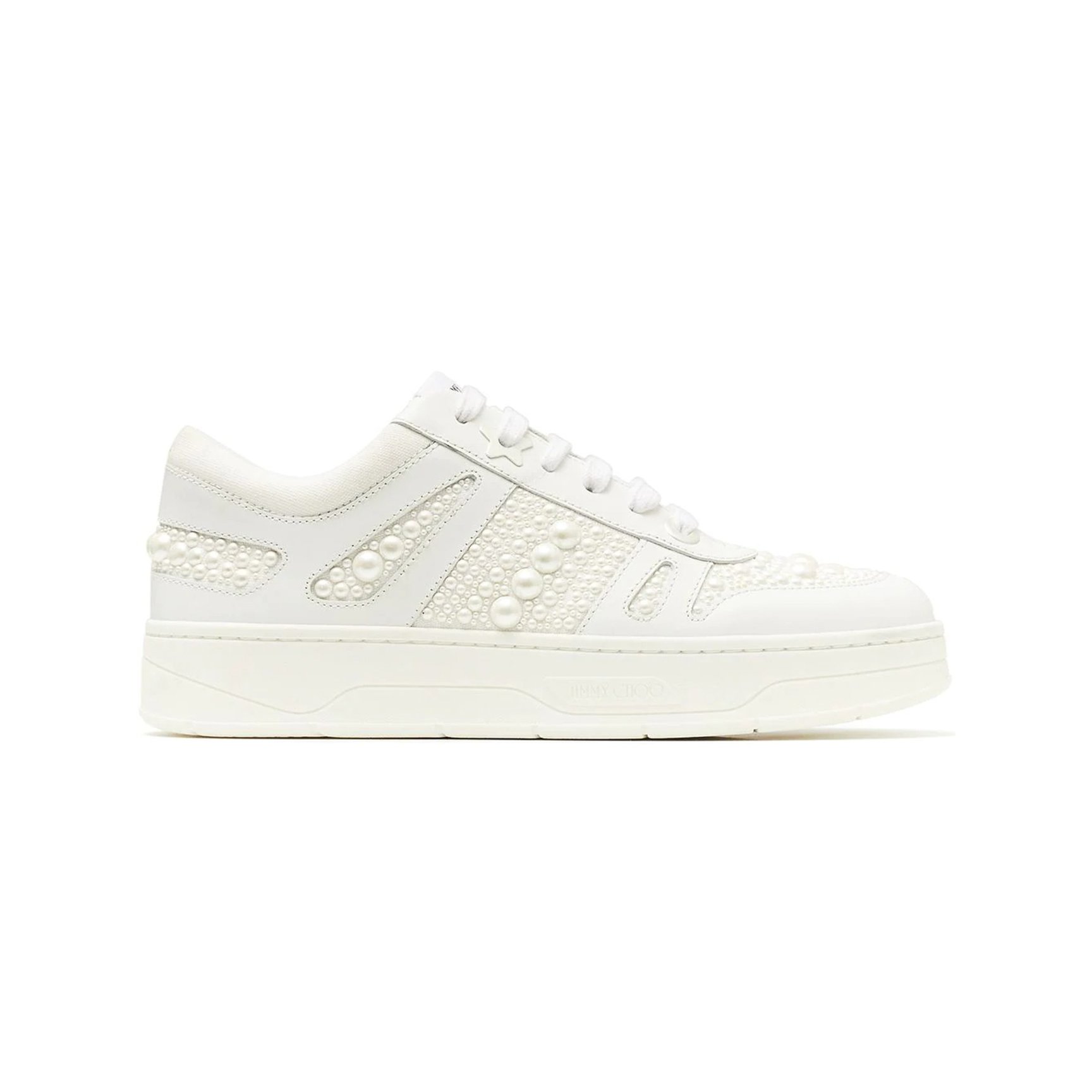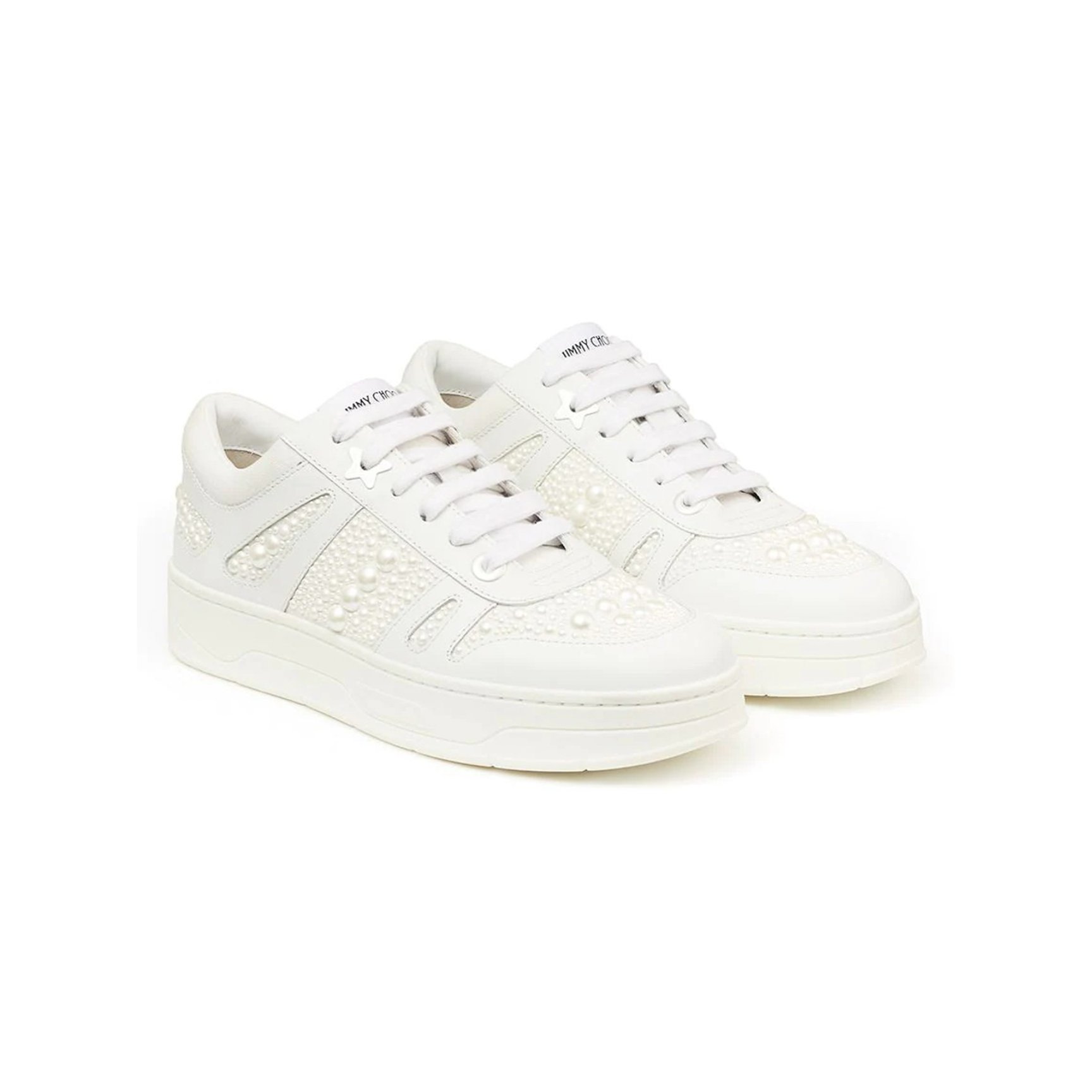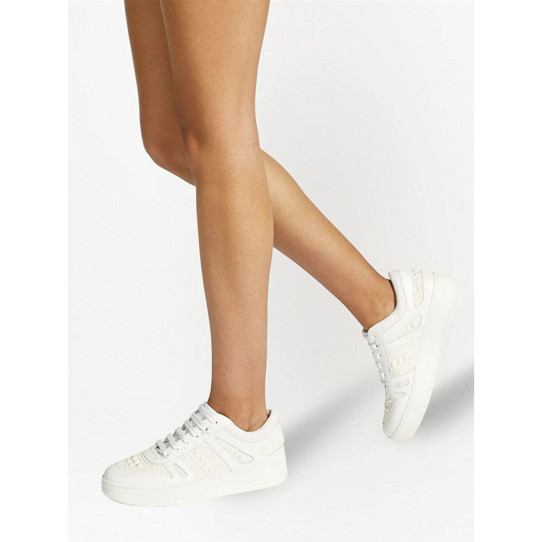 パールが敷き詰められたような、「ジミー チュウ(JIMMY CHOO)」のローカットスニーカー。オールホワイトの清楚なカラーデザインは、ウェディングを連想させるドラマティックなコーディネートを完成させます。
