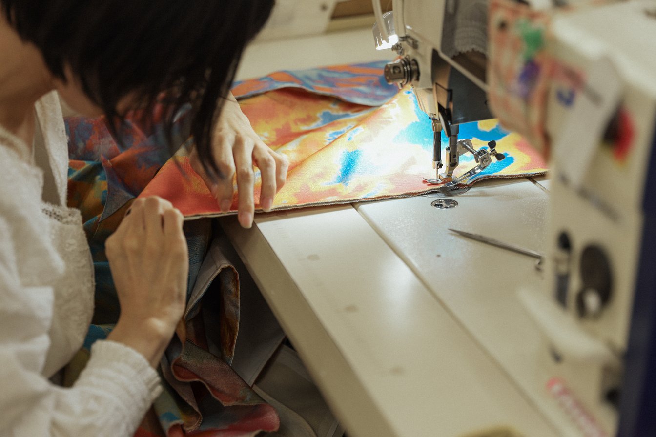 coconogacco生の作品をソーイングするファッションしらいしの職人