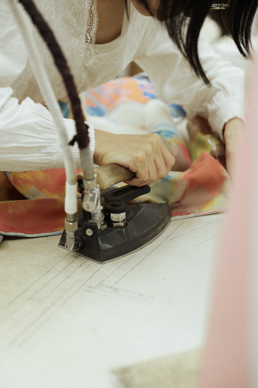coconogacco生の作品をアイロンがけするファッションしらいしの職人