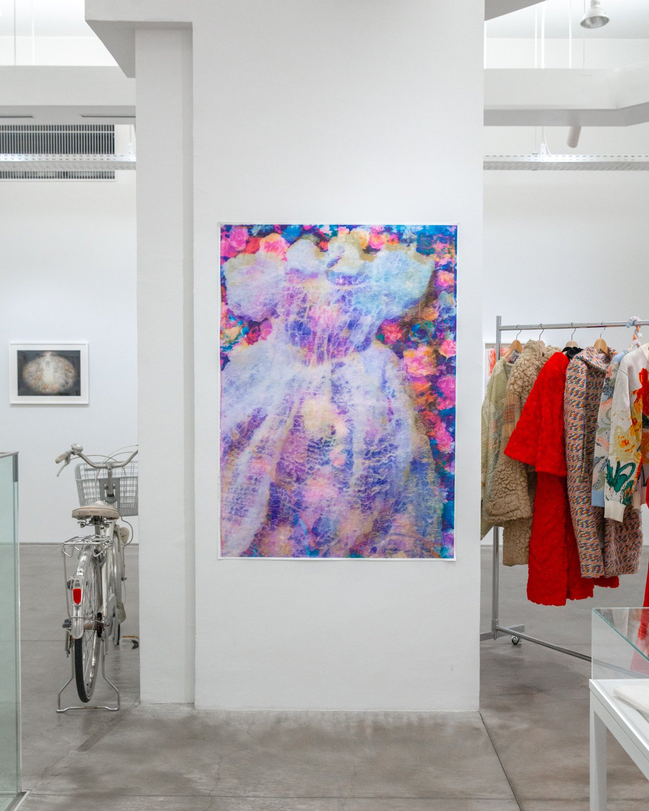 階段を下ると一転会場は暗がりとなり、2019年春夏コレクションの「魔女」が飛び、2016年秋冬コレクションの「物の怪」をテーマとしたルックが横たわる。ミイラや骸骨といった一見ダークな要素が見受けられるが、山縣が目指したのは神話的な存在の「人間味」を描くことだ。例えるならドラマ「奥さまは魔女」のサマンサのような茶目っ気のある存在。物の怪は、山縣氏と同じ鳥取県出身で2015年に亡くなった水木しげるにオマージュを捧げ、「ゲゲゲの鬼太郎」に登場する「明るく面白おかしい妖怪」として表現した。