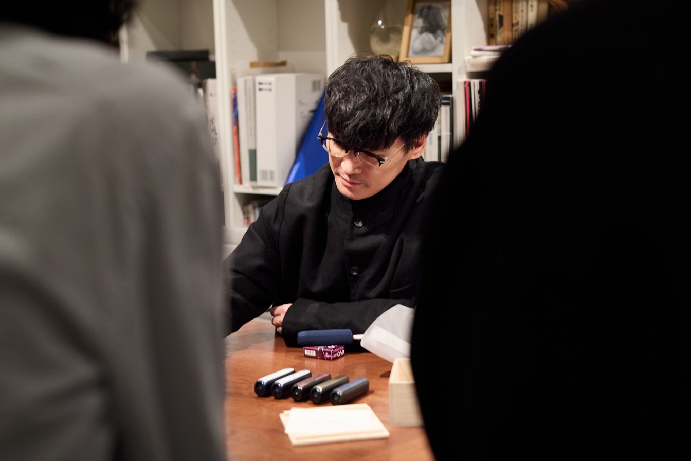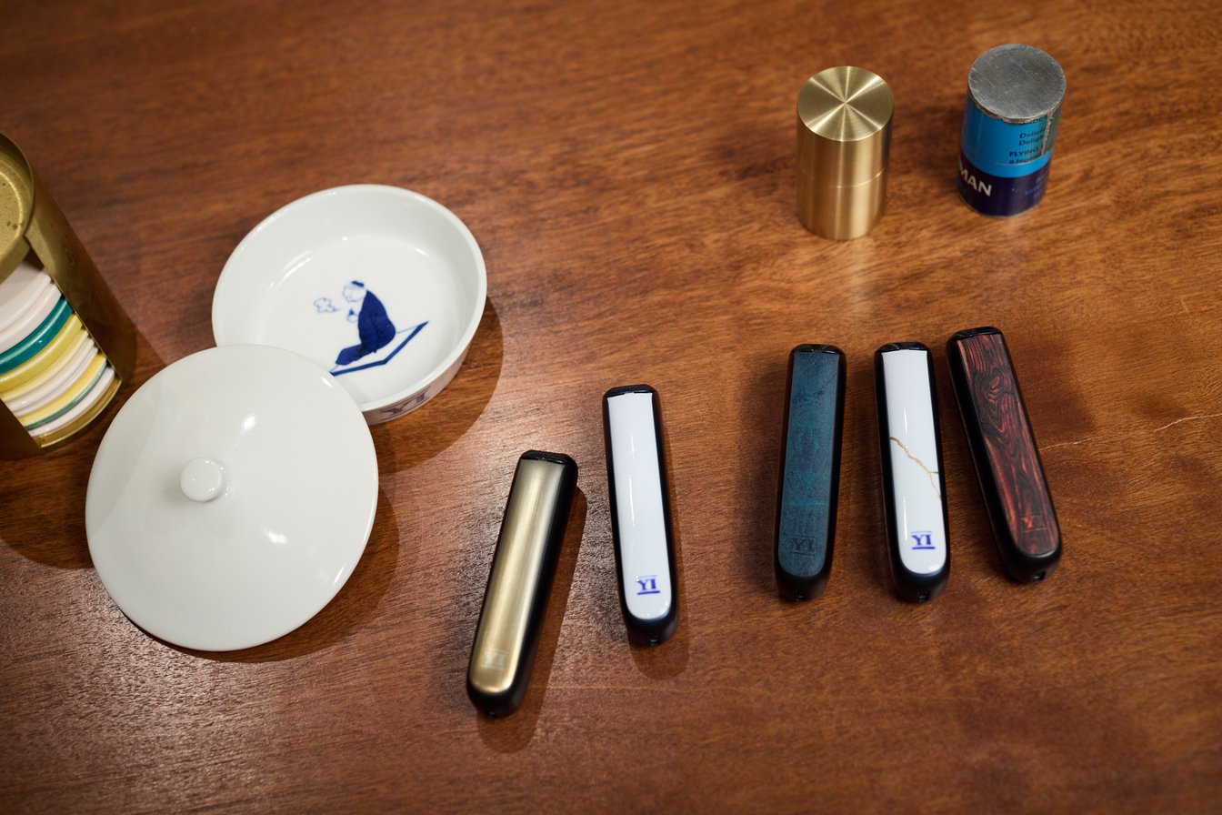 僕も今日、完成したものを初めて見たんですけど、可愛いですよね。九谷焼のスティックトレイは、歴史ある絵柄の中に「プルーム・オーラを吸っている人」が描き込まれていて、まさに上出くんらしい、伝統に現代的なアプローチをしたデザインになっているなと。真鍮茶筒のスティックケースも、今回特別に作ってもらいました。 実は以前から、八木さんや上出くんには無茶なオーダーをすることが度々あって、「プルームのスティック入れを作って欲しい」とお願いしていたんですよ(笑)。