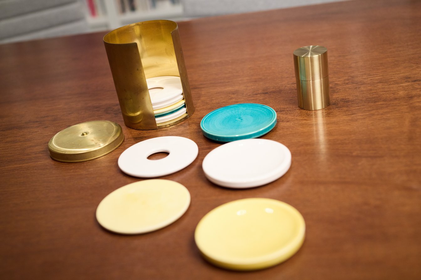 今ここにあるコースターセットも、実は八木さんにケース、上出くんに中のコースターを作ってもらった試作品なんです。「〇〇が欲しいから作って」「じゃあこういう形状にしようか」といった実験や遊びを日常的に繰り返していて。そういった試行錯誤が、今回のプロダクトにも繋がりました。真鍮の茶筒は使い続けると風合いが変化して味が出てくるから、それも楽しめると思います。