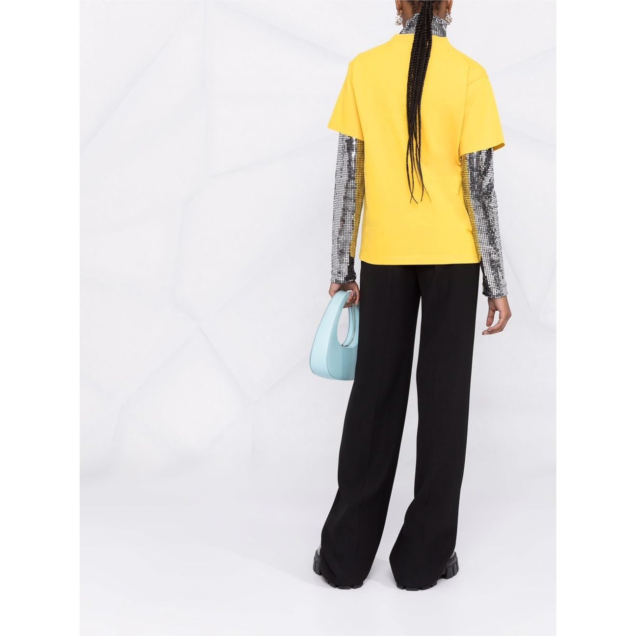 ヴィンテージファッションをイメージソースに、モダンに仕立てたアイテムを提案する「パロッシュ(P.A.R.O.S.H. )」。目が覚めるような鮮やかなイエローをまとったイージーパンツは、装飾を削ぐことでクリーンな印象に。ウエストがゴム仕様なのが嬉しいポイントです。