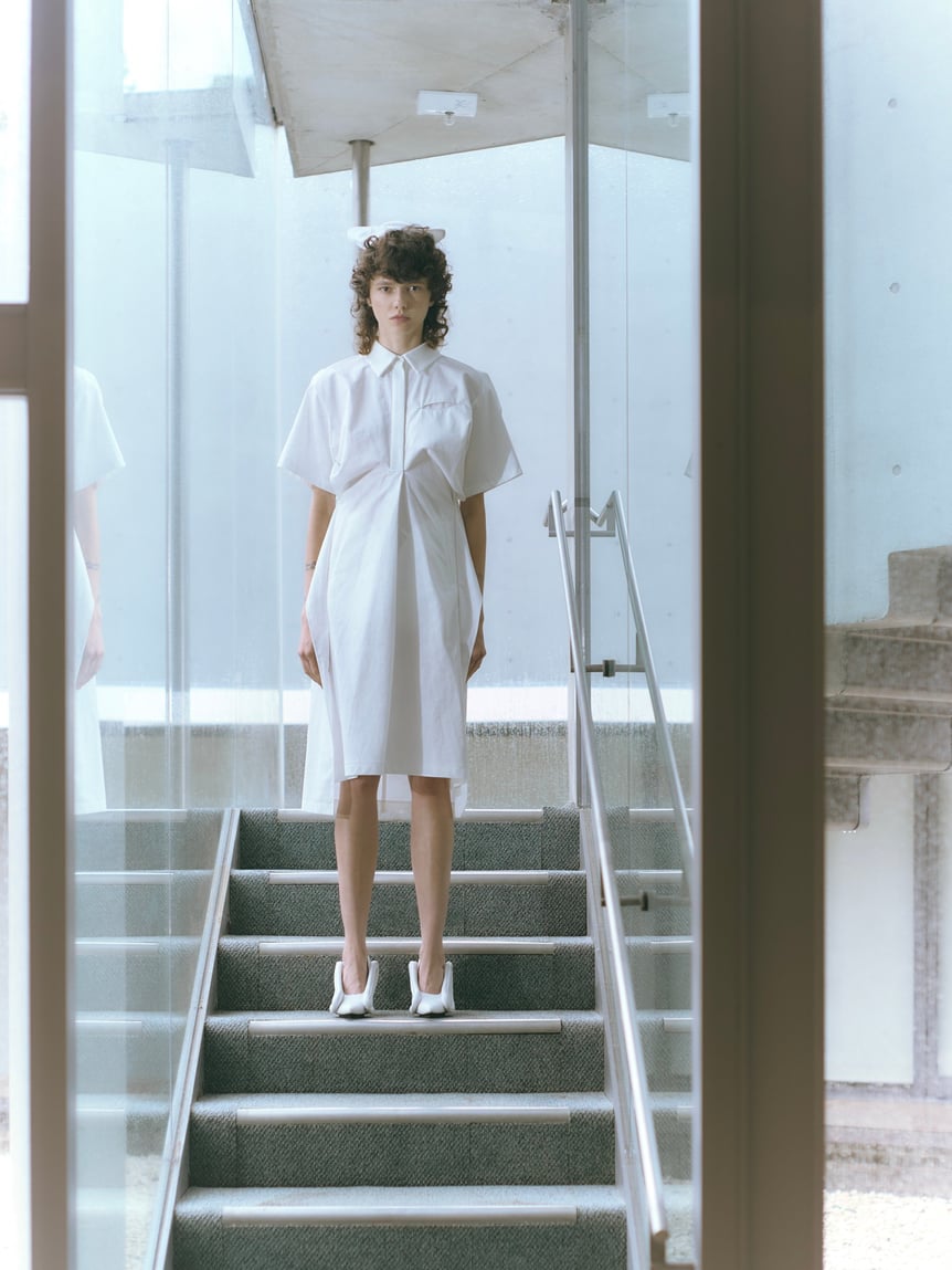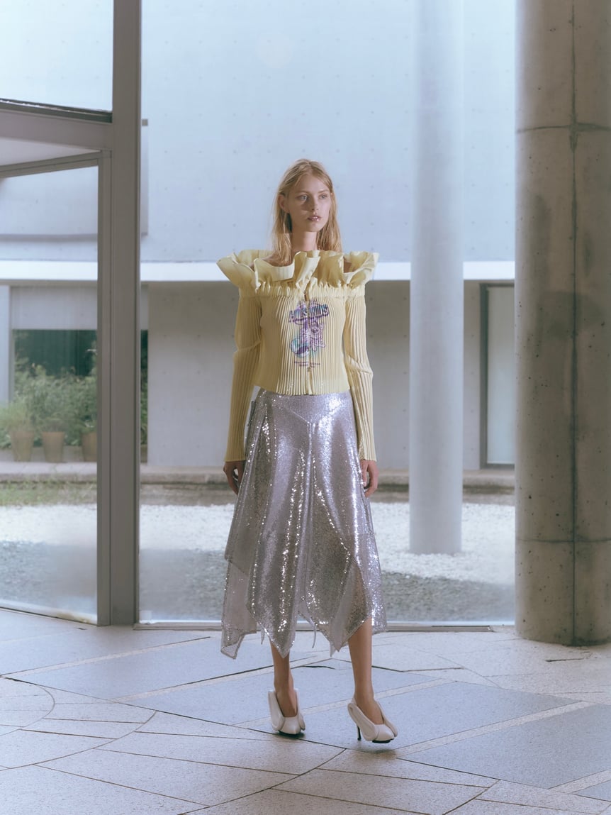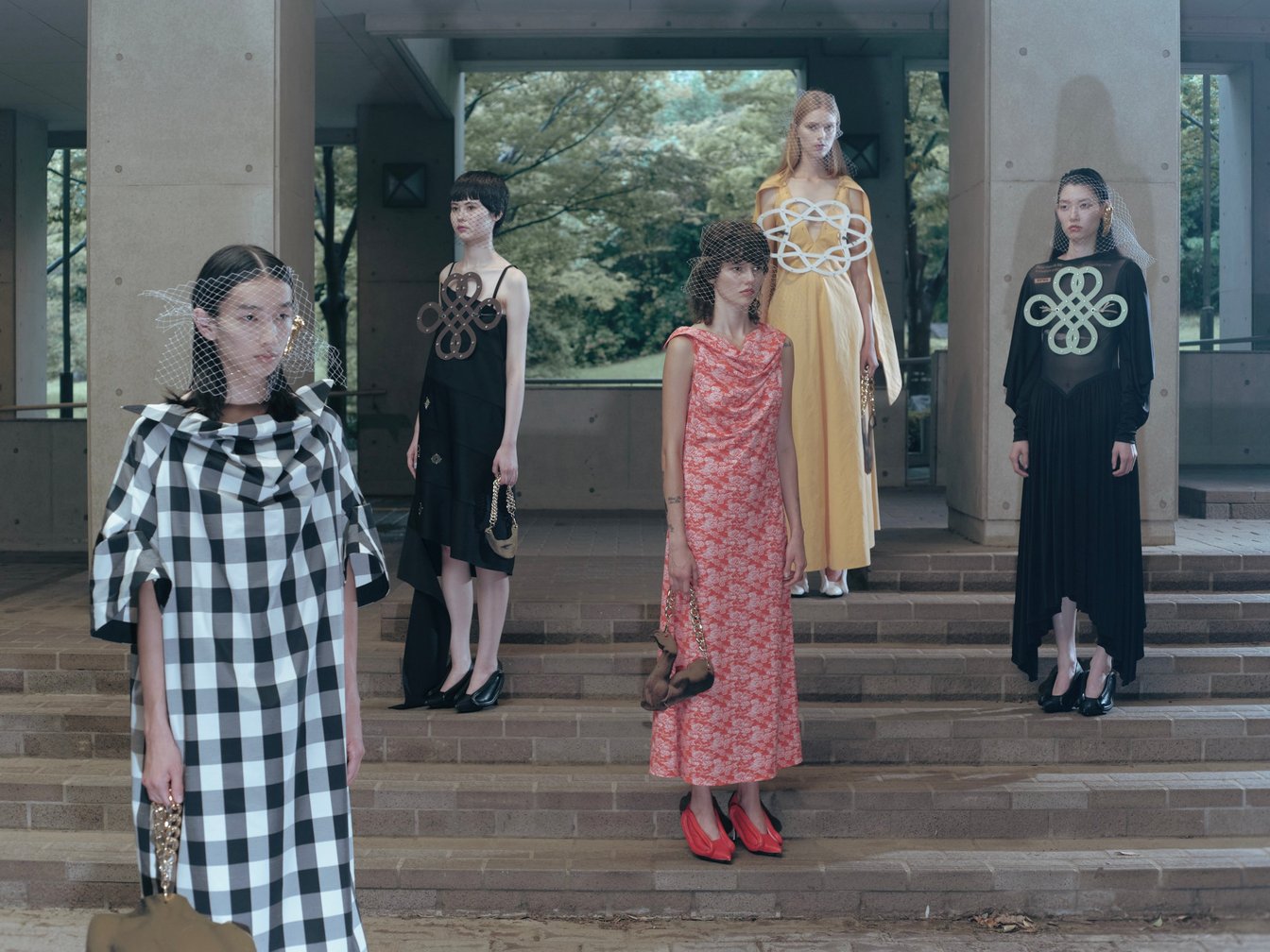 逆手にとってきた歴史もあるが、パリを中心とした欧州から見れば日本というだけでカウンターカルチャーに収斂(しゅうれん)されてしまう日本国内のファッションブランドにおいて、ヨウヘイオオノはより自由なクリエイションに挑む。ジャケットに代表される大野らしい曲線美のフォルムは今シーズンも健在。生地をつまみ、ドレープが入った鹿の子ポロシャツドレスや、花弁が咲いたように生地を重ねたミニスカート、襟口が鋭角に尖り、外衣トーガを着用した古代ローマ彫刻を思わせるドレープタンクトップなど、グローバルで見ても新鮮さを覚えるアイテム群が展示会で並ぶ。また、映画「箱男」のナース服から着想したドレス、ベトナムバッグの柄をイメージしたプリーツドレスなど、点在するインスピレーション源の中でも根底にヨウヘイオオノらしさがあるのは大野のパターンメイキングの手癖とカラーパレットセンスによるもの。