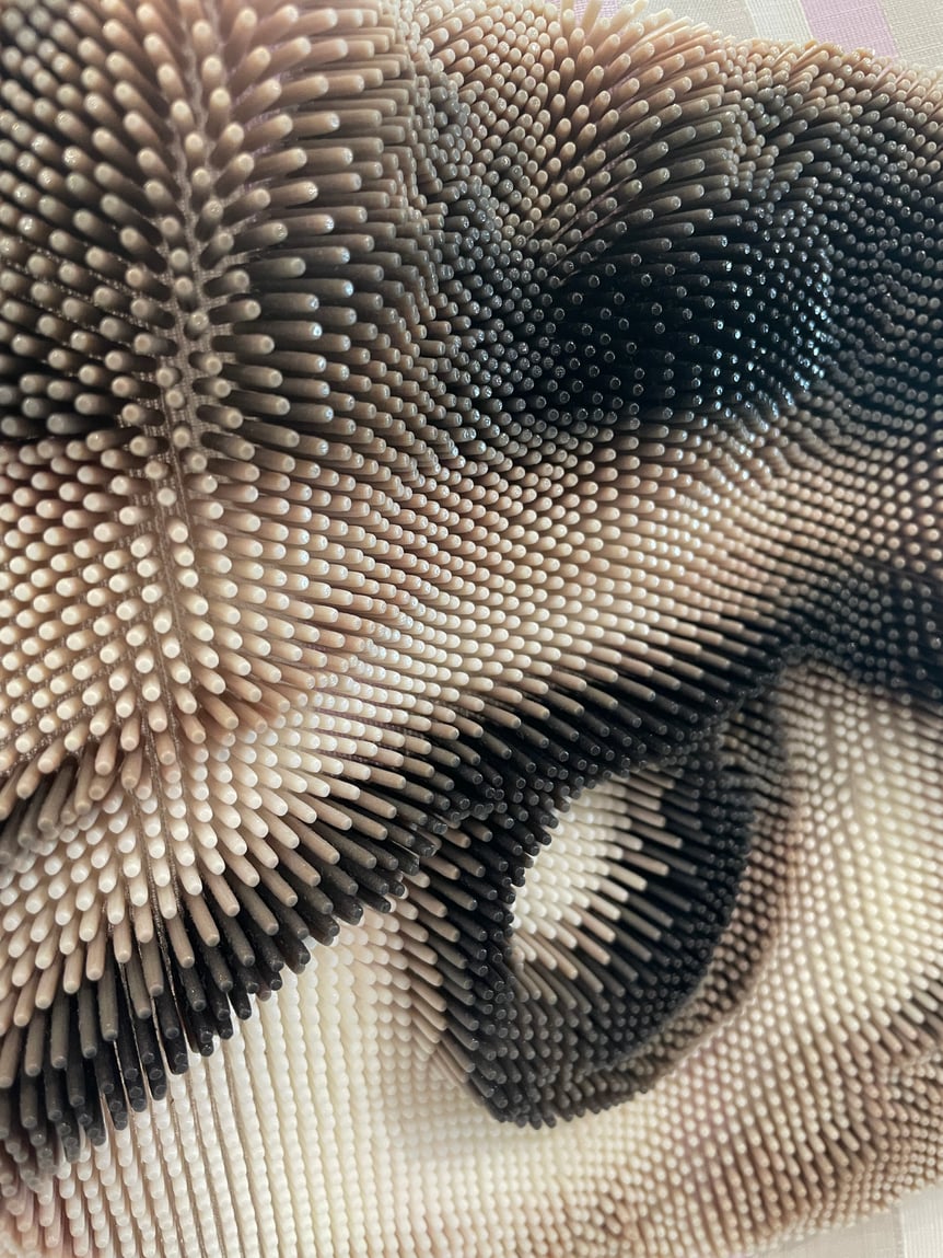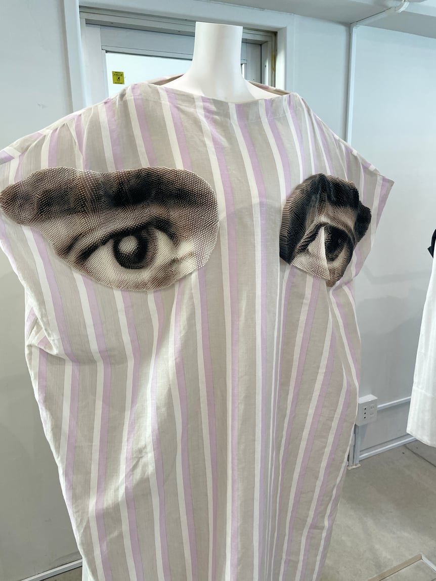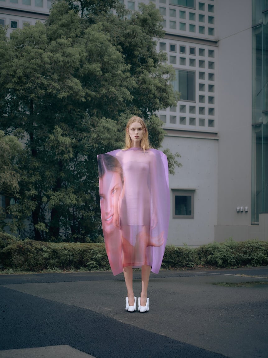 また3Dプリンタ専業メーカー ストラタシス・ジャパンと協業し、布地への「ダイレクト3Dプリント」の技術を活用したドレスを製作。2023年秋冬コレクションにも登場したカフカの目を3Dプリンタで出力したが、これは今回の2025年スプリングコレクションがヨウヘイオオノ10周年の節目のコレクションということで再登場させたという。なお、日本のファッションブランドがストラタシス・ジャパンの「ダイレクト3Dプリント」を活用したのは今回が初めて。