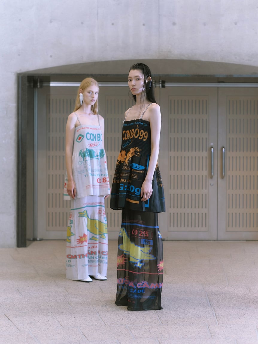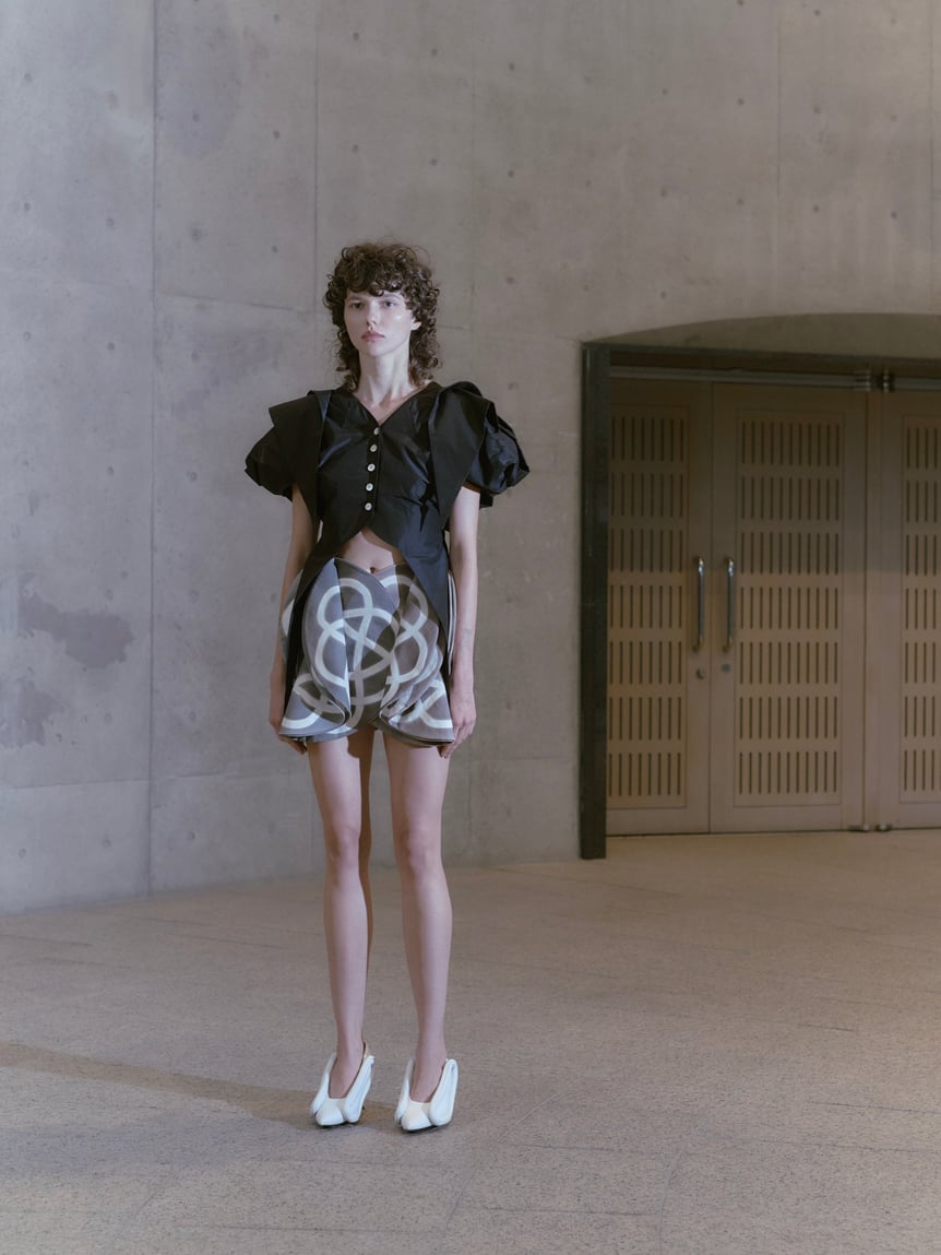 コレクションとは、その名の通り一つにまとめ上げること。ただ今シーズンは、点在したデザインソースをバラバラのままフラットに並べる。大野が手掛けた映画「箱男」の衣装や関西万博「住友館」のユニフォームに加え、大野が最近よく観るという黒沢清の「Chime」をはじめとするホラー映画、ベトナム......脈絡のなさは見るものにとって分かりにくさに繋がるが、分かりやすさが主流の現代において、大野は敢えて”はてな”がつくことを肯定する。恐怖と芸術の定義が近似していることにもあるように、分かりにくさ=怖さの体現は、ついぞ見る機会を失ったアバンギャルドを追い求める作業となった。
