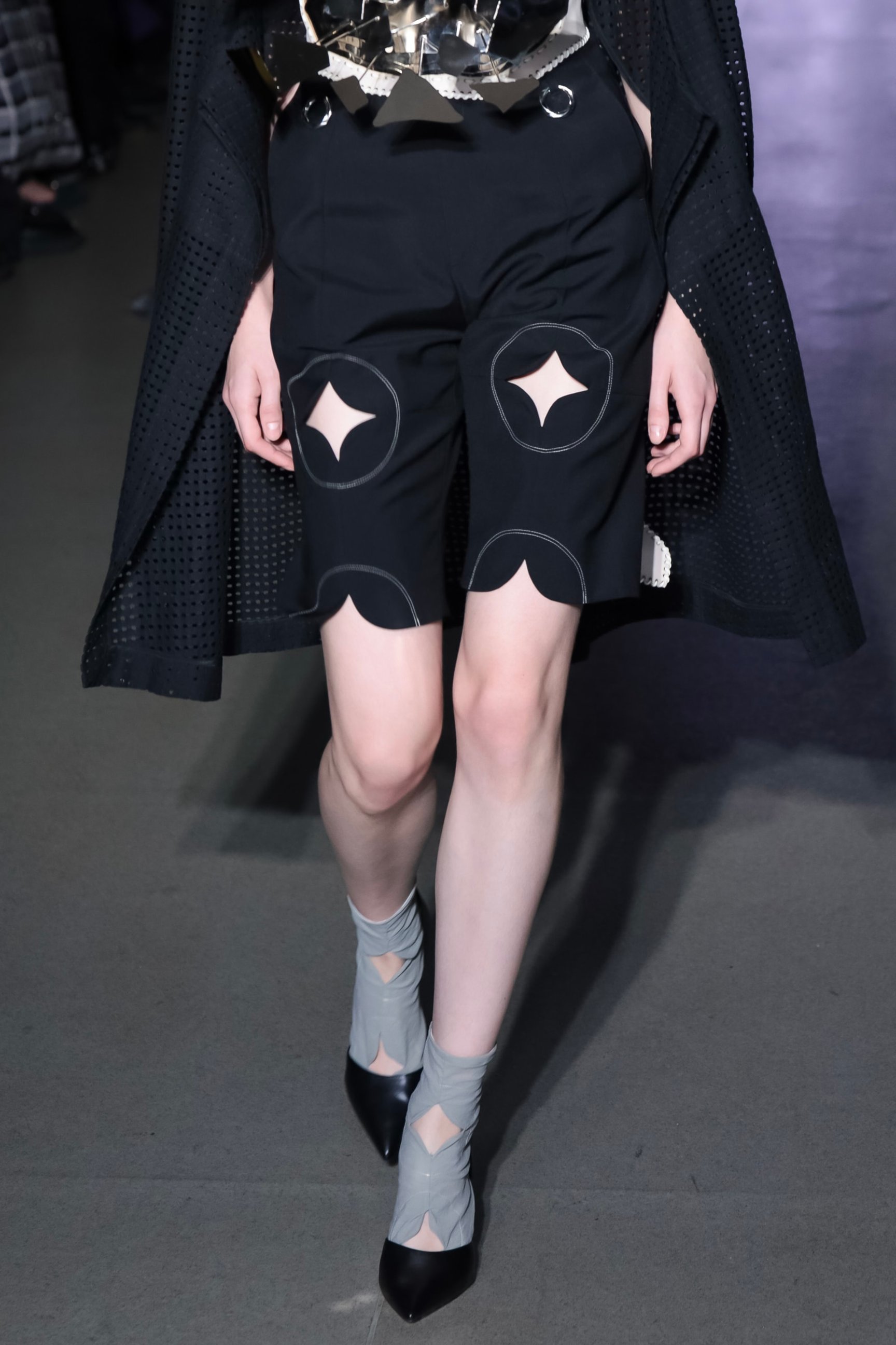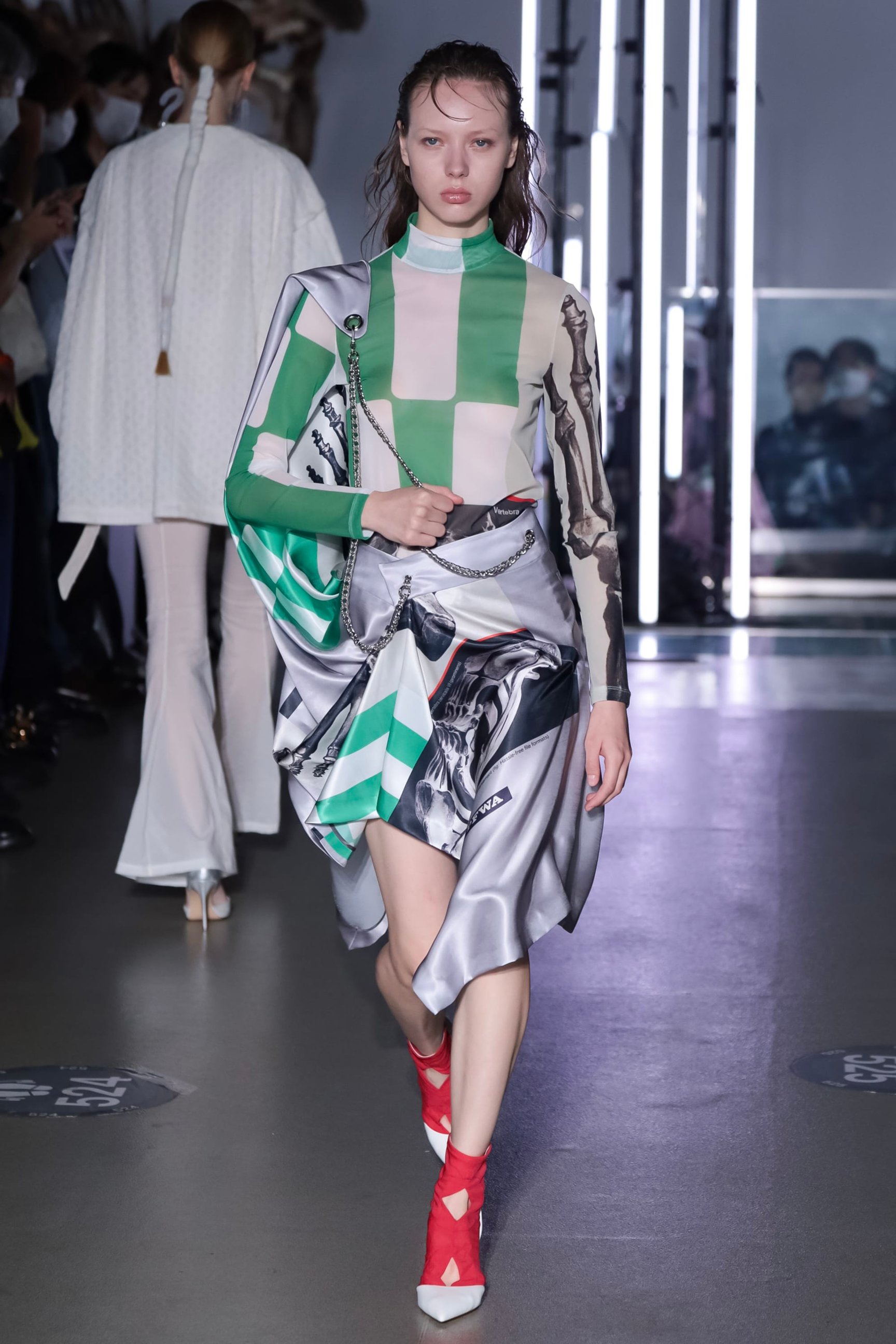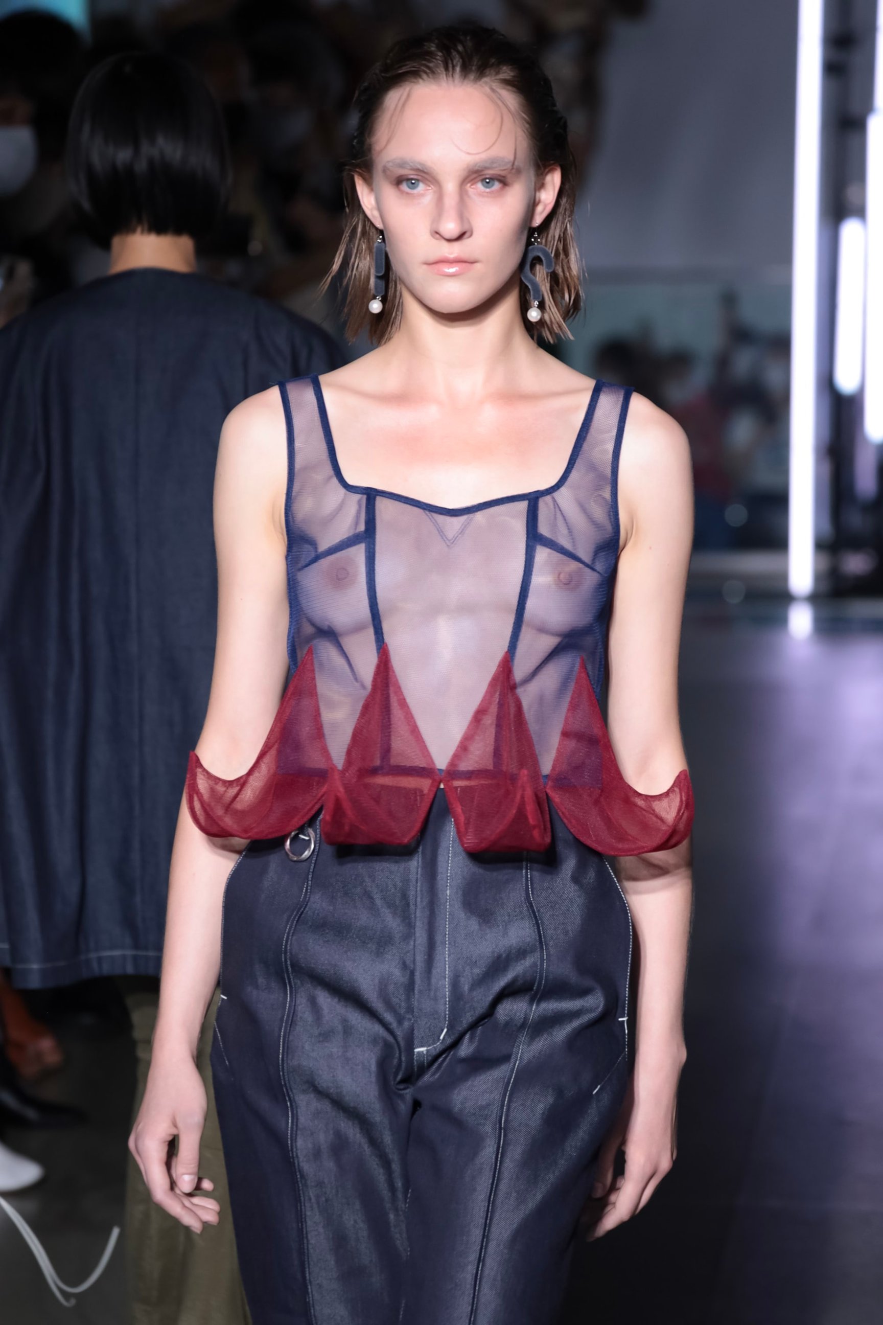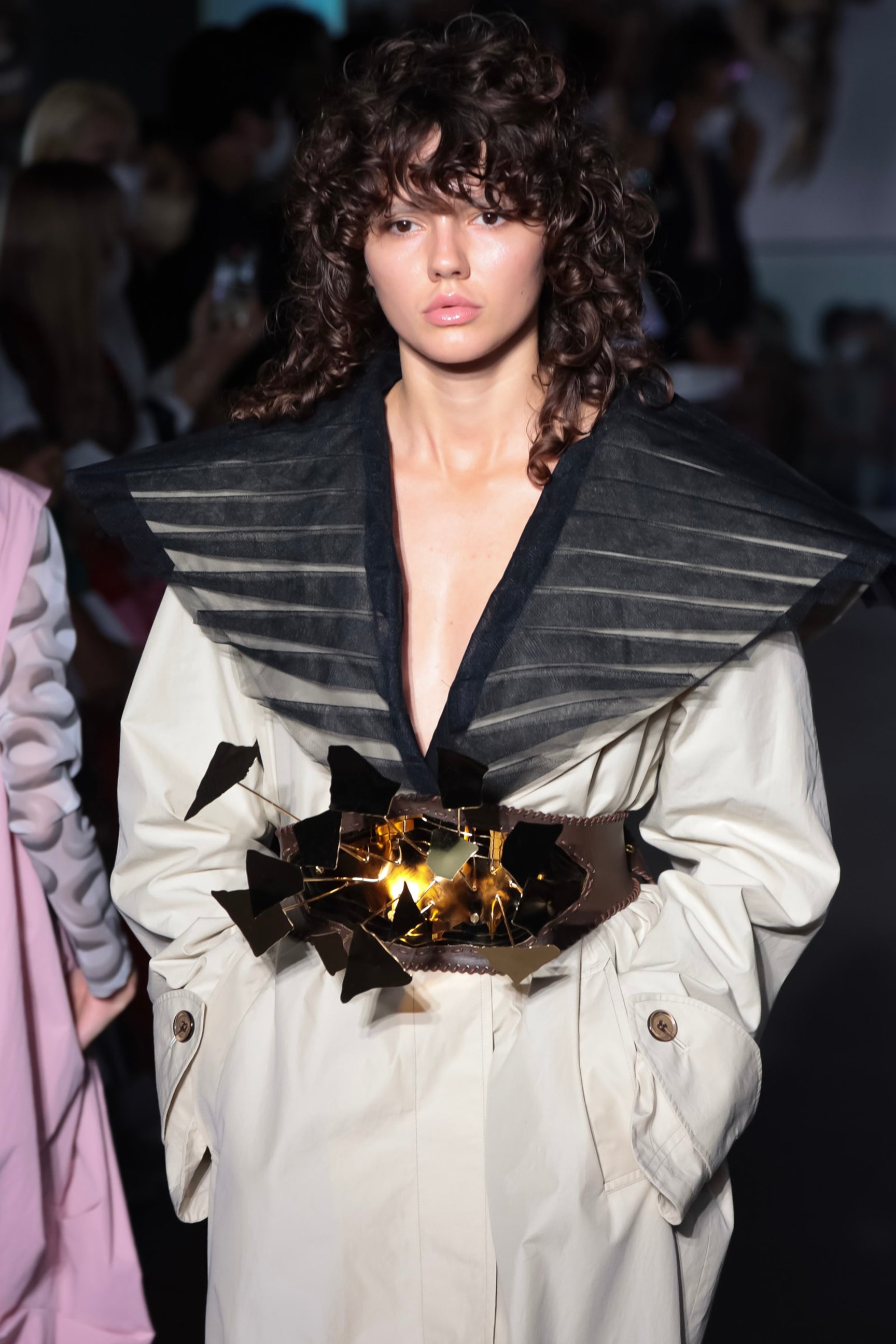 西洋服装史を想起させる大ぶりな襟を採用したコートをはじめ、タコウィンナーから着想したという角が裾にあしらわれたシースルートップス、宇宙をイメージした十字のカッティングディテール、椎骨を意味する英単語「vertebra」と骨のイラストがプリントされたカットソー、スカートの裾をドレープさせてタスキのように肩から背負う僧侶をイメージしたスーツスタイル、甲冑のように連なったディテールが特徴的なパンツなど、多種多様なものから造形のヒントを得たアイテムが披露された。タコウインナーから着想を得たディテールについては、反り具合にこだわり何度も試行錯誤したという。「素材や繊維を探求するデザイナーもいれば、僕にように裾の反り具合1つに固執するデザイナーもいる。それがファッションのおもしろさだと思う」と述べている。