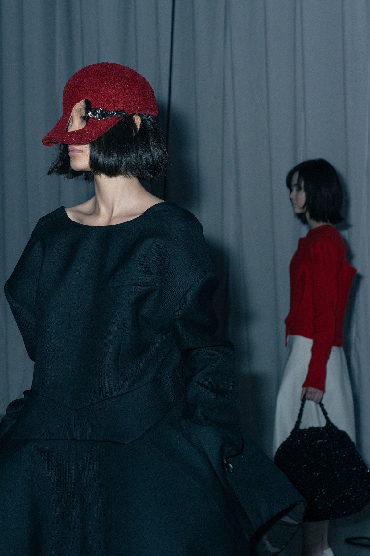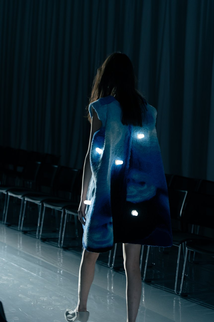 こうした「未知の美しさ」へのアプローチは、多岐にわたるクリエイターやアーティストとの協業によってさらに純度を高めている。日本画家 森夕香が描いた「実在しない色のパンジー」が連なるドレス、帽子アトリエ「エイチ.エイティー(H.at)」による歪な穴の空いたウールフェルトキャップ、スリートレジャーズ(THREE TREASURES)とのスニーカー、ラグビーボールのようなフォルムを手編みで再現した「ラストフレーム(LASTFRAME)」のバッグ、そして「アズ フォー ミー(as for me)」による歪んだワイングラス型のガラスリング。さらに、杉⼭桜々による2人の女性の顔をモチーフにしたタフティングに電飾をあしらった“人間ランプ”のようなドレスや、無数の手鏡を散りばめフロッキー加工を施した台形型ドレスなど、インテリアの要素も散見された。