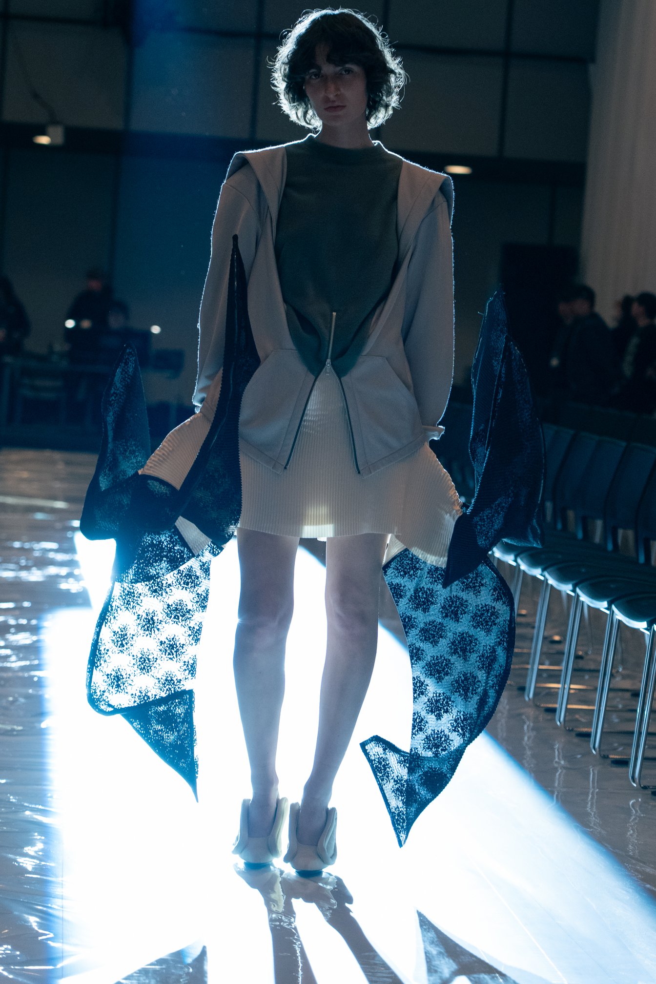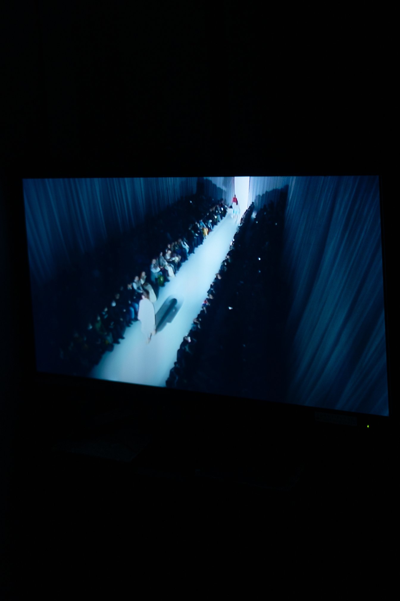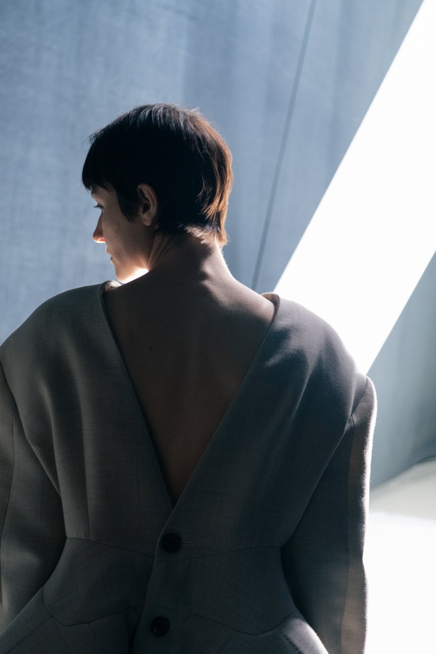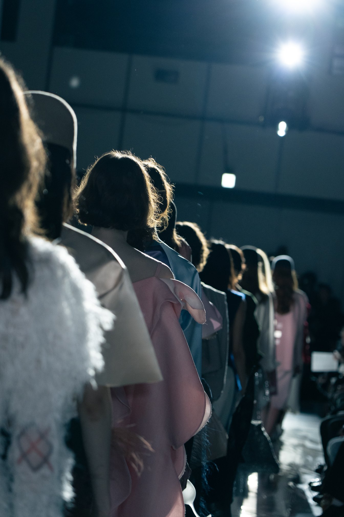 白いカーテンに囲まれ、客席と近い距離にランウェイが敷かれた会場が暗転すると、まるで新しい世界がそこに今誕生したかのように、一本の太く白い光の筋が天に向かって伸び、ショーが幕を開けた。