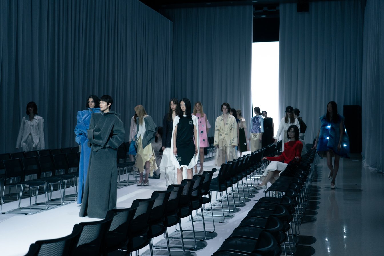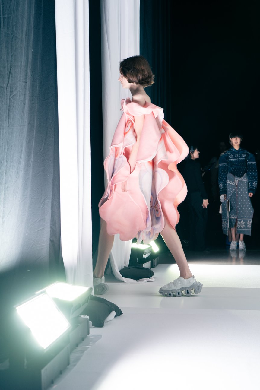 劇中歌「Mysteries of Love」が流れる中、ランウェイを歩く人々の装いは、空想と現実が入り混じり、あちこちに奇妙さが顔を覗かせる。そこには誰一人として“普通”の人がおらず、だからこそ多種多様な人々がそのままでそこにいることが許されるような、ユートピア的な包容力が感じられた。これは「ファッションは、論理の枠にはまり切れない人間だからこそ抱える矛盾や不条理に寄り添い、肯定してくれるもの」だと話す大野自身の実感に裏打ちされた、ファッションが作りうる一つの“理想宮”の姿なのかもしれない。