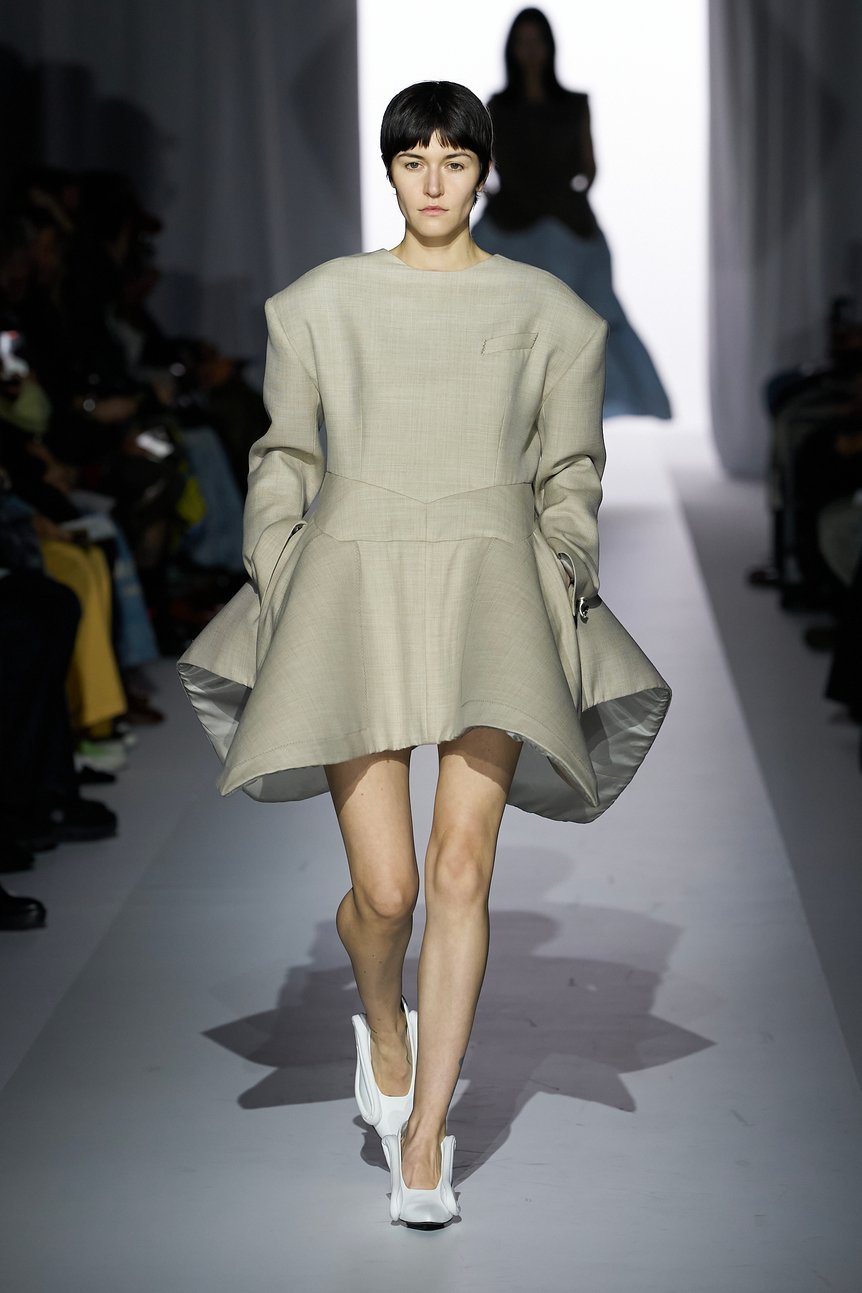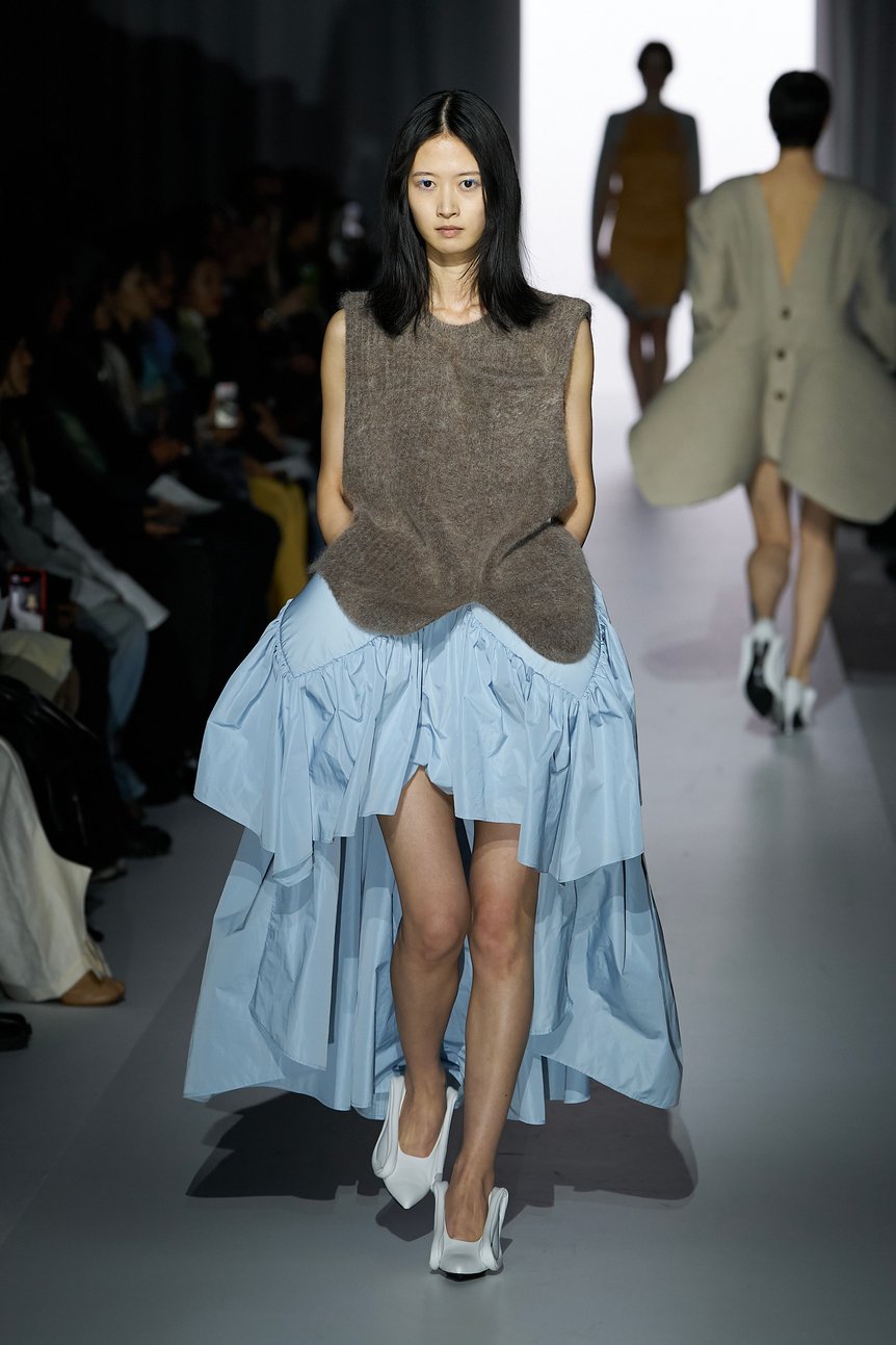 今季のコレクションを象徴するのは、やや非現実的で奇妙とさえ言えるフォルムのユニークさだ。ファーストルックの四つ葉のクローバーのような立体的な造形のベージュのミニドレスや、前短後長のフィッシュテールスカートは、大野が敬愛するデザイナー チャールズ・ジェームズ(Charles James)のパターンを再解釈したもの。同氏が手掛けるボール・ガウン(イヴニングドレス)のような彫刻的なエレガンスを感じさせながらも、ミニ丈やカジュアルな素材使い、スタイリングによって軽やかでモダンな印象を与えている。また、針金を用いたシャンデリアやファンの羽根のようにも見える装飾をあしらったプリーツ素材のスカートなど、歴代のヨウヘイオオノの中でもひときわ挑戦的なフォルムが目を引いた。