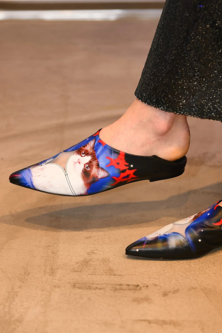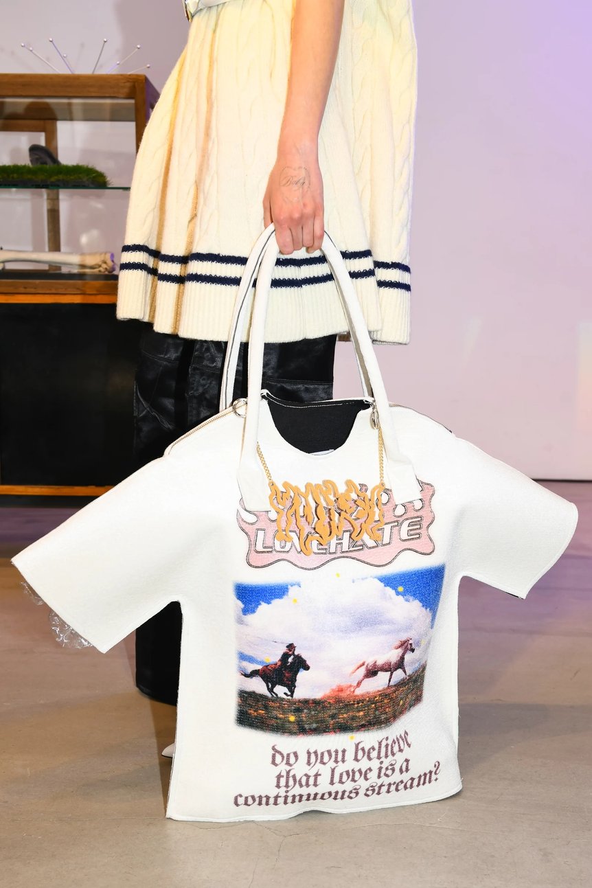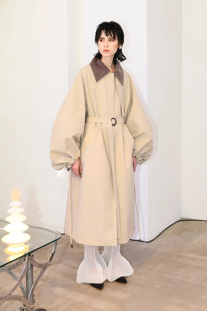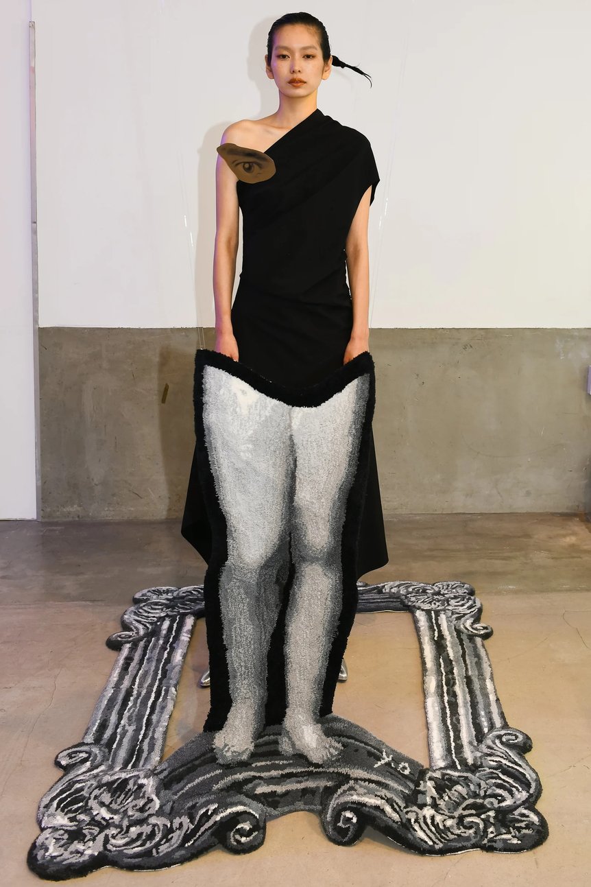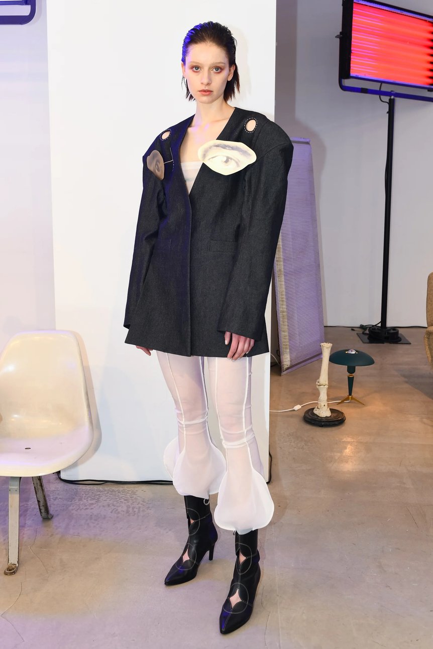 アイテムは、「平凡だがどこか愛おしいもの」から連想して、どこにでもありそうな古着を題材に製作したという。だからといって、偏屈なデザイナーの性分故、古着をそのままトレースするというありふれたアプローチは採用しない。あくまで古着はデザインのきっかけであり、見て、触れ、感じた印象、イメージを、彼がこれまで更新し続けてきたクリエイションで捉え直す。バンドTから着想を得たオリジナルグラッフィックのトートバッグはその最たるものだ。また、ビショップ・スリーブでコーデュロイの襟がついたコートに裾が花びらのように広がるシースルーパンツの組み合わせといったフォルムの斬新さは健在で、目のバッジを付けたジャケットでコレクションに違和感を与え、人の足を描いたトロンプ=ルイユ効果のあるラグの前にモデルを立たせたルックは、大野の遊び心を存分に反映させている。