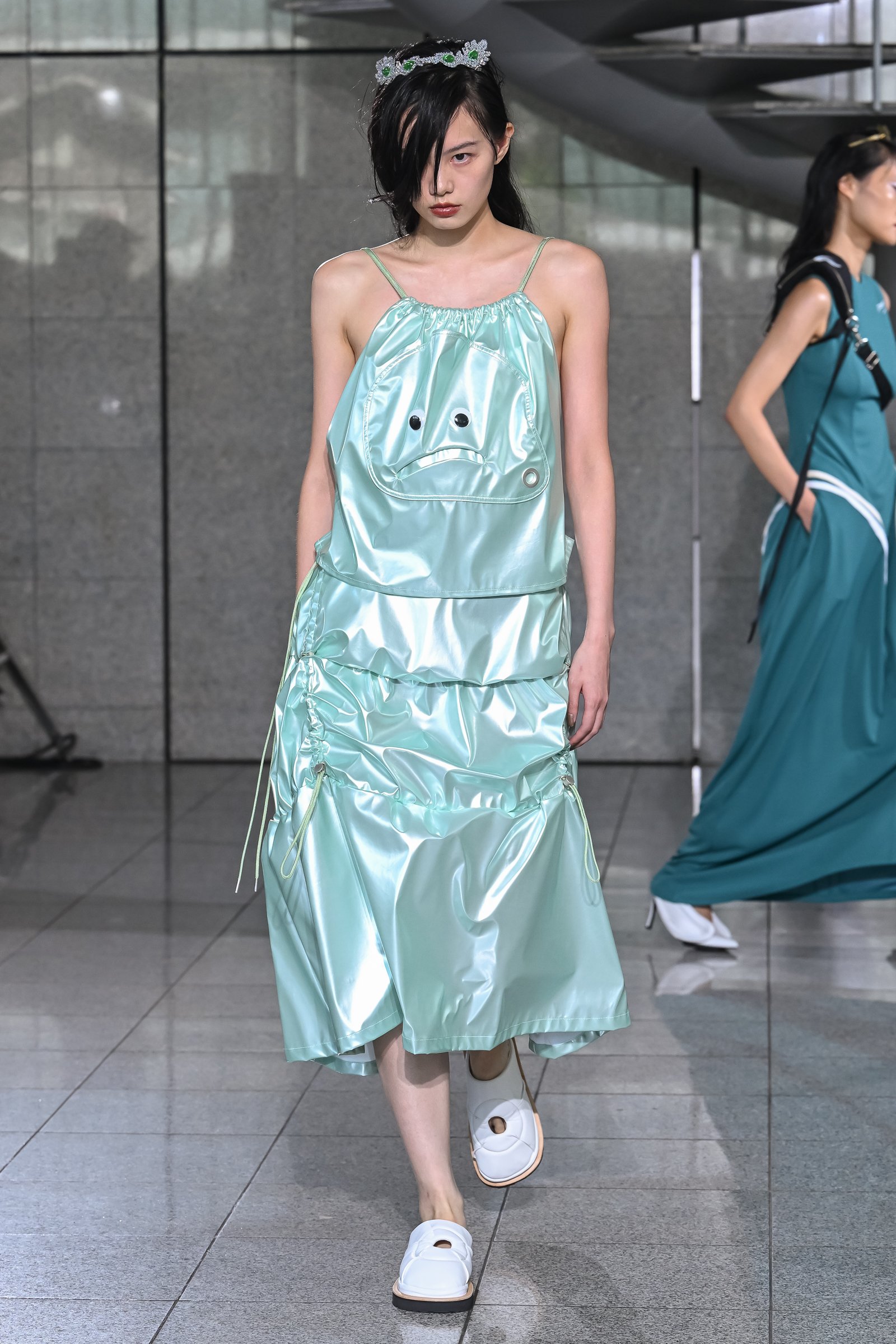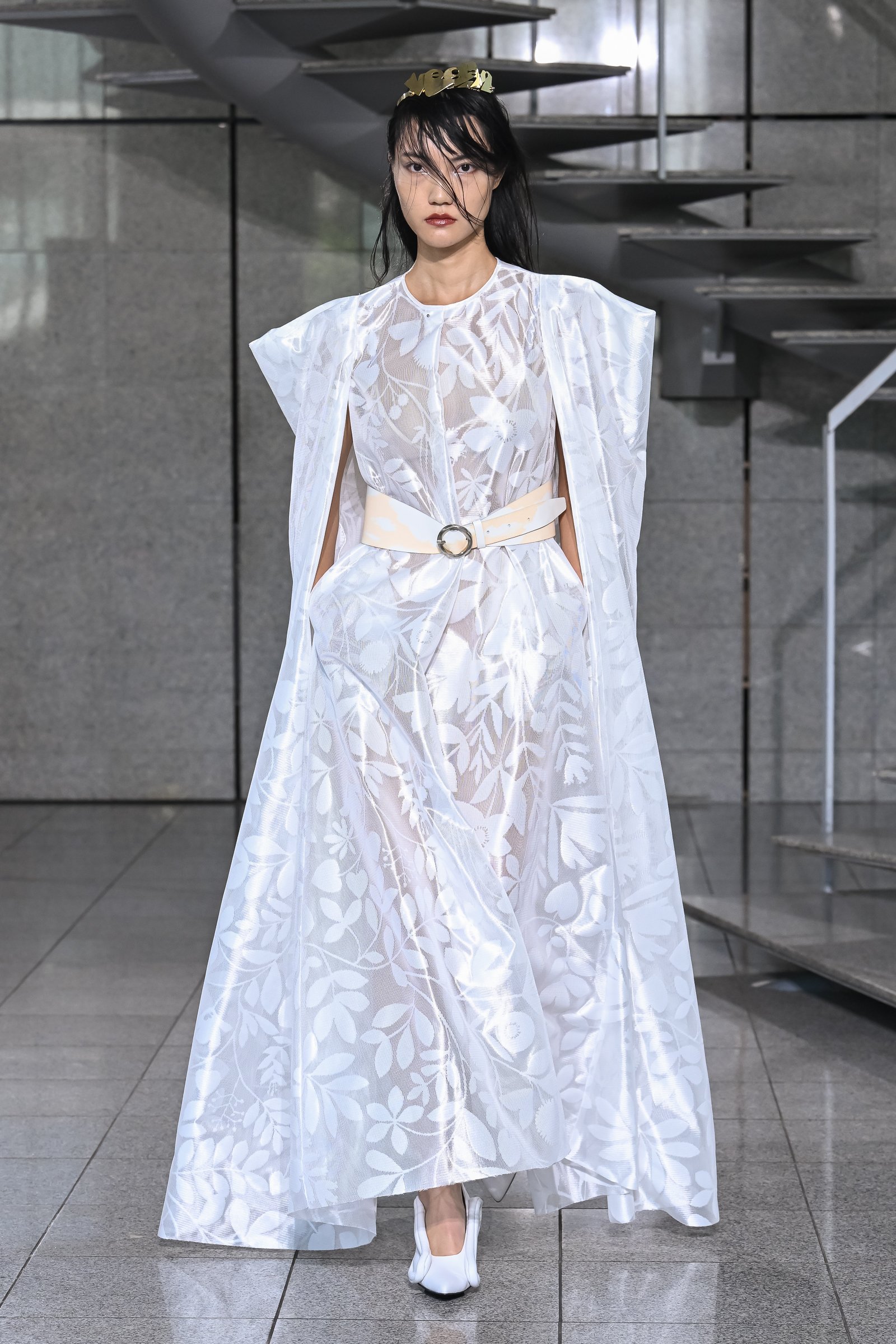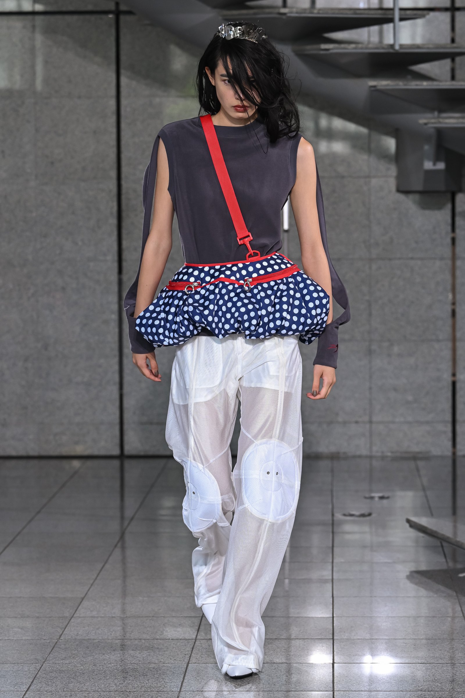 ボトムがラグビーボールのようになったワンピースはヨウヘイオオノの新しいアプローチ。これまで肩周りの構築的なシルエットとシャープなウエスト周りが特徴的なジャケットなど、実用性を備えた新しいフォルムを追求してきたが、打って変わって身体から距離をとった過剰なデザインで、既視感なきフォルムを完成させる。チープさを感じさせるドット柄やカーテン風のドレスなど、実家を連想させるモチーフは要所に散りばめられた。チープなものやよくわからないものが混在するにも関わらず、品性を担保できているこのバランス感覚は、大野の特筆すべき才能の一つだろう。