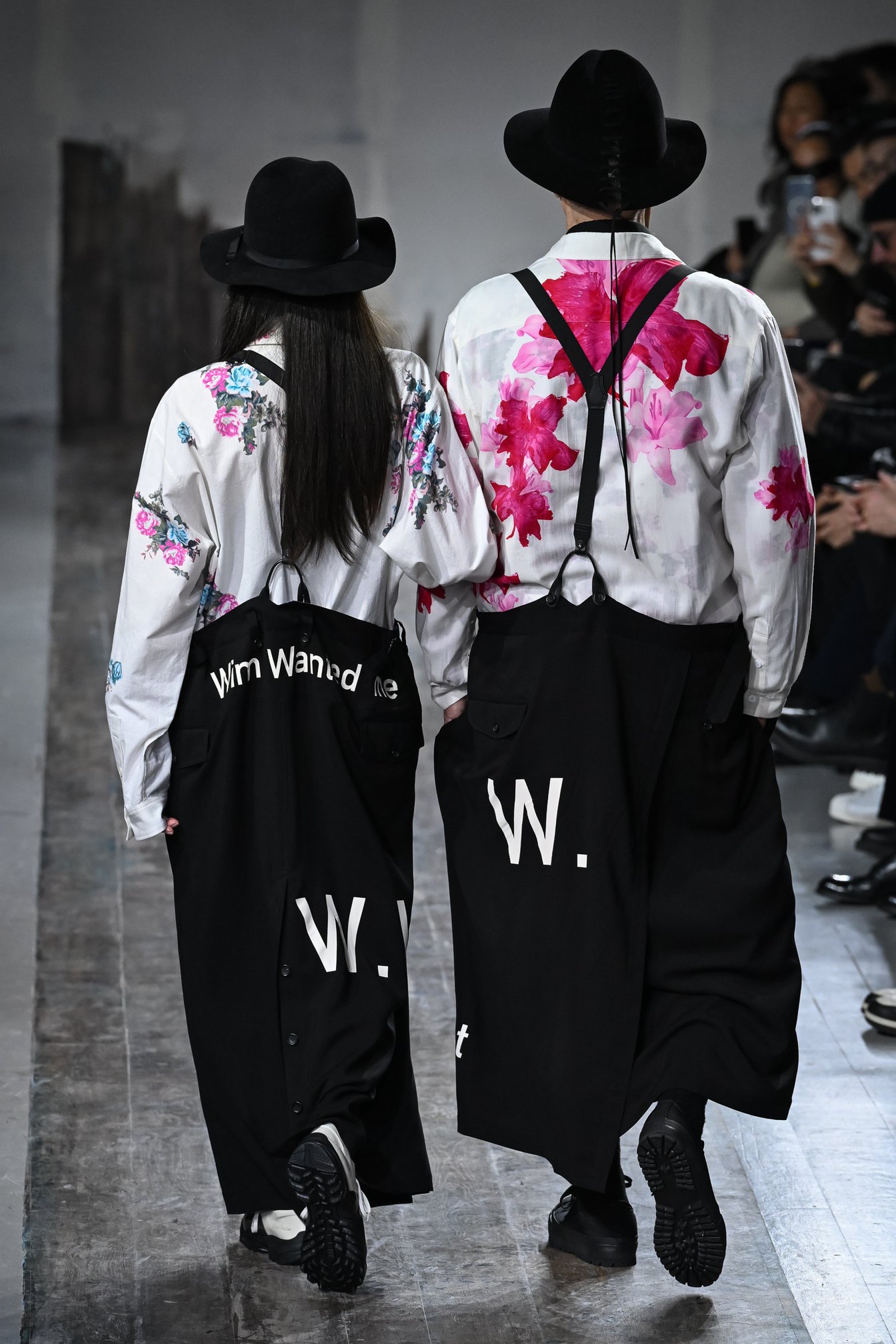 なお、ランウェイモデルに女性が起用されること自体が珍しいが、彼女らが着用している服はスカートなども含めてヨウジヤマモト プールオムとして展開されるという。ラストルックを飾った2人の揃いのボトムスには、「Wim Wanted me」や頭文字の「W.W.」といったユニークなワードが踊っていた。