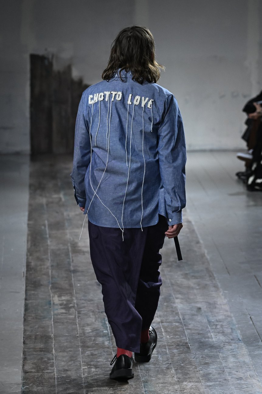 ショーで着用していたのは、テキストの刺繍が施されたセットアップや、アウトドアテイストのカジュアルなスタイル。シャンブレーシャツの背中の「CHOTTO LOVE」というウィットの効いた刺繍が目を引いた。