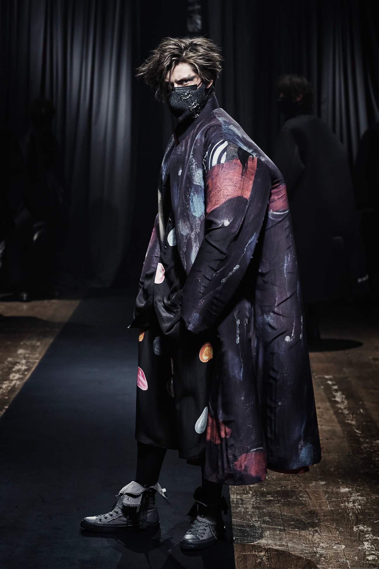 2021-22年秋冬の「ヨウジヤマモト プールオム(Yohji Yamamoto POUR HOMME)」は、ステートメントを背負い、いつも以上にパンクの匂いがする強い服を並べた。目新しいのはフックを装飾として使うデザイン。さらには、装飾品としてのマスクの新しい可能性を提示している。