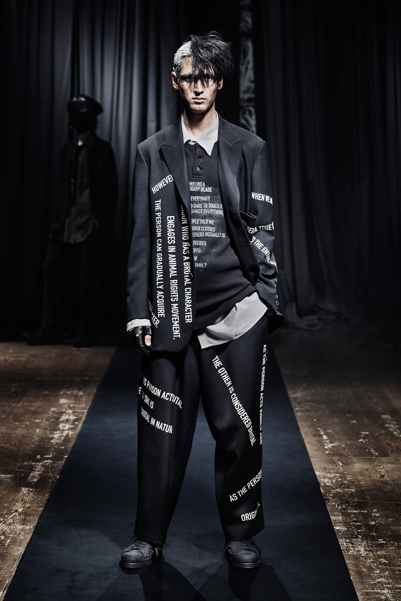 シンプルなテーラードスーツは、散りばめられたステートメントの存在感が際立っている。ここ数シーズンは手書きの日本語の文字が多く使われてきたが、今シーズンはゴシック体の英文がメイン。唯一の日本語のネクタイ(「引責辞任」、「適応障害」)もゴシック体だから、よりストレートに文字が伝わってくる印象を受ける。