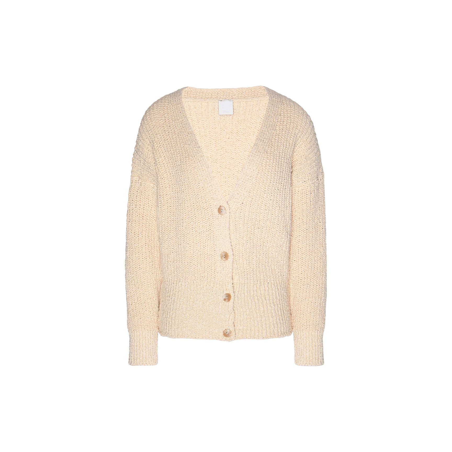ピュアコットンのループヤーンで編み上げられた素朴な味わいのあるカーディガン。ドロップショルダーですが、着丈はクロップド気味なのでほっこりすぎず程よく体にもフィットします。中に明るめの色のタートルネックなどを合わせても良さそう。