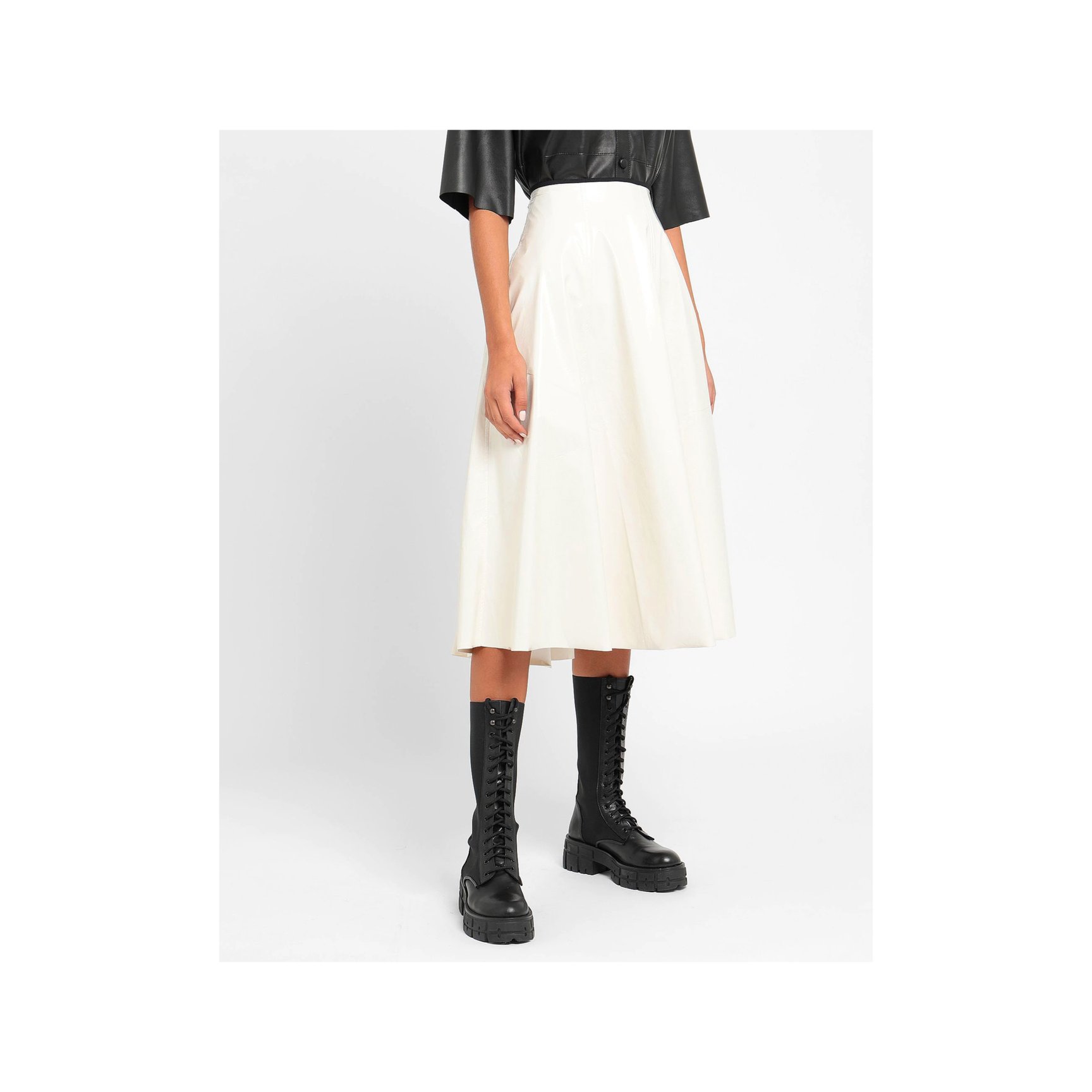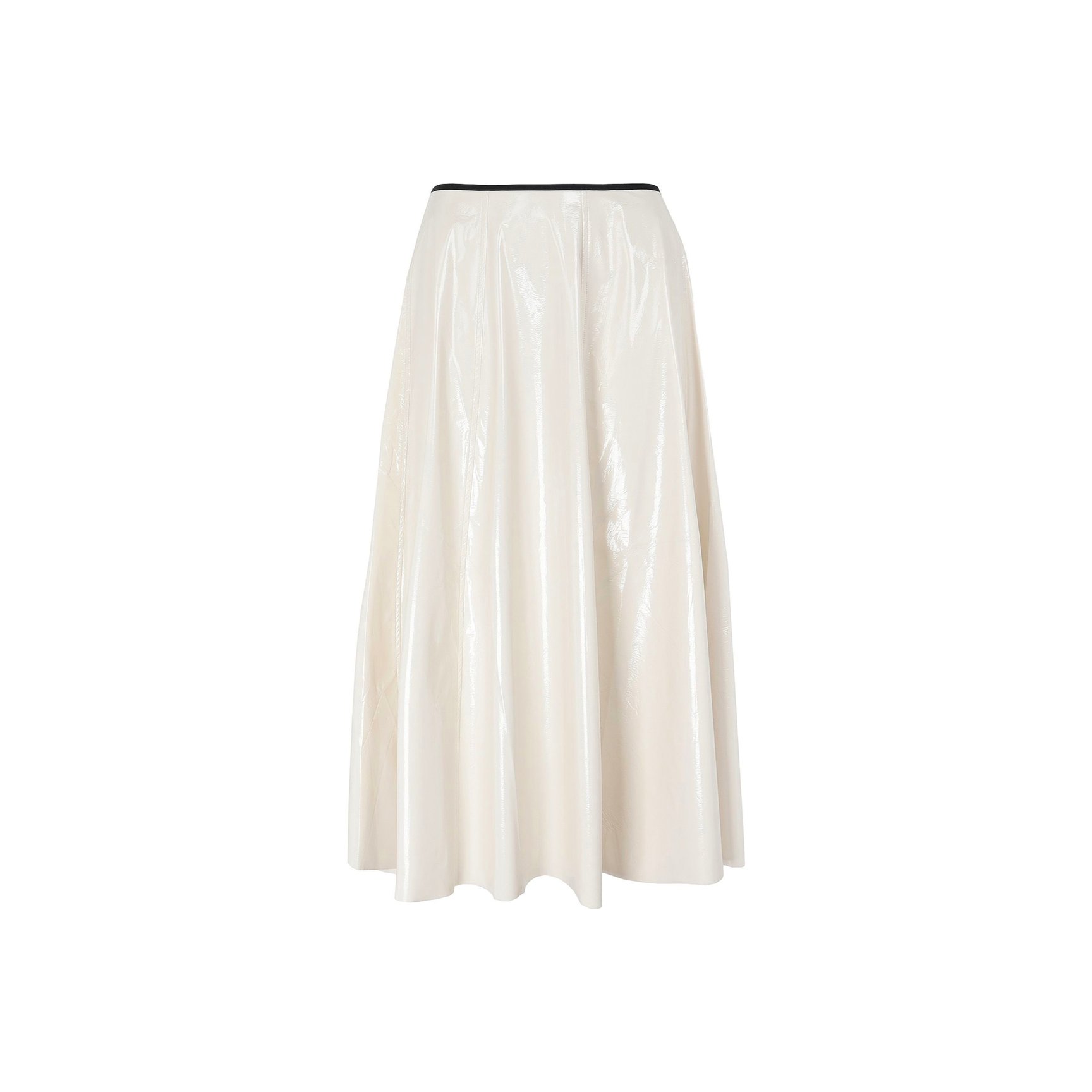 エナメル加工がモード感を醸し出すホワイトのミディスカート。白黒のモノクロコーデで重宝するほか、光沢がある素材でコーデにエッジを加えてくれます。