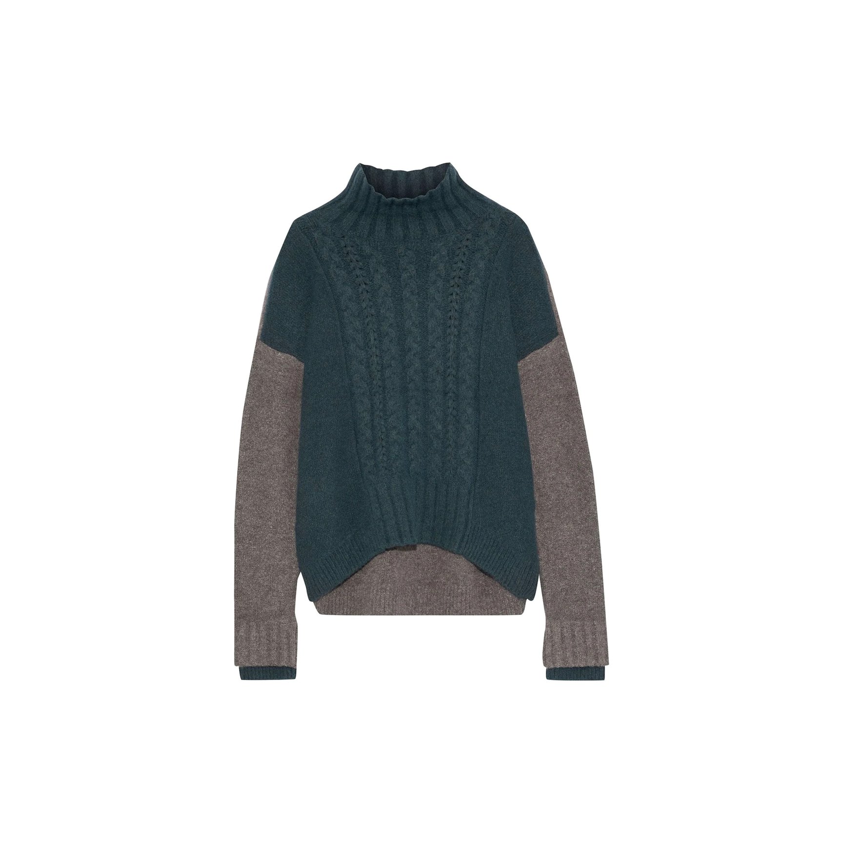 ショルダーの切り替えがポイントのバイカラーのタートルネックセーター。大きめのネックでざっくり羽織れます。深みのあるグリーンは秋のカラートーンとの馴染みもよく、2重スリーブのディテールが◎。