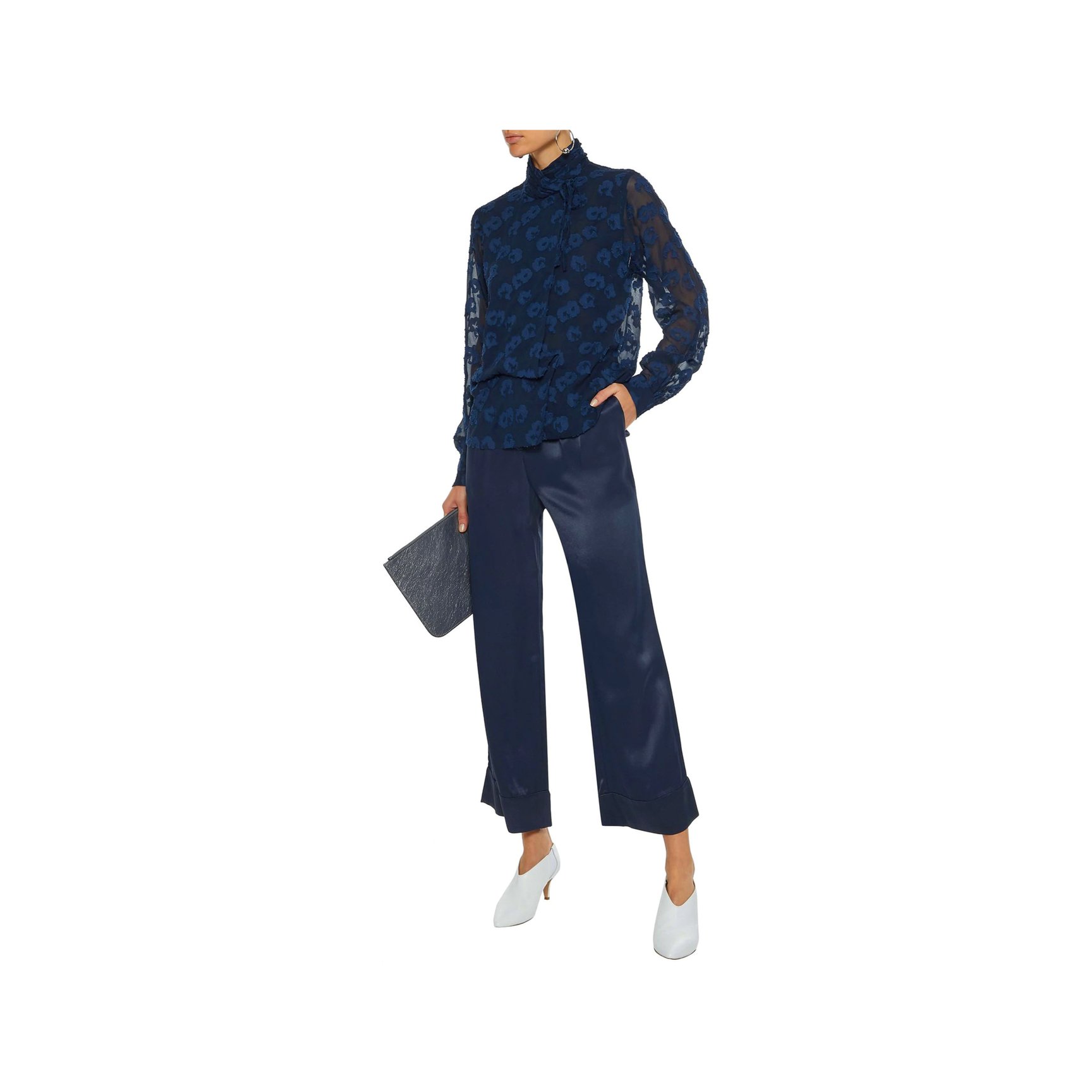 フラワージャカードが華やかなシフォンシャツ。パンツやスカートのどちらにも合わせやすく、タックインやアウトで着ても一枚で様になります。落ち着いたダークブルーとスリーブ&バックの透け感が大人の雰囲気で、シルバーやパールのアクセサリーが映えそう。