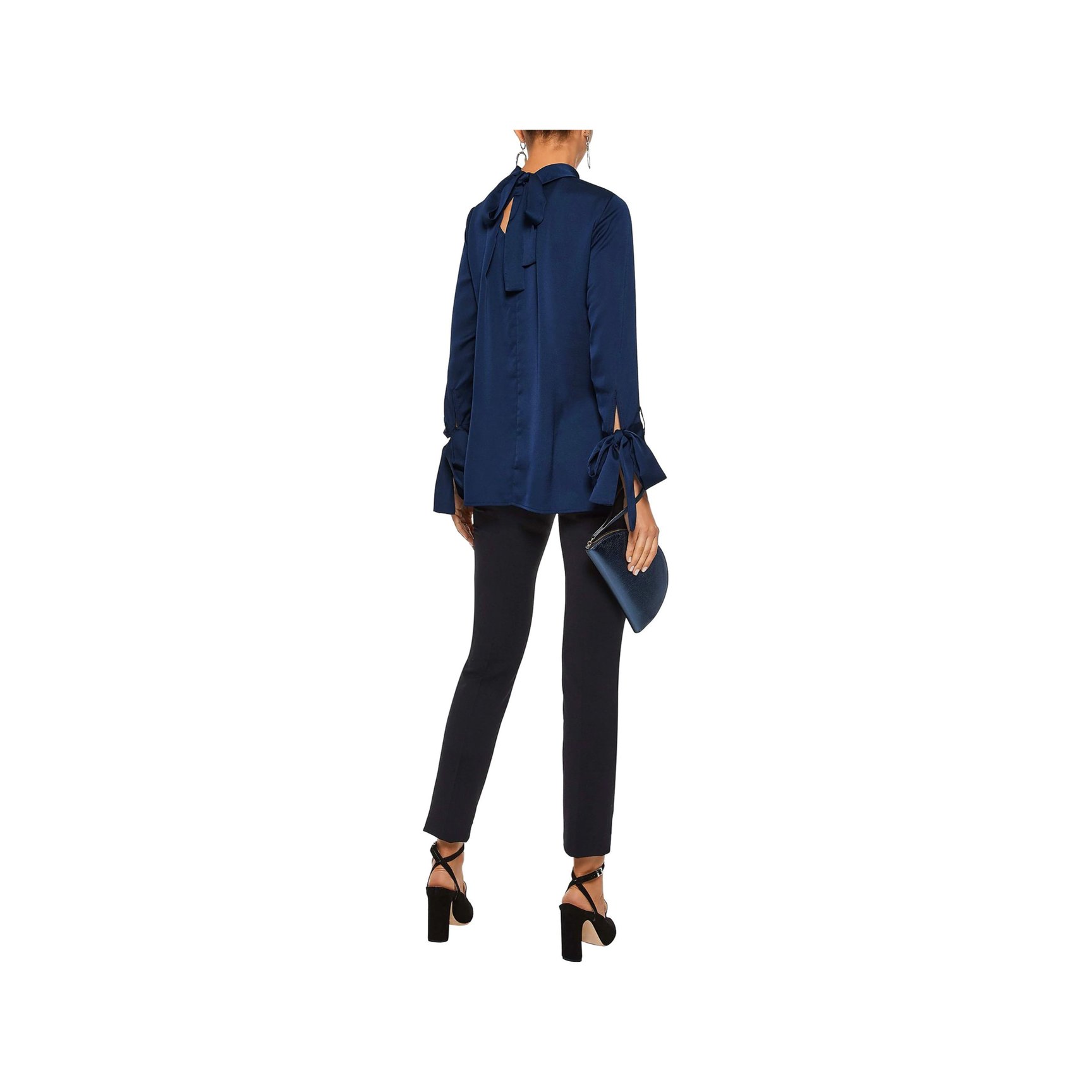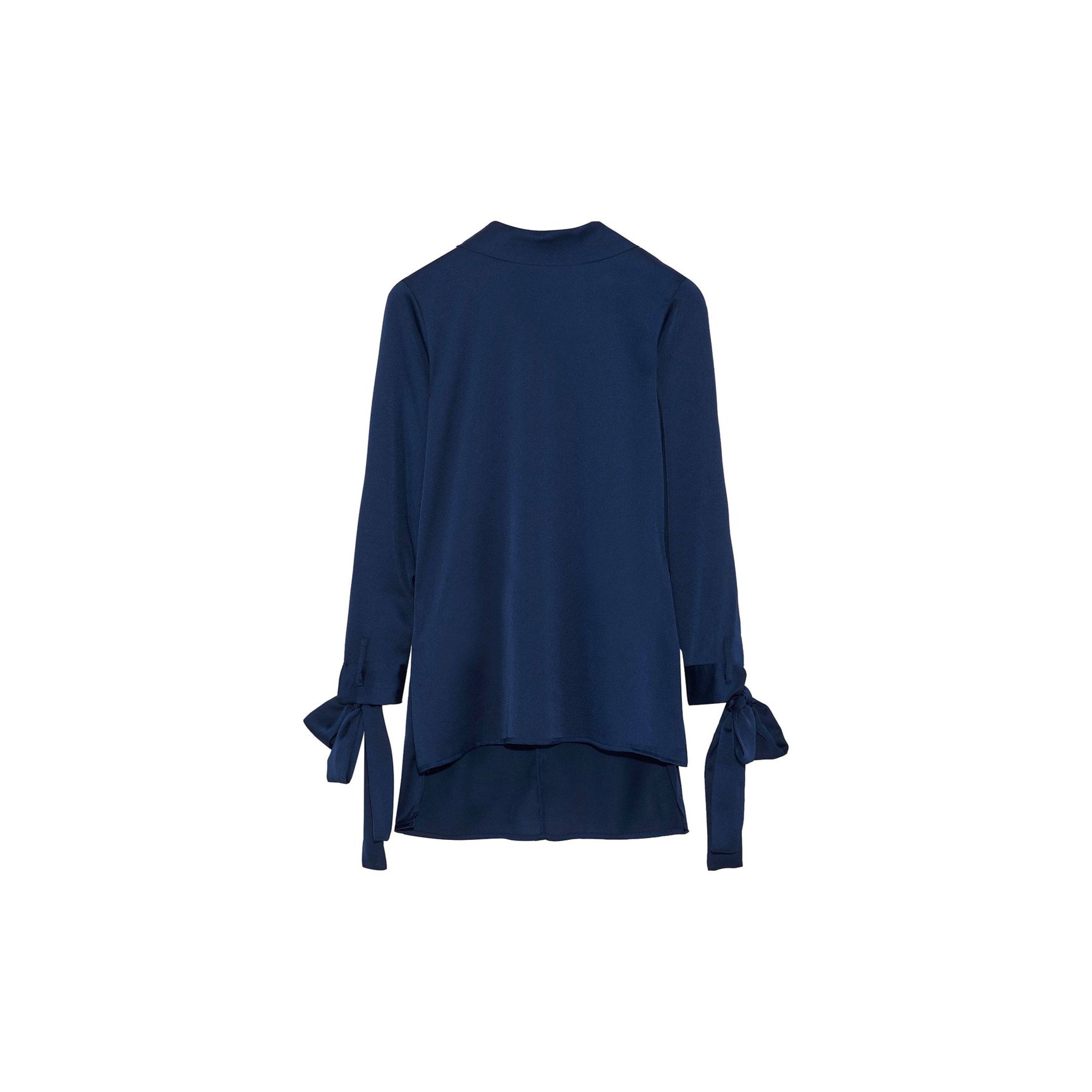 品のいいダークブルーとサテンの光沢がエレガントな雰囲気のブラウス。フロントはシンプルですが、バックはネックやスリーブ部分にリボンのディテールがあしらわれており、控えめながら華やかなデザインに仕上がっています。パーティシーンにも使える一枚。