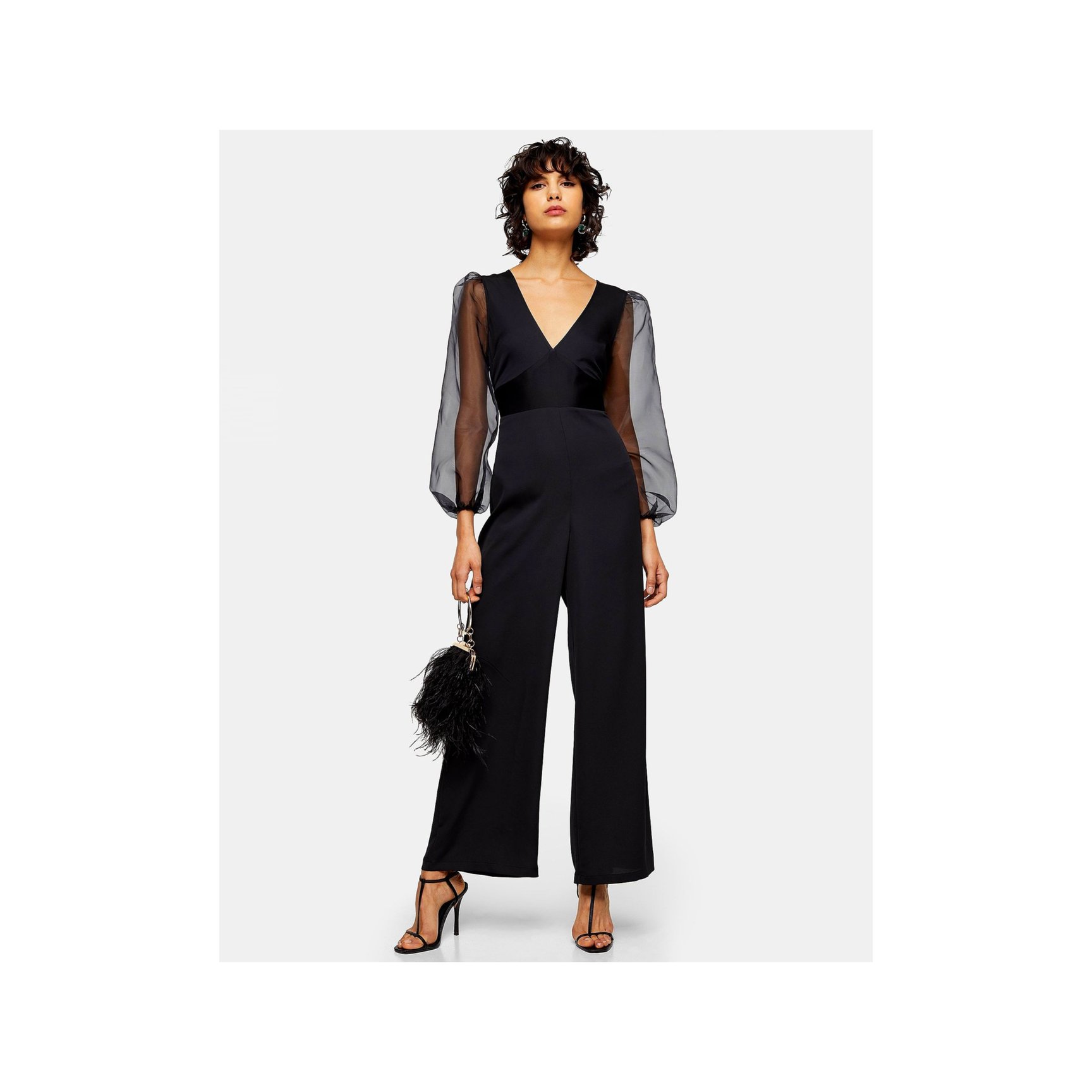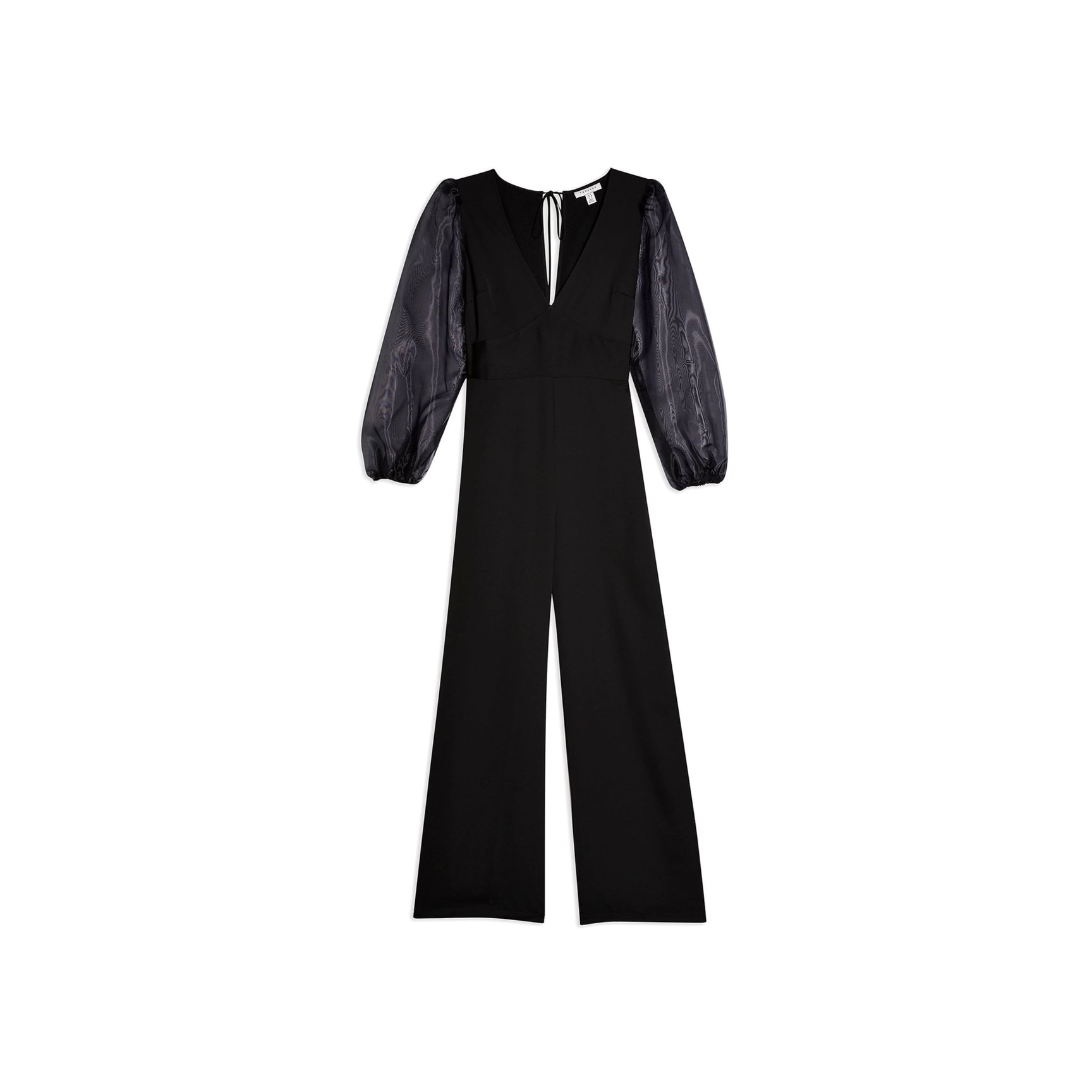 ドレッシーなシーンで活躍すること間違いなしのオールインワンパンツドレス。ブラックでシックですが、スリーブのオーガンジーの透け感が華やかな印象を与えます。深く開いたネックラインとバックスタイルがセンシュアル。