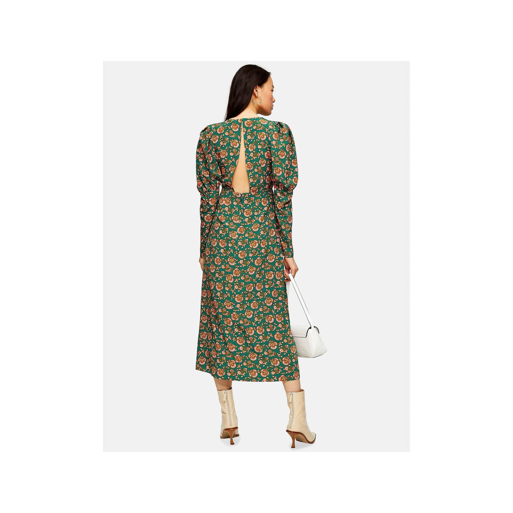フラワープリントとパフスリーブがレトロなムードのロングワンピース。ウエストの絞りやフロントのスリット、背中の開いたバックなど随所で女性らしさが際立つデザインです。ライダースやロングコートを羽織っても存在感があり、ワードローブが一気に華やぐ一枚。