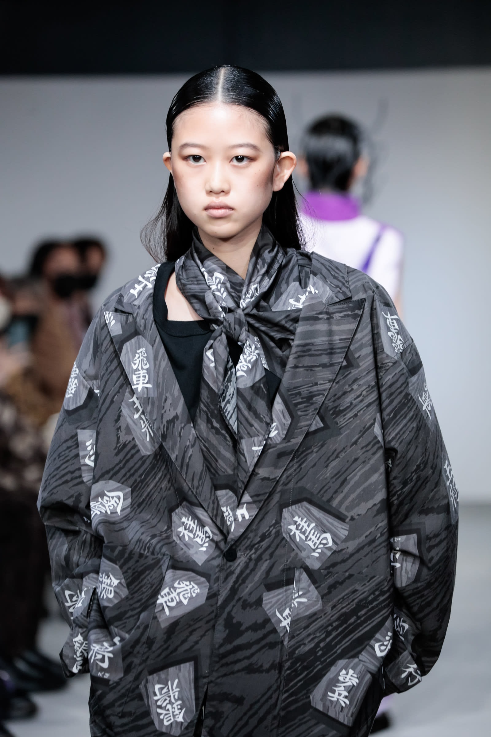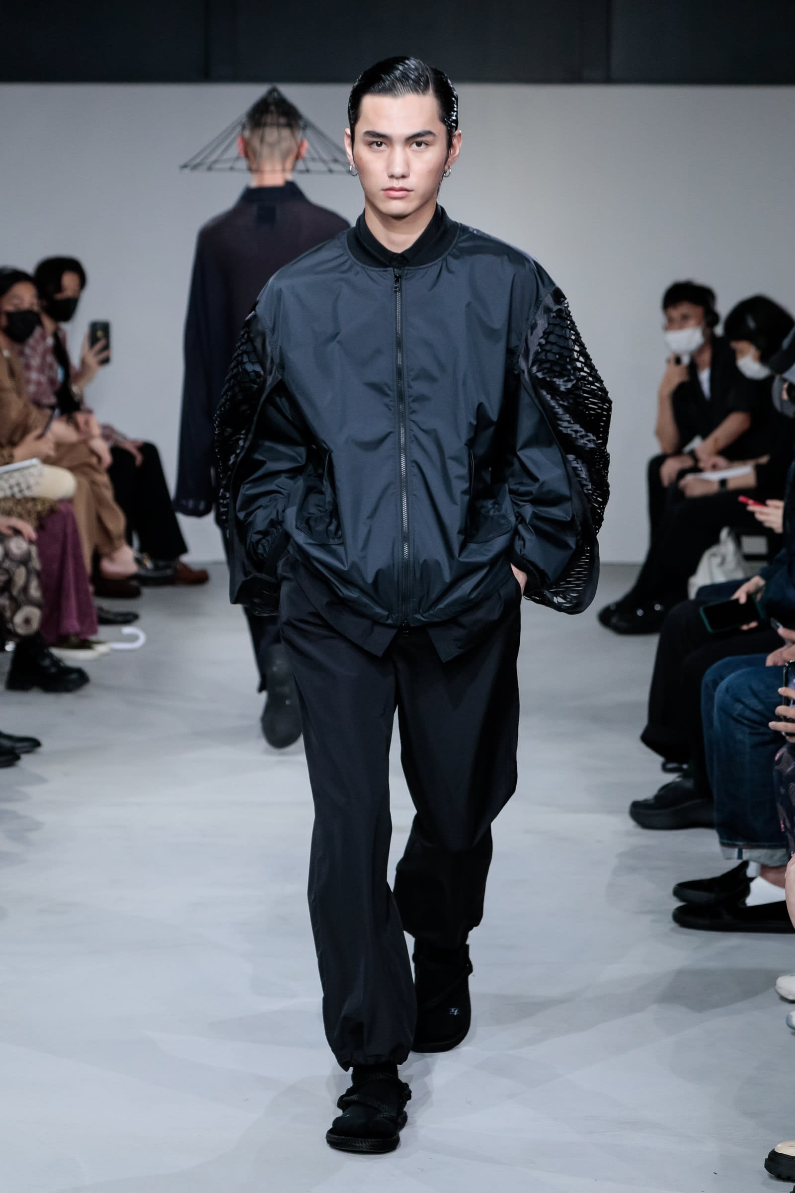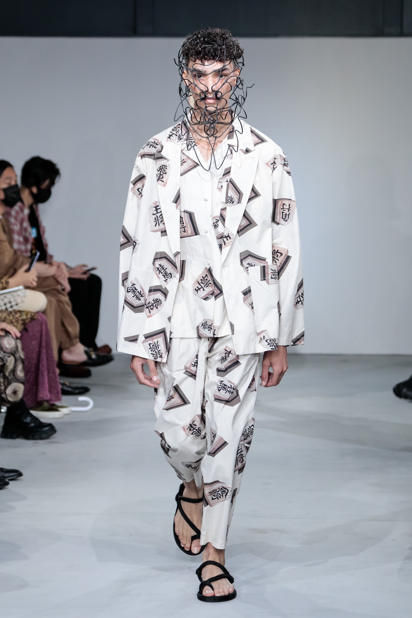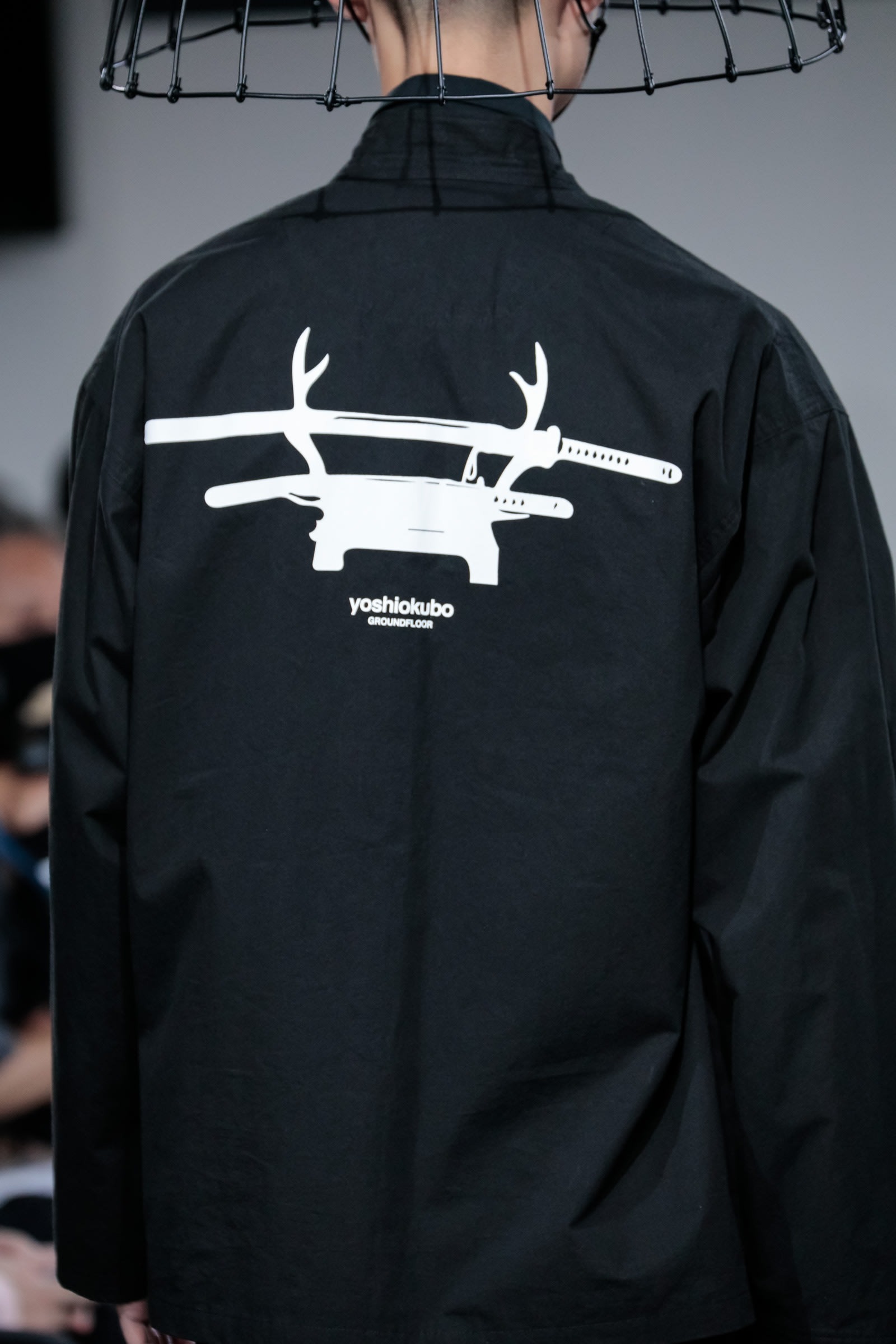 以前まだClubhouseが流行っていた頃、久保と一緒に雑談会をした経験がある筆者だが、物静かなデザイナーが多い中、普通にやれば間違いなく口語を得意とする稀有な存在である。にも関わらず、服のデザインはあくまでも寡黙。時折キャッチーな将棋の駒のプリントや刀の柄、「もののけ姫」のアシタカが着用している長手甲のようなアームカバーなどぱっと目を引くものもあるが、ヨシオクボの本質は緻密なパターンメーキングにある。ジャケット一つとっても、ラペル幅やカマ底の数ミリ単位の調整、肩の落ち感など、着用することでわかる、いわゆる「クオリティ」というものをこれでもかと体現するブランドである。パターン、加えて素材選び(特に今シーズンは化繊が目立った)の妙は、もしかすると玄人好みすぎるかもしれないが、ヨシオクボのオリジナティそのものである。