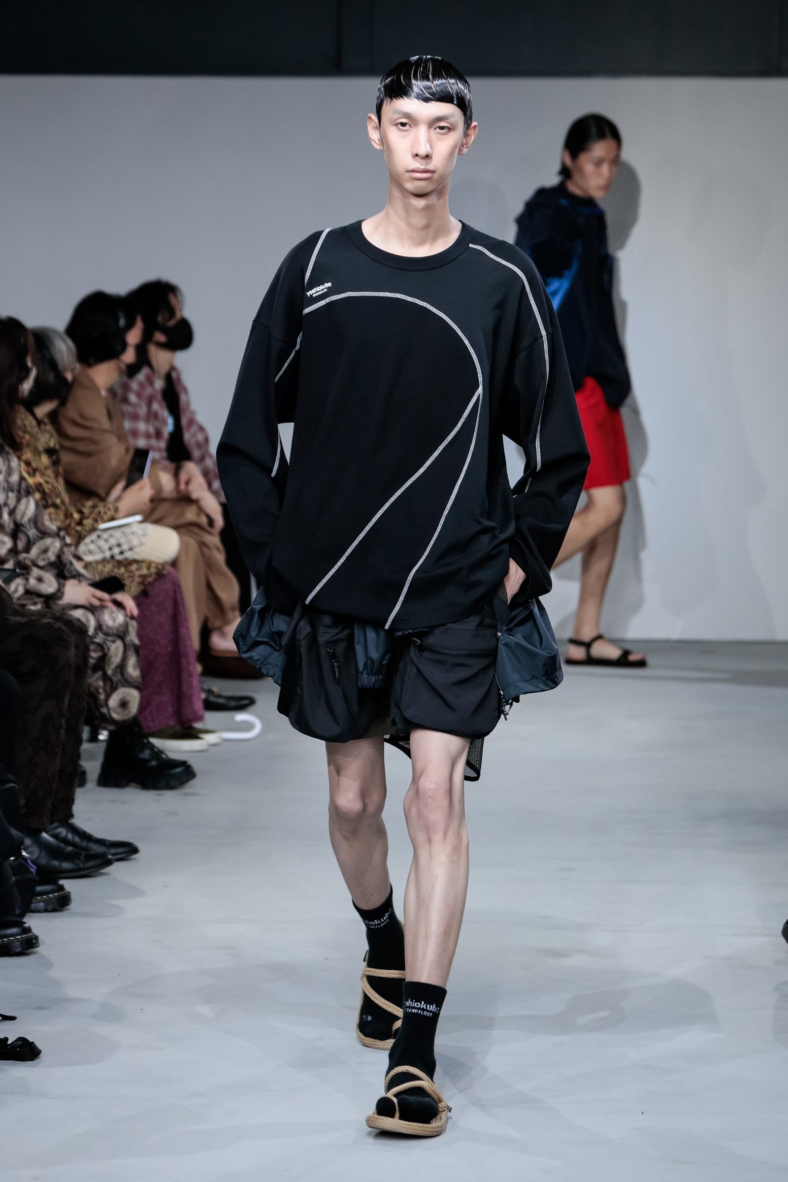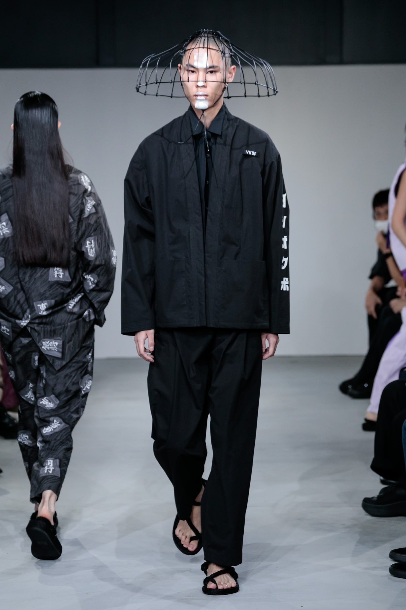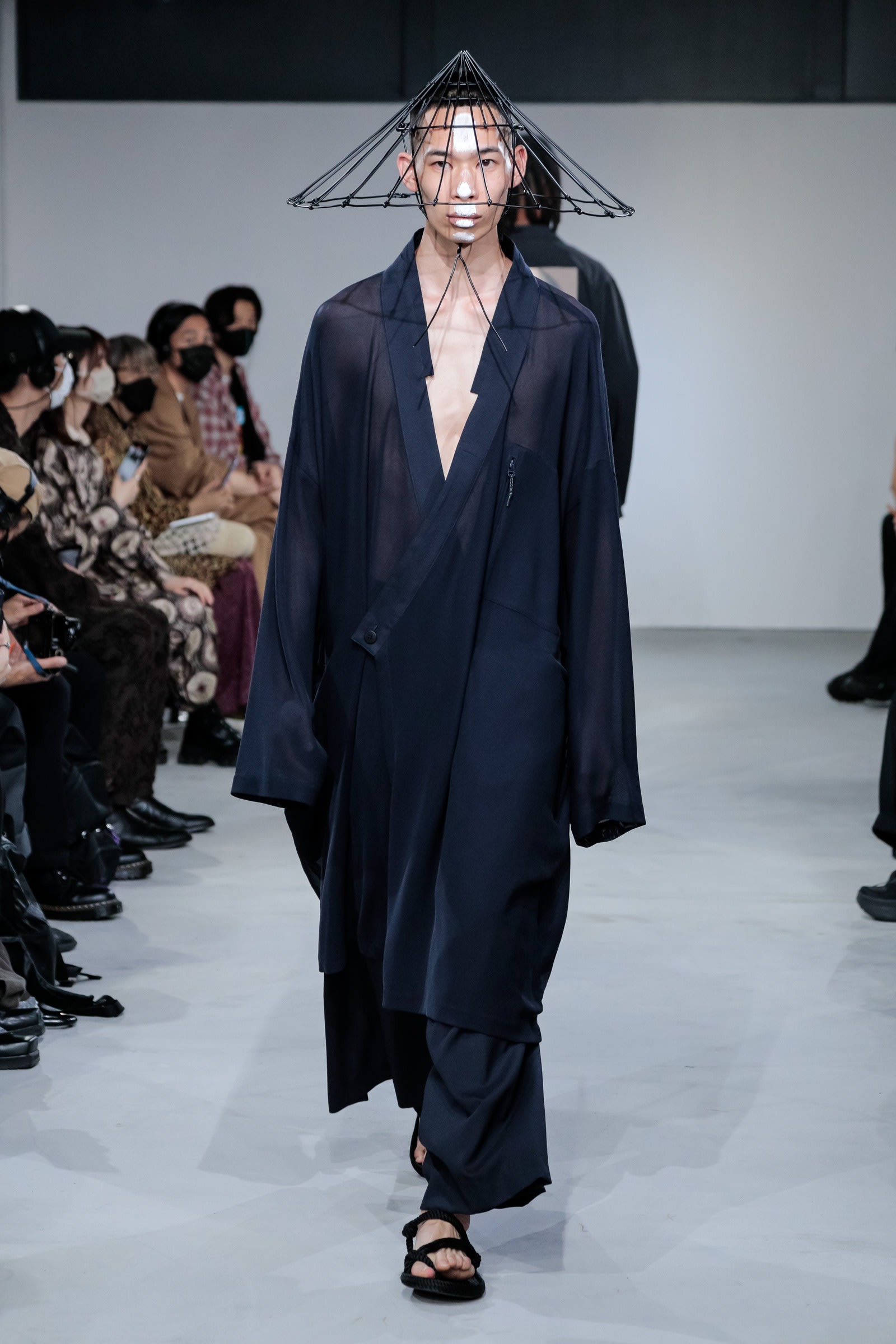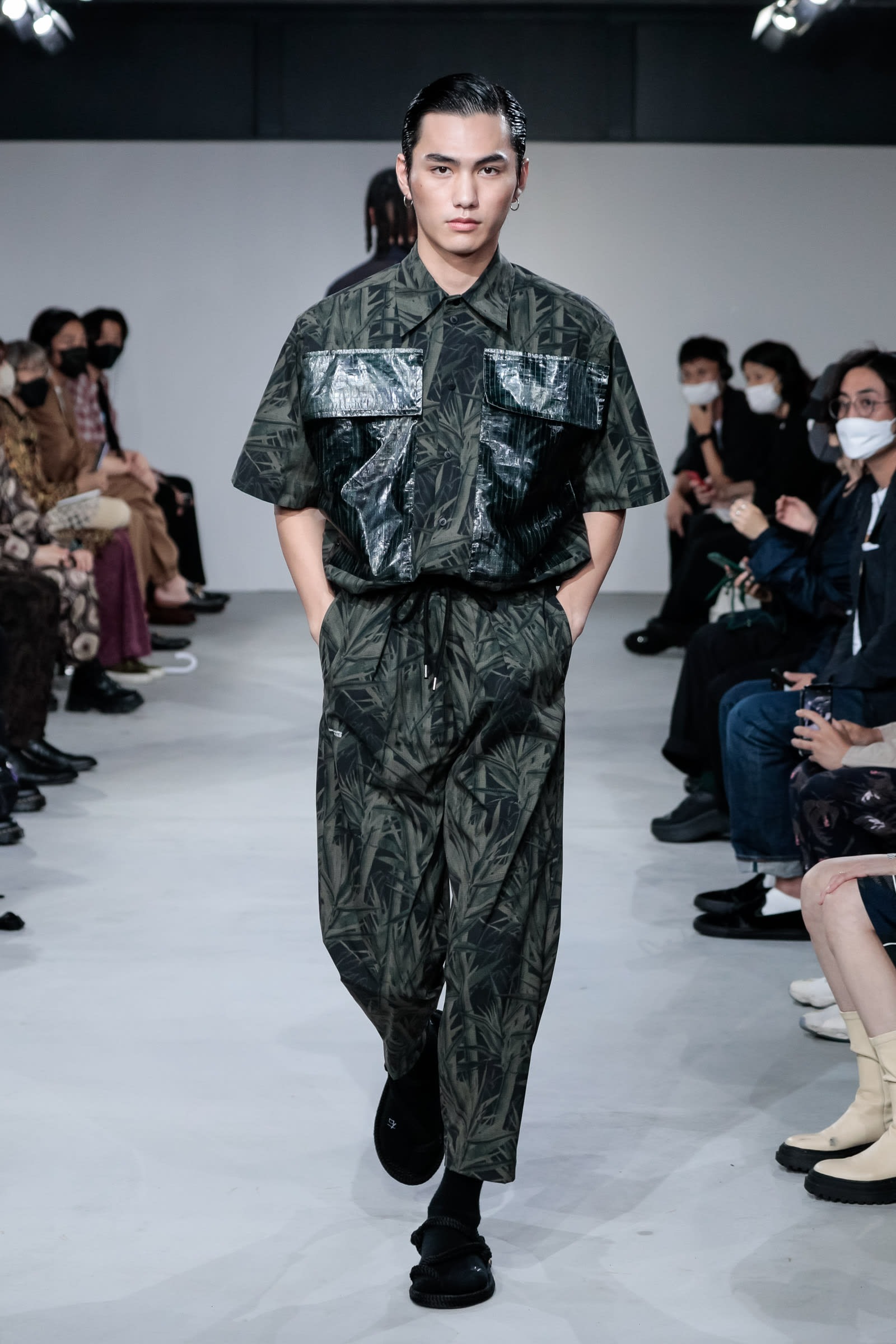 以前まだClubhouseが流行っていた頃、久保と一緒に雑談会をした経験がある筆者だが、物静かなデザイナーが多い中、普通にやれば間違いなく口語を得意とする稀有な存在である。にも関わらず、服のデザインはあくまでも寡黙。時折キャッチーな将棋の駒のプリントや刀の柄、「もののけ姫」のアシタカが着用している長手甲のようなアームカバーなどぱっと目を引くものもあるが、ヨシオクボの本質は緻密なパターンメーキングにある。ジャケット一つとっても、ラペル幅やカマ底の数ミリ単位の調整、肩の落ち感など、着用することでわかる、いわゆる「クオリティ」というものをこれでもかと体現するブランドである。パターン、加えて素材選び(特に今シーズンは化繊が目立った)の妙は、もしかすると玄人好みすぎるかもしれないが、ヨシオクボのオリジナティそのものである。