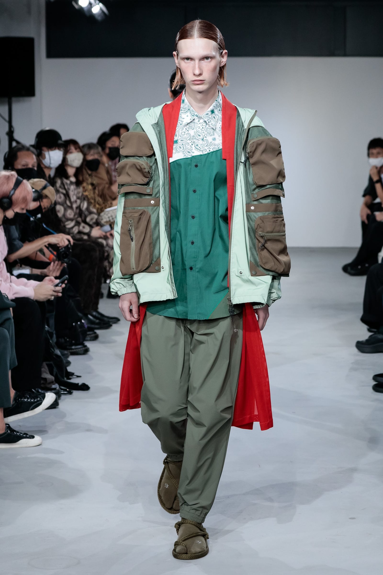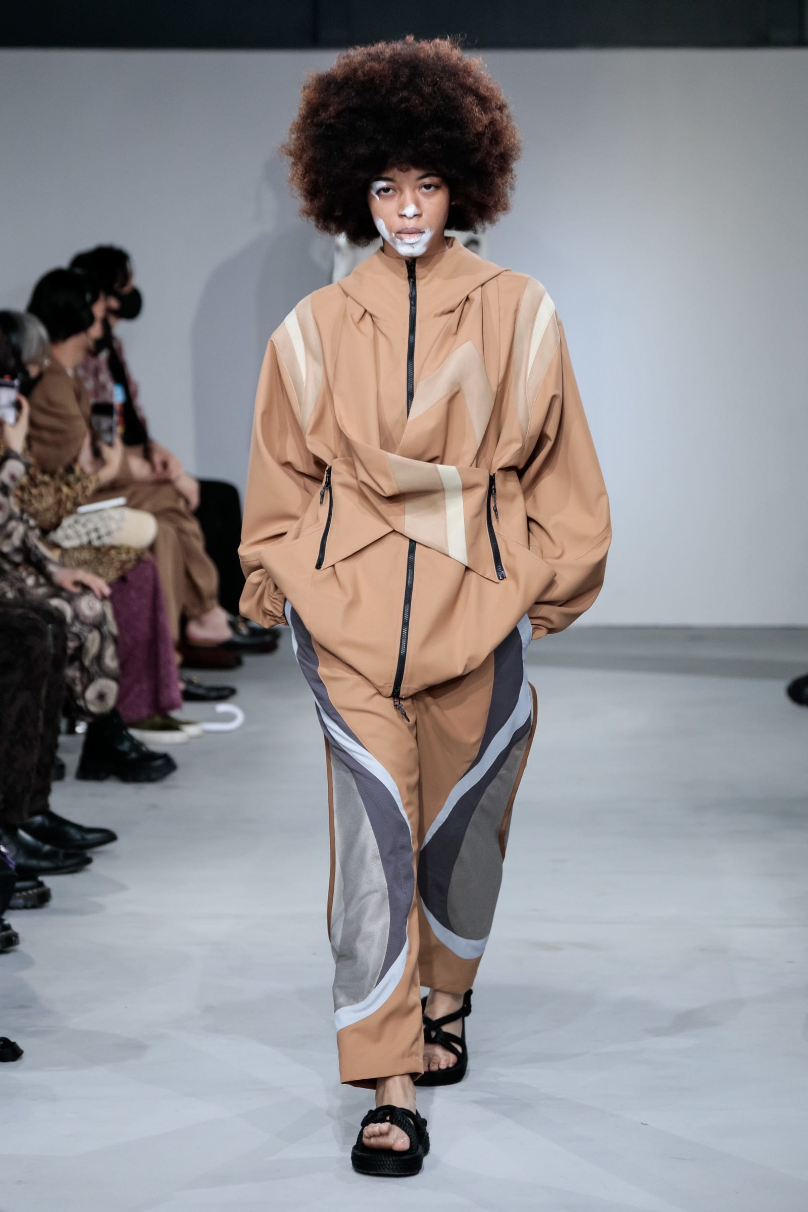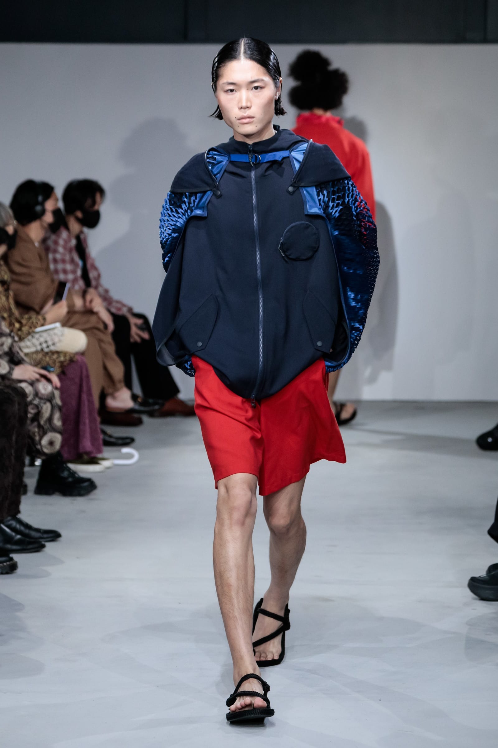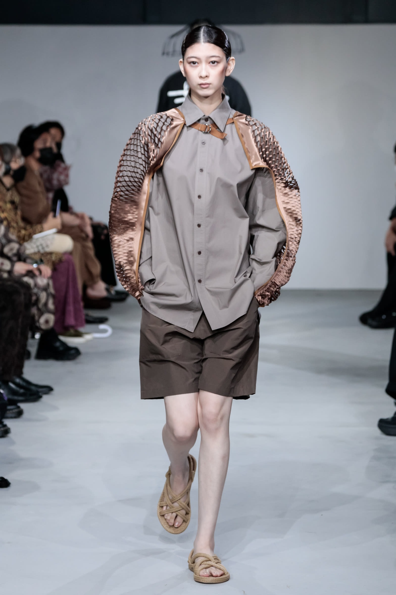 以前まだClubhouseが流行っていた頃、久保と一緒に雑談会をした経験がある筆者だが、物静かなデザイナーが多い中、普通にやれば間違いなく口語を得意とする稀有な存在である。にも関わらず、服のデザインはあくまでも寡黙。時折キャッチーな将棋の駒のプリントや刀の柄、「もののけ姫」のアシタカが着用している長手甲のようなアームカバーなどぱっと目を引くものもあるが、ヨシオクボの本質は緻密なパターンメーキングにある。ジャケット一つとっても、ラペル幅やカマ底の数ミリ単位の調整、肩の落ち感など、着用することでわかる、いわゆる「クオリティ」というものをこれでもかと体現するブランドである。パターン、加えて素材選び(特に今シーズンは化繊が目立った)の妙は、もしかすると玄人好みすぎるかもしれないが、ヨシオクボのオリジナティそのものである。