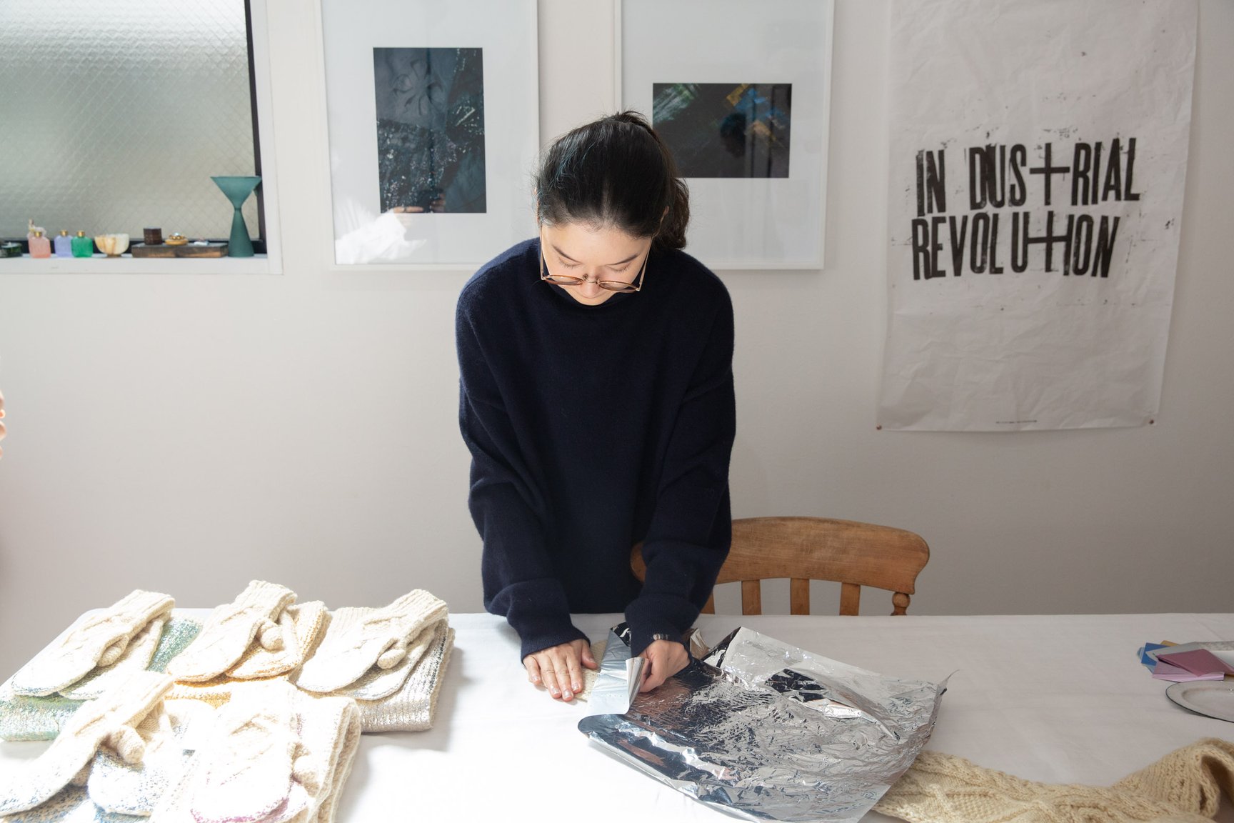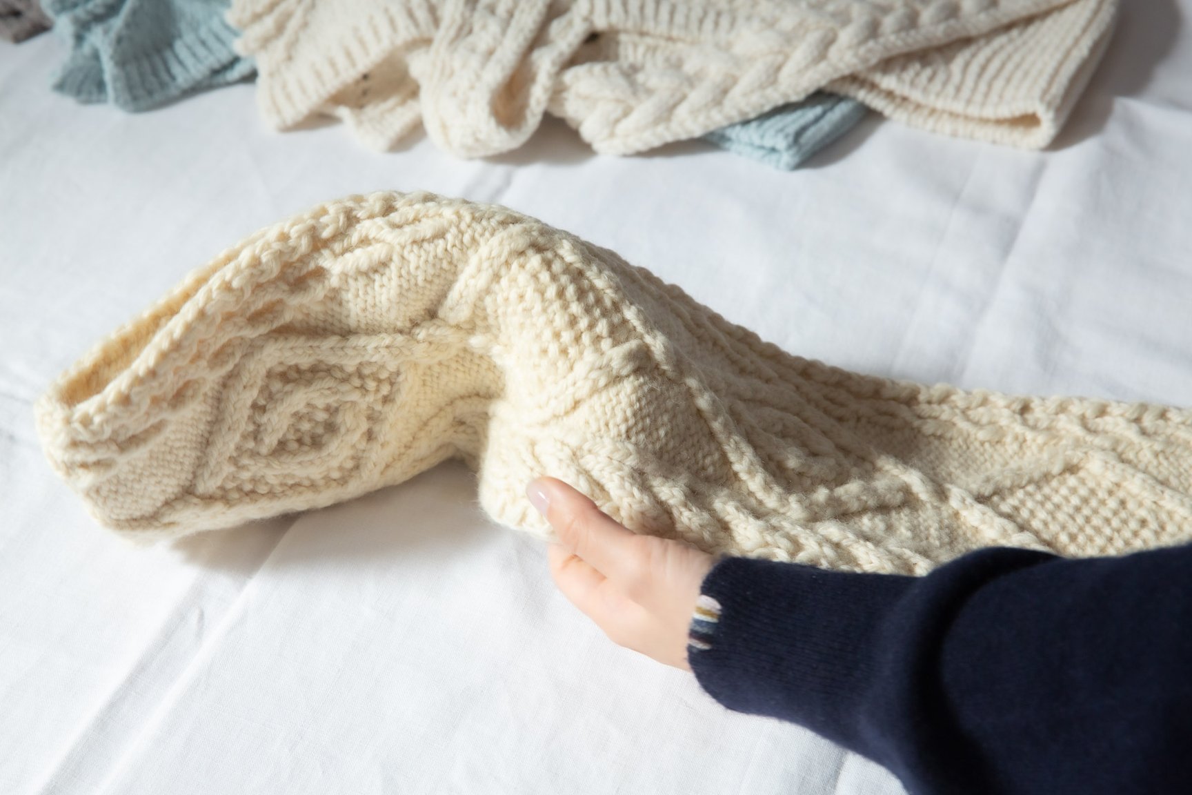 昨年、F/STOREでも発売後瞬く間に完売した「ユキ フジサワ(YUKI FUJISAWA)」の「アランニット×金銀箔」シリーズのアイテム。ストアでは、今年も別注アイテムを含めた新作を12月7日19時に発売することになりました!今回販売するのはバラクラバ&ケープ型バラクラバ、別注デザインも含めた箔付きのマフラー&ミトン、そしてカスタムオーダー(!)できるマフラーとトートバッグです。今回はユキ フジサワのアトリエに訪問し、デザイナーの藤澤ゆきさんにアイテムについてそれぞれ解説してもらいました。