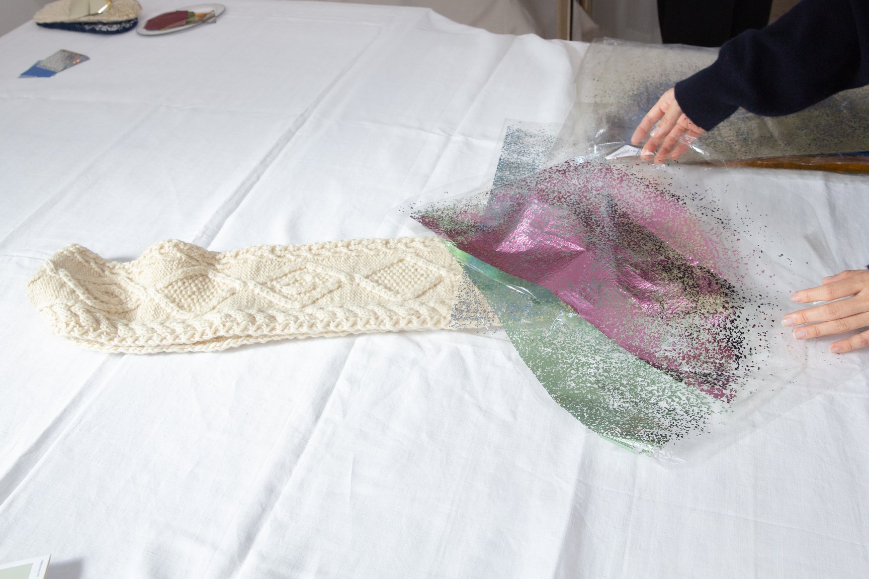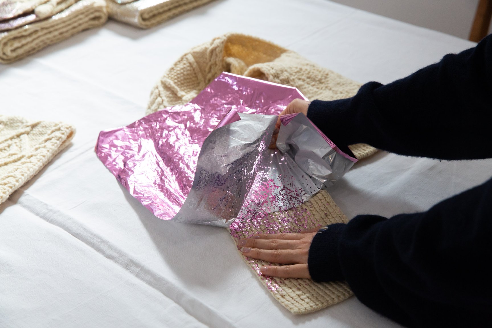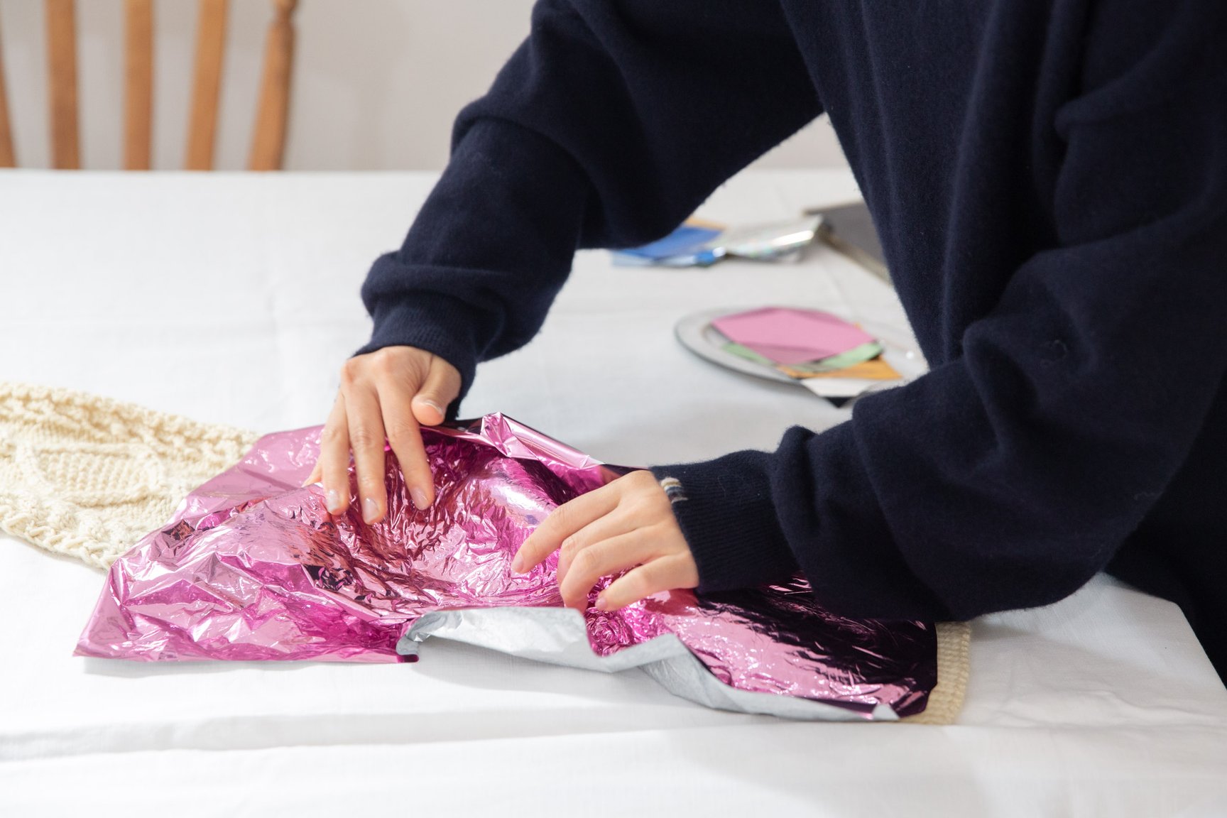このパステルカラーの箔はどれも新色で、日本でここにしか無い色なんです。ドイツメーカーの箔を愛用しているんですが、最近そのメーカーさんが私の出演番組をたまたま観たようで「箔で面白いことやっていますね」と連絡をくれて仲良くなったんですよ。工場ではなくデザイナー個人で箔を多用する人は少ないらしくて。なので「日本には原色の箔しか輸入されていないのが悩みなんです」とお伝えしたら、ドイツから限定色を手配してくださったんです。