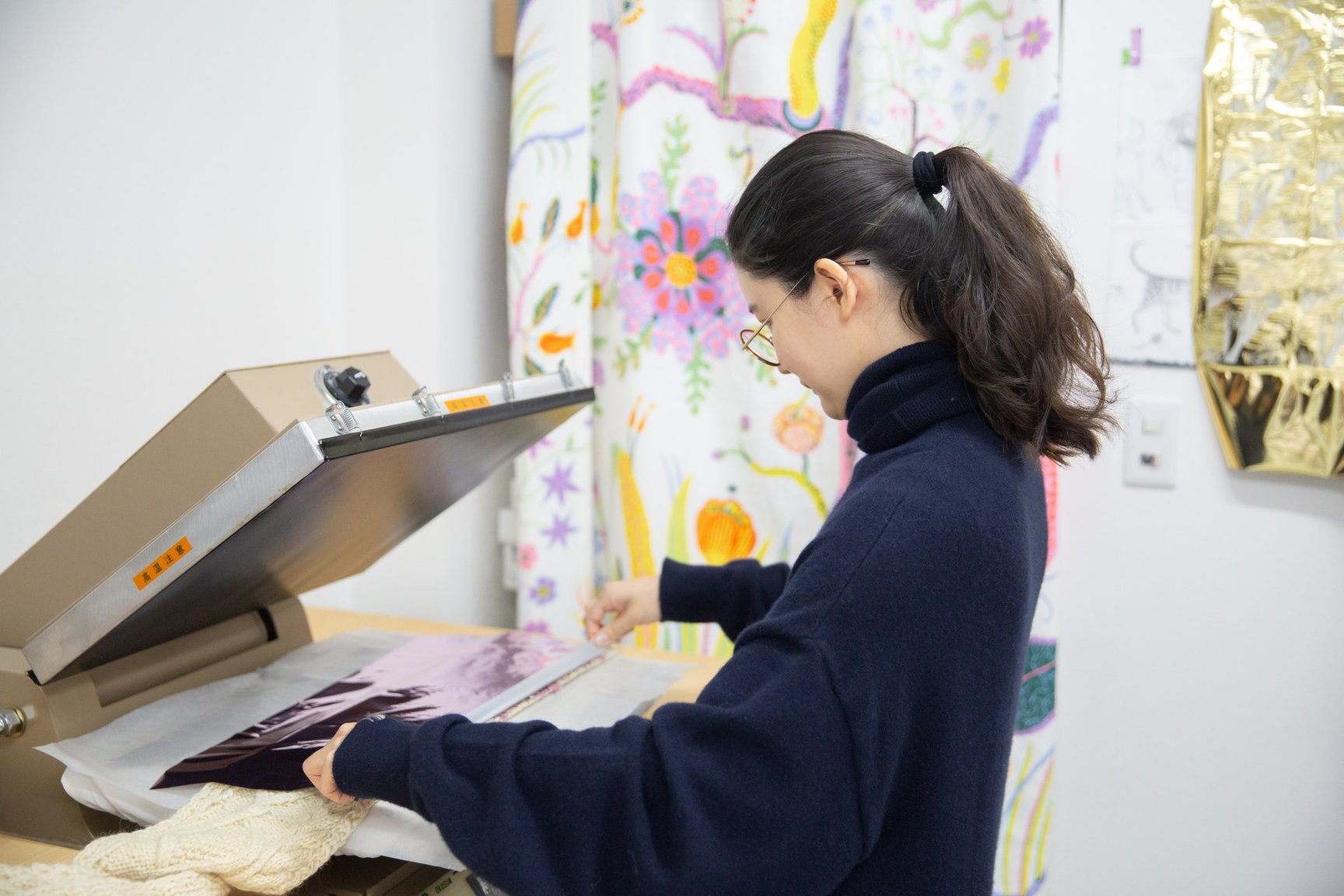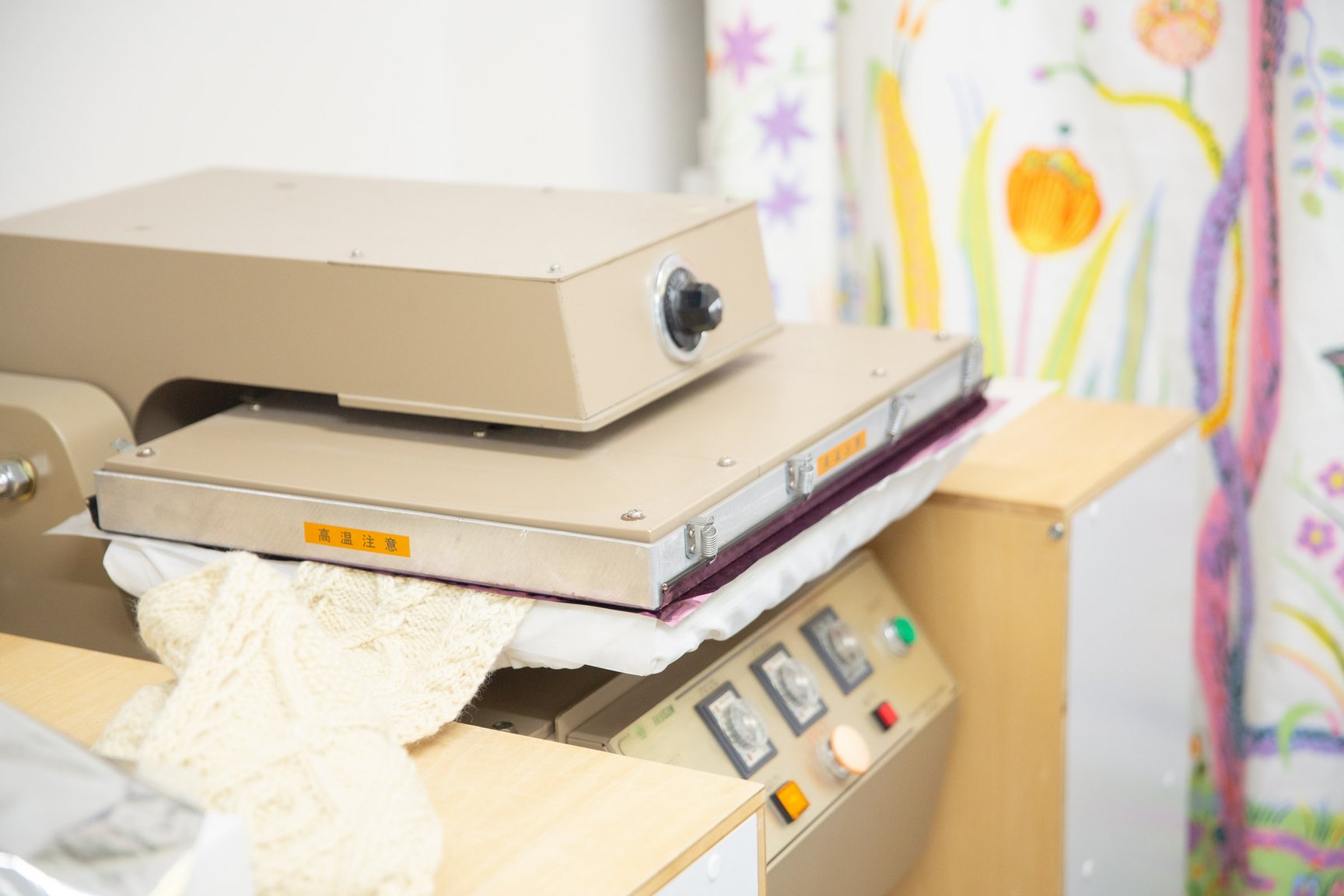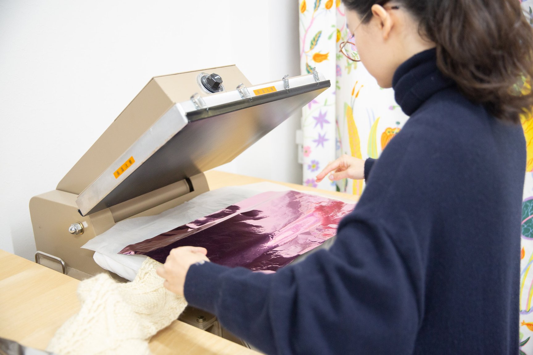 ということで、なんと実際に箔付きトートバッグの制作を体験させていただきました。筆者はラッキーカラーのパステルグリーンとプリズムをチョイス。アイロンを全体にかけたのち、箔をプレス→冷ます→箔を剥がすという工程を2回繰り返すだけなので、所要時間は約30分程度でした。