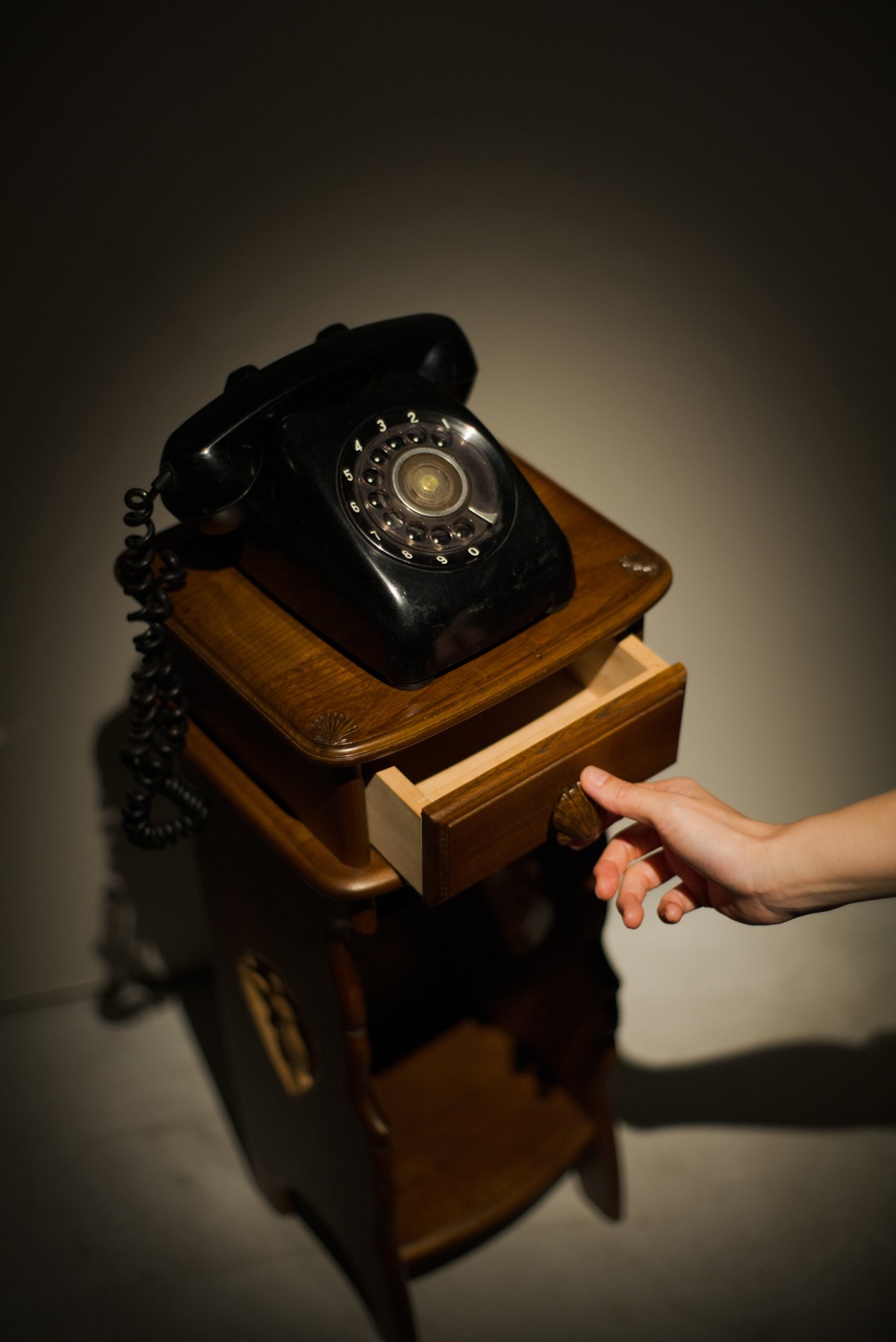 通路の奥の“暗がり”に佇むのは、昔おばあちゃんの家にあったような「電話台」。サイドには人魚が、引き出しの取っ手には二枚貝のモチーフが、うまのはなむけさんの手によって彫られています。この作品の一番の秘密は、引き出しに隠されたオルゴール。後ろのゼンマイを巻いて引き出しを開けると、会場音楽を手がける青葉市子さんの代表曲の一つ「アンディーヴと眠って」がノスタルジックに流れます。