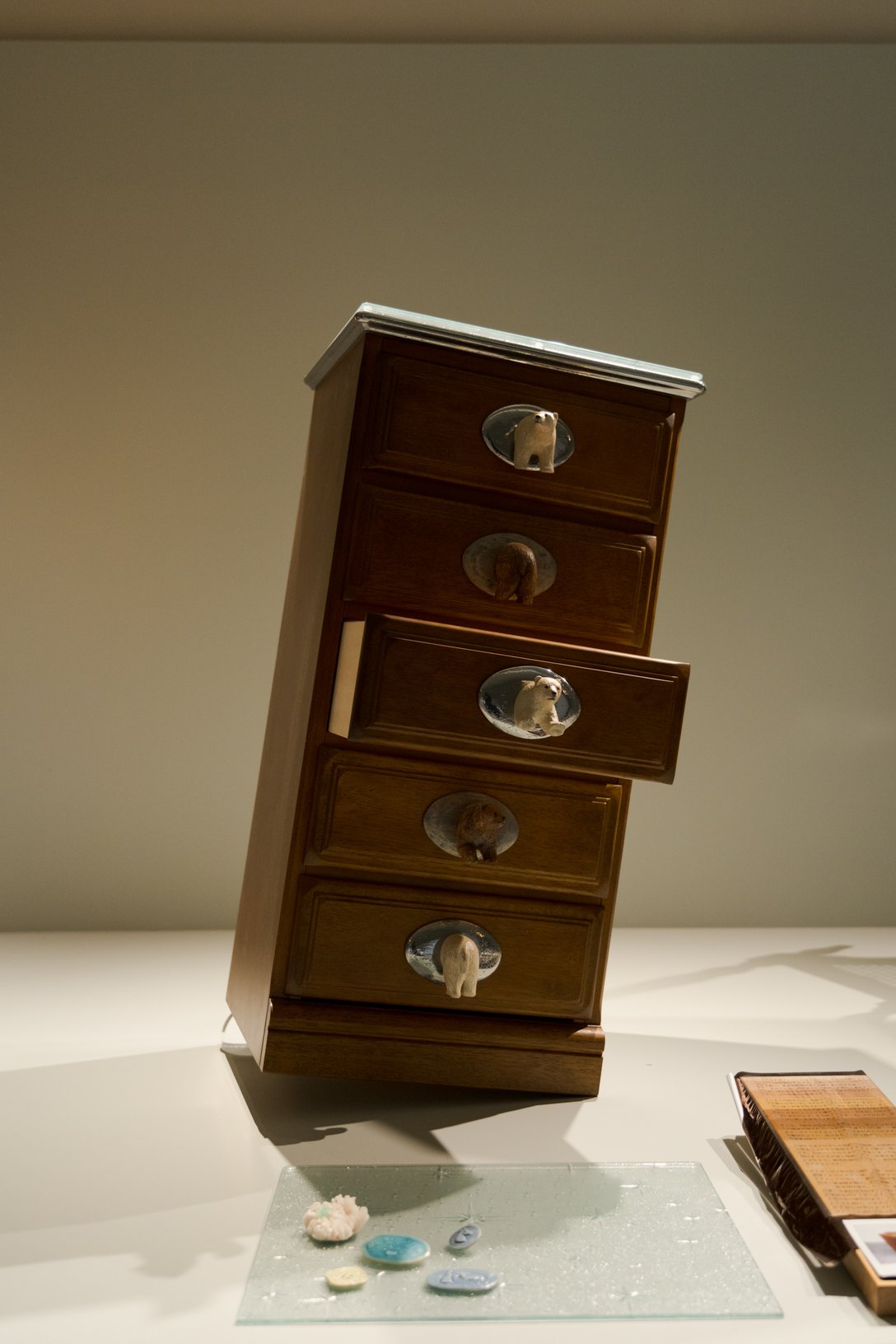 会場の奥に続く通路へと進むと、個性豊かな家具たちが宙に浮かんだ“魔法の空間”が登場。三宅瑠人さんによる鳥や蝶、草花のイラストがカリモク家具のレーザー加工技術で彫刻のようにあしらわれた「花台」や、天板に北極の氷のようにも見える“昭和ガラス”を載せ、引き出しの引き手にうまのはなむけさんによるシロクマとヒグマの顔やおしりのモチーフをあしらった「整理箱」、木工旋盤作家 市川岳人さんが脚を手がけた机と収納が一体型になった家具「ライティングビューロー」など、それぞれの作家の作風とその魅力が活かされた、昔懐かしい家具をベースにした作品が並びます。