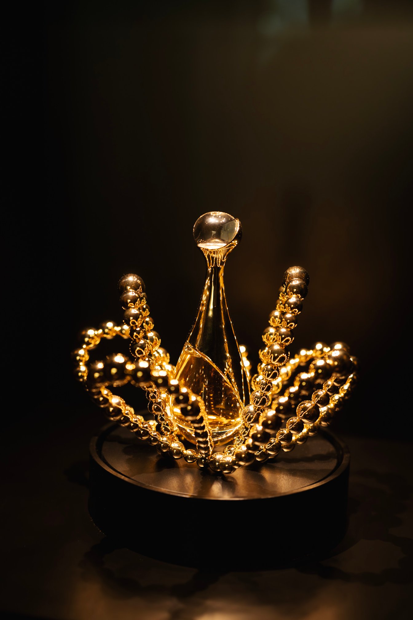 階段を上がった2階ではジャドールと芸術との結びつきにフォーカス。まず目に飛び込んでくるのはジャン=ミッシェル・オトニエルによる反復するゴールドのビーズからなるオブジェです。同氏は2012年に限定ボトルのデザインを手掛けたほか、今年「ジャドール ロー」でも限定エディションをデザインするなど、ジャドールとゆかりが深いアーティストでもあります。