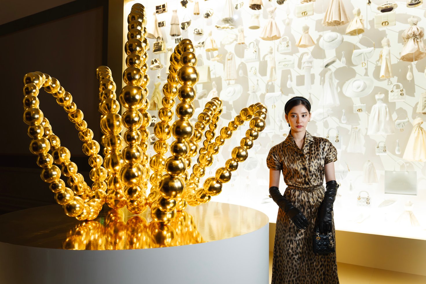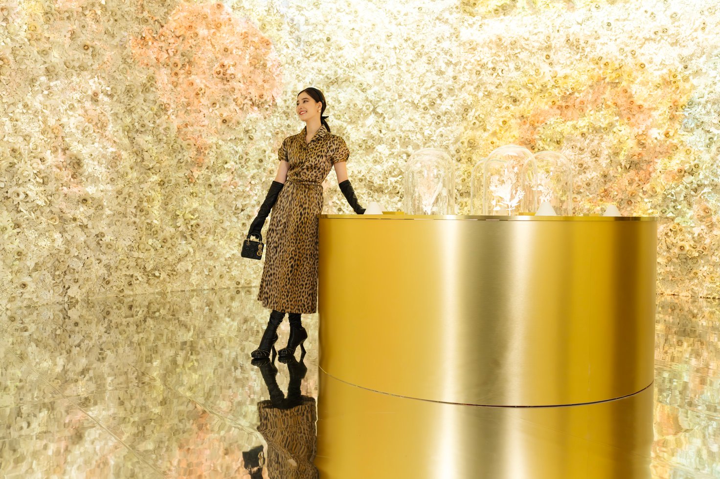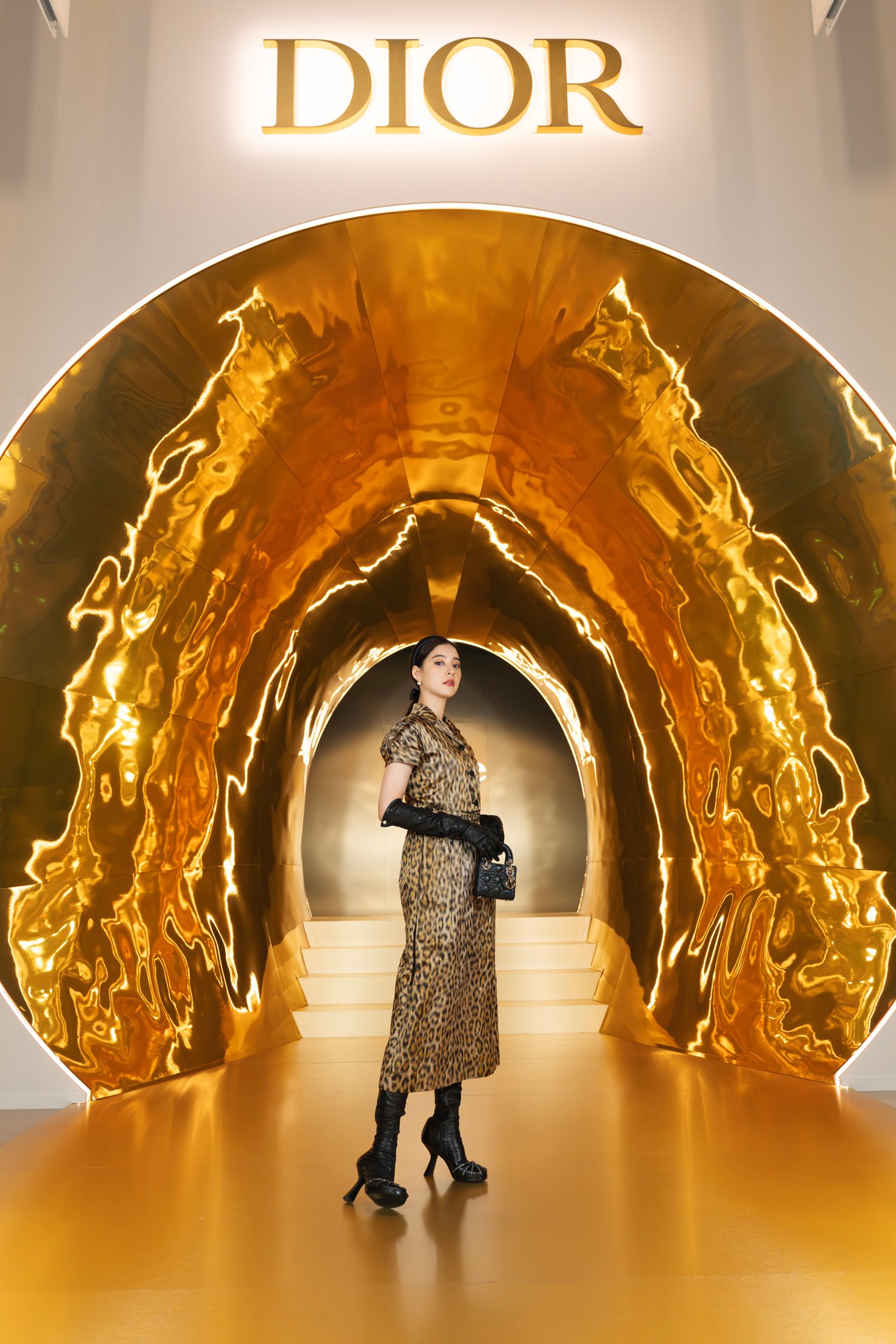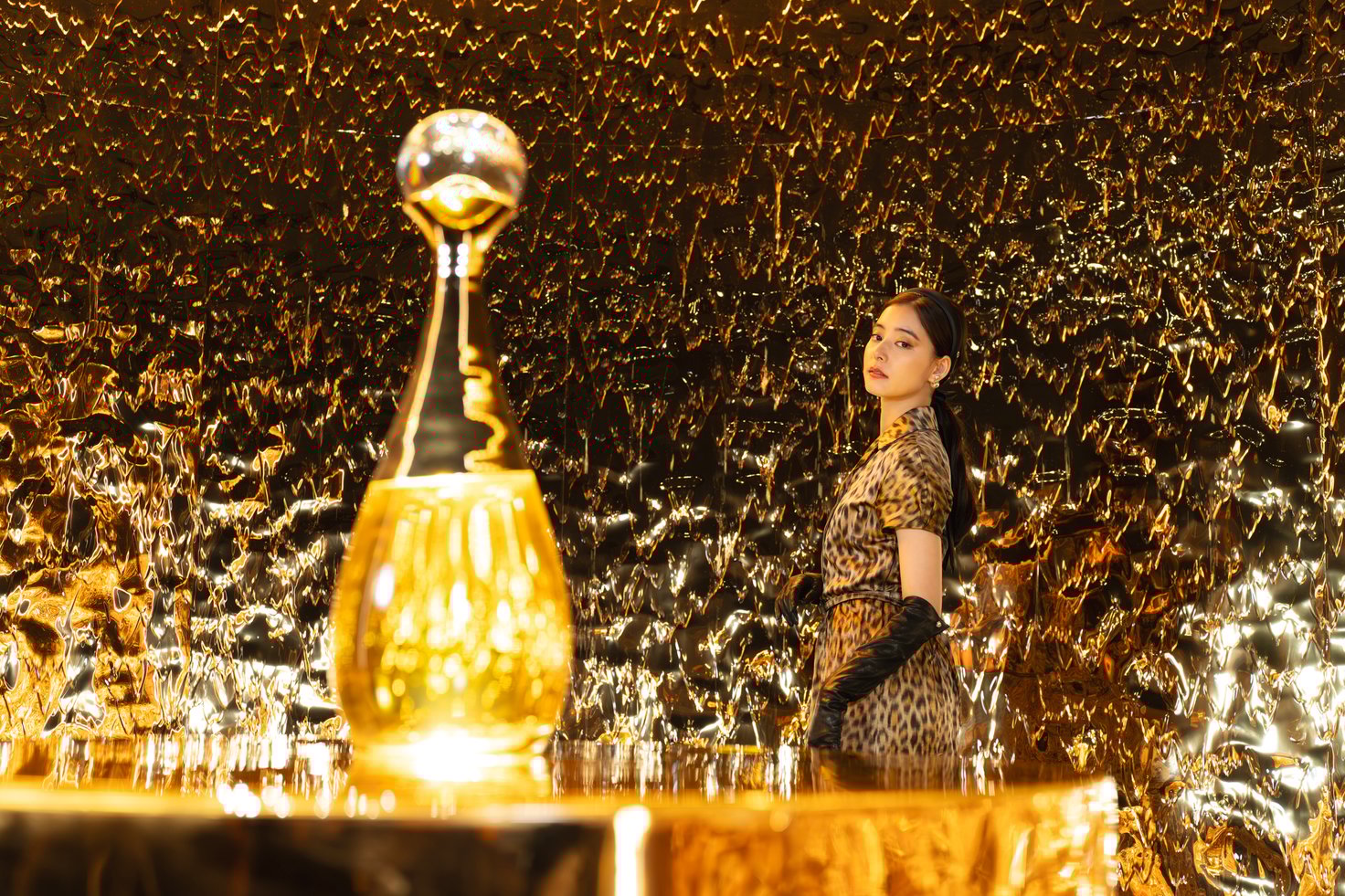 館内では、ジャドールの歴史やこれまでのキャンペーンヴィジュアル、ボトル装飾に至るサヴォアフェール(匠の技)などが2フロアにわたり展示され、ジャドールを多角的に深掘りする構成です。メゾンを象徴するレオパード柄「ミッツァ」のドレスに身を包んだ新木優子さん。神々しいメルティング ゴールドに誘われ、エントランスをくぐってジャドールの世界へ。