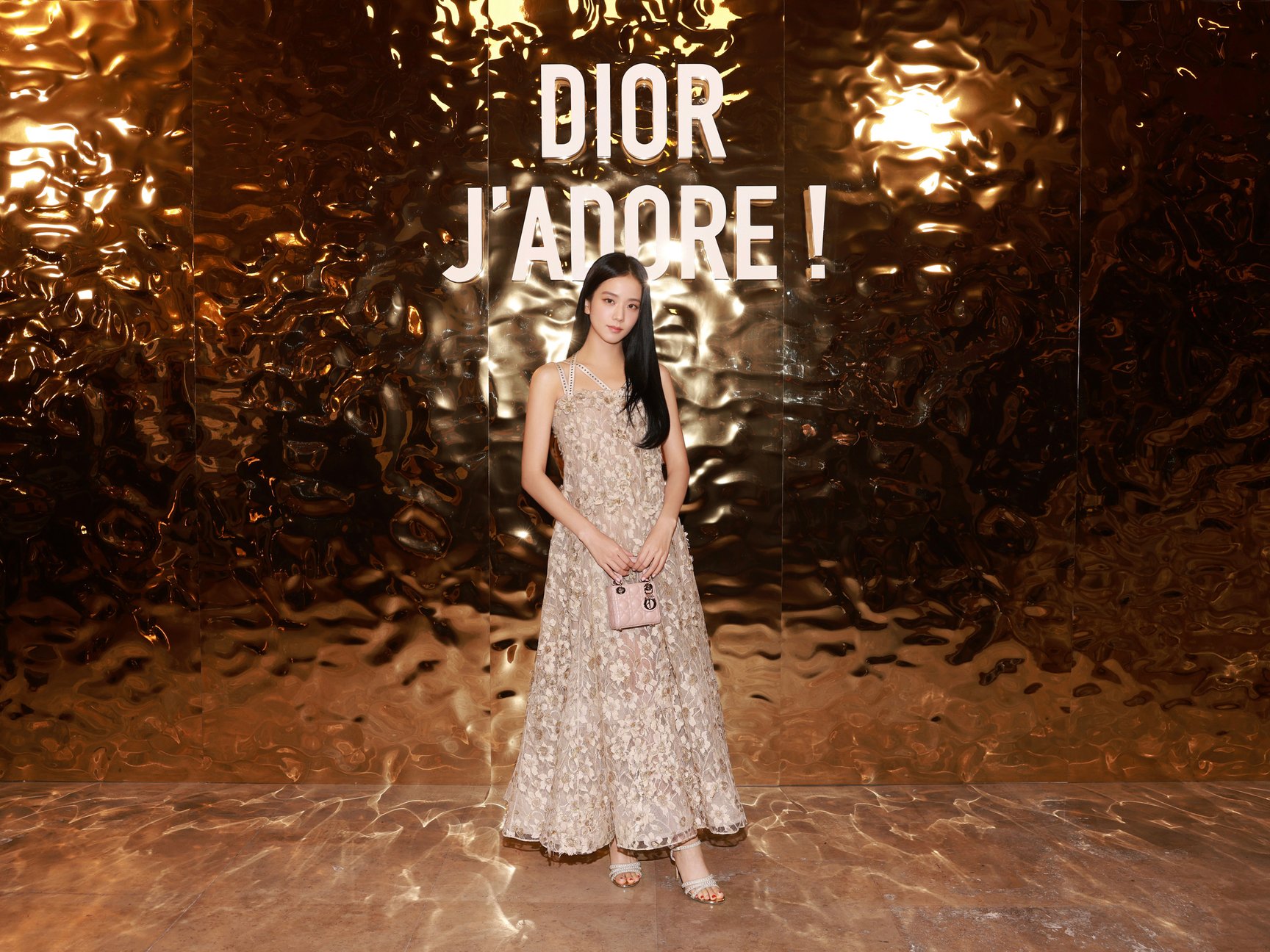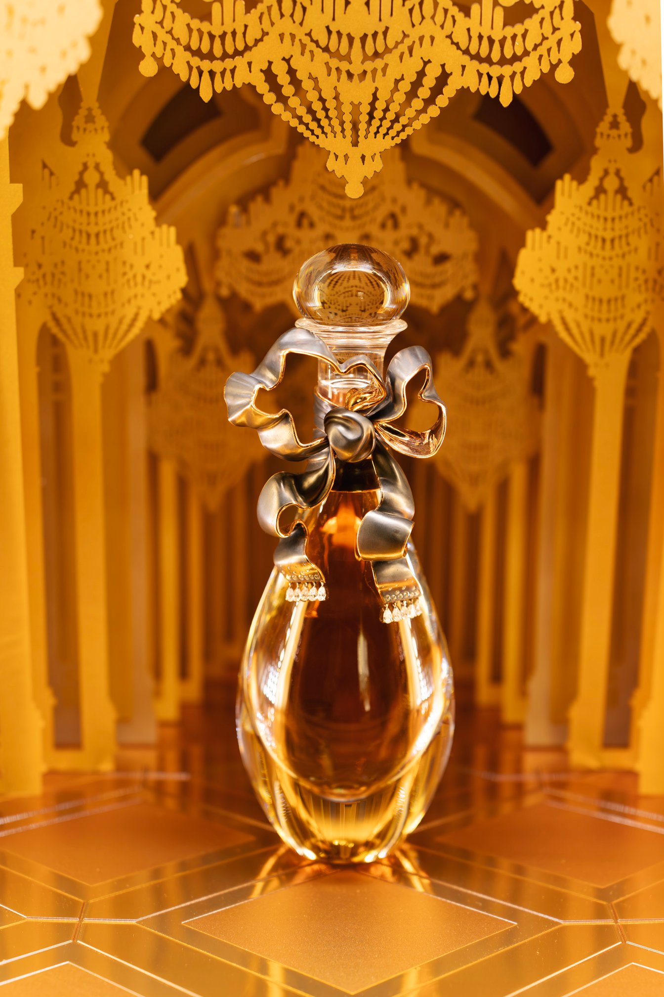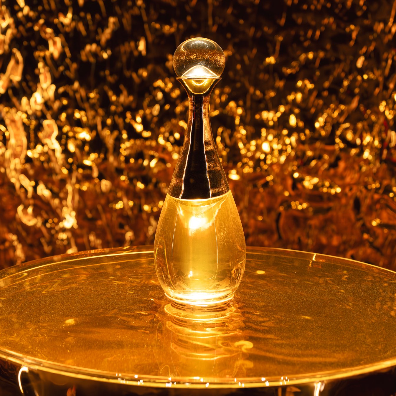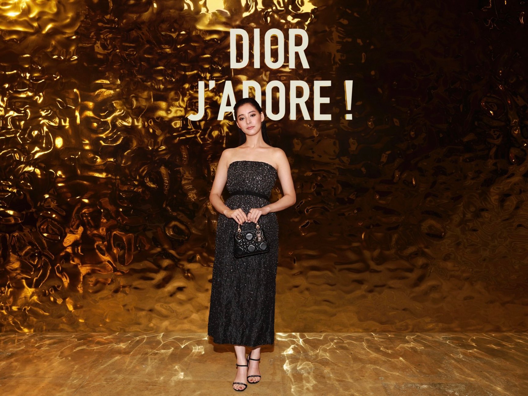館内では、ジャドールの歴史やこれまでのキャンペーンヴィジュアル、ボトル装飾に至るサヴォアフェール(匠の技)などが2フロアにわたり展示され、ジャドールを多角的に深掘りする構成です。メゾンを象徴するレオパード柄「ミッツァ」のドレスに身を包んだ新木優子さん。神々しいメルティング ゴールドに誘われ、エントランスをくぐってジャドールの世界へ。