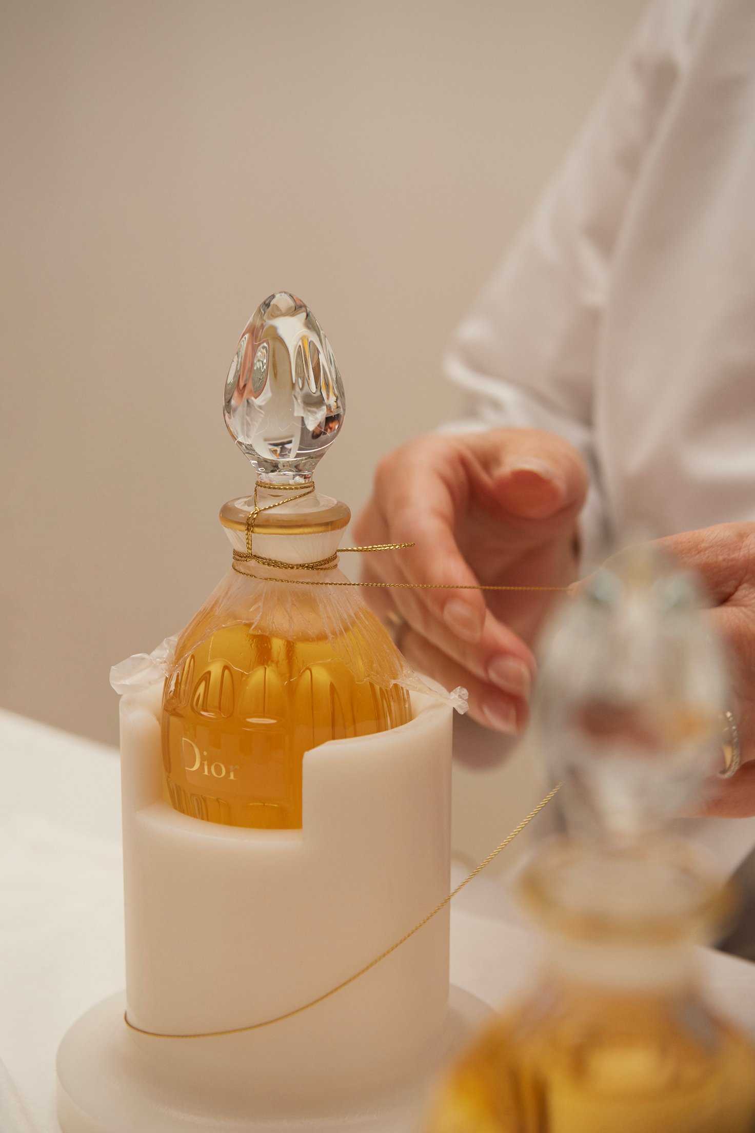 そしてクチュールメゾンであるディオールと切っても切り離せない「サヴォアフェール」を実際に見ることができる部屋も。ここでは「ボードリュシャージュ」と呼ばれる伝統的なフレグランスの密封技法を職人が実演。ボトル瓶の口を薄いフィルムのような動物性の腸膜で覆い、金糸を巻き付けるという緻密で繊細な作業を通して、ジャドールのクラフツマンシップを讃えます。