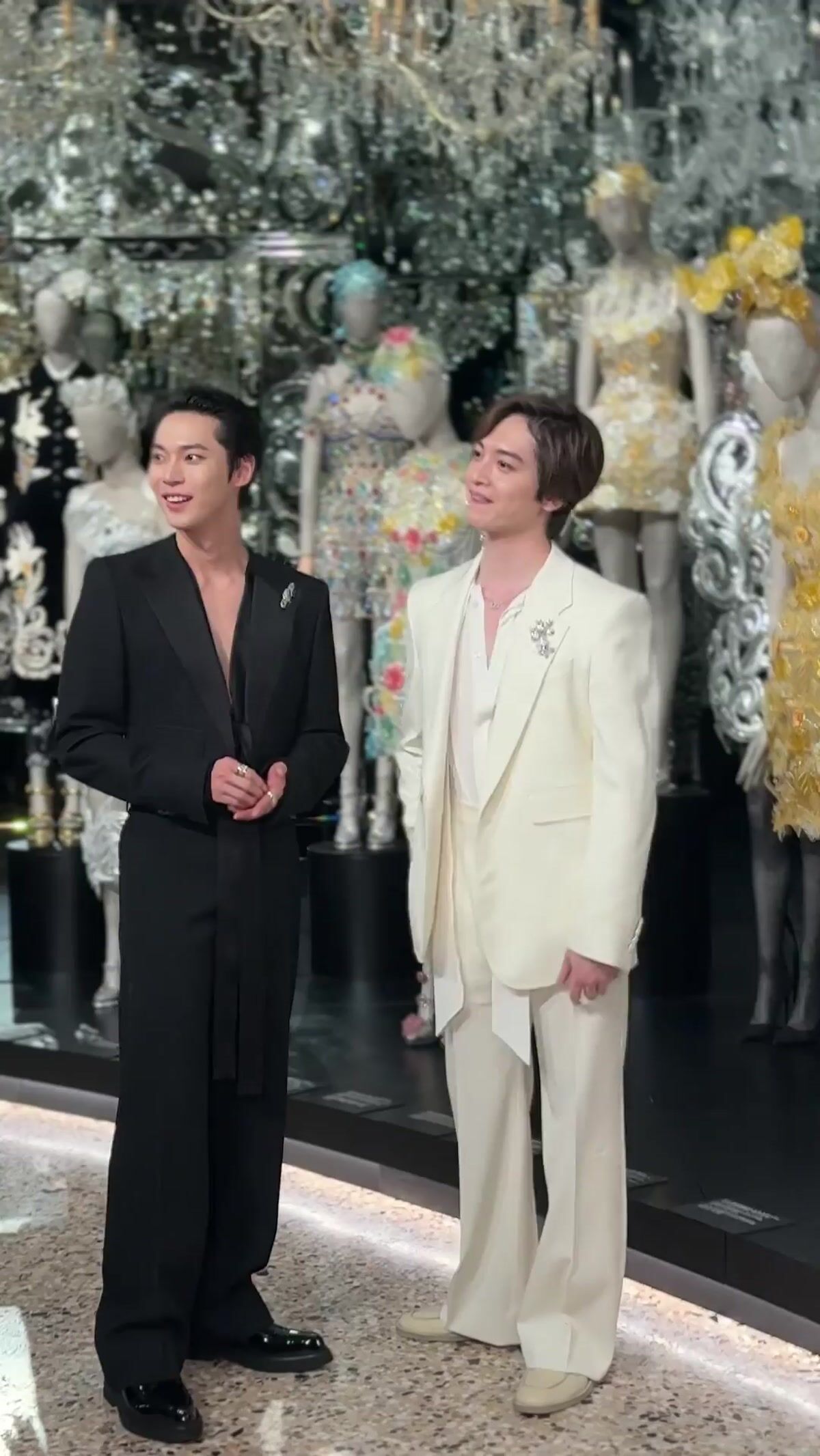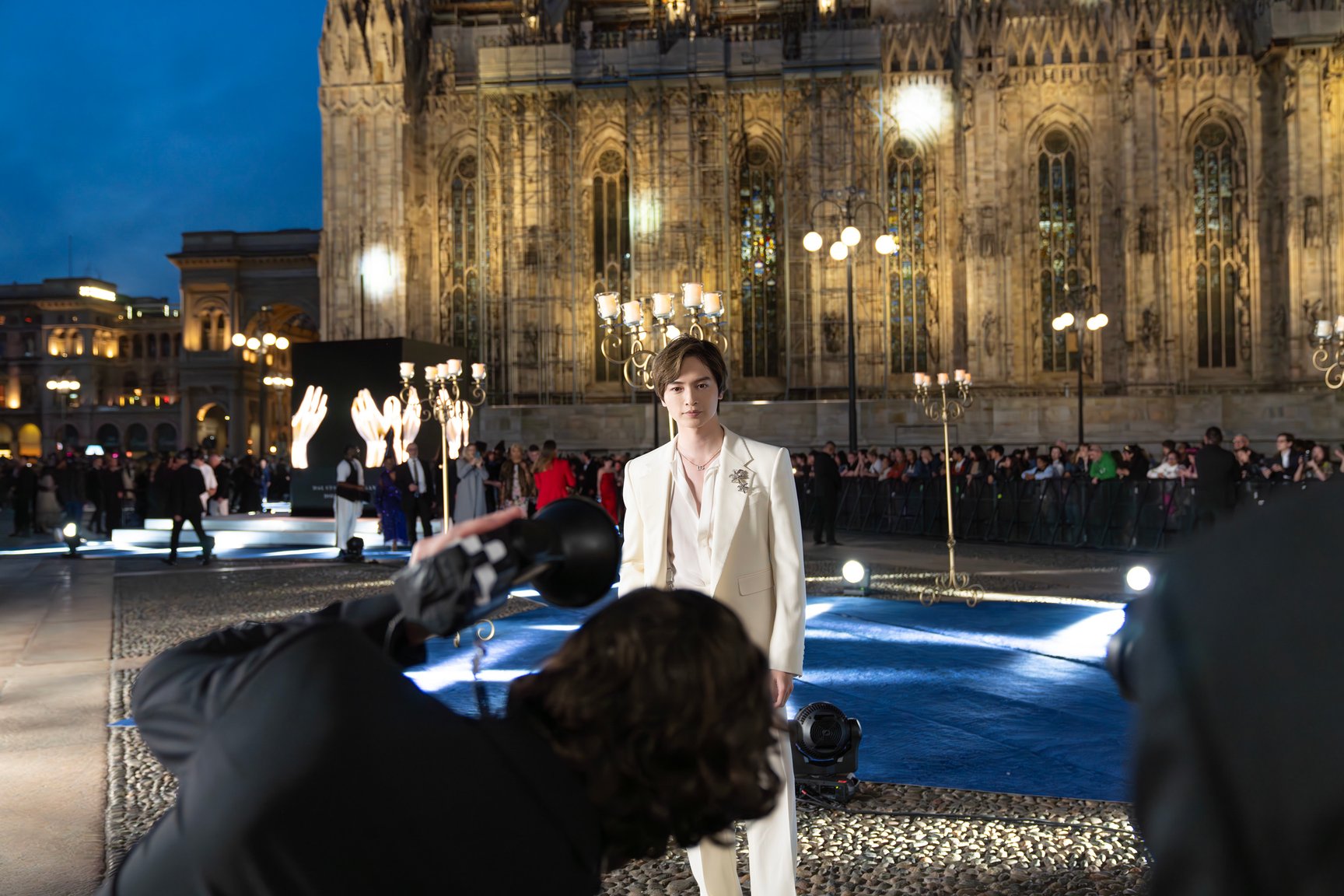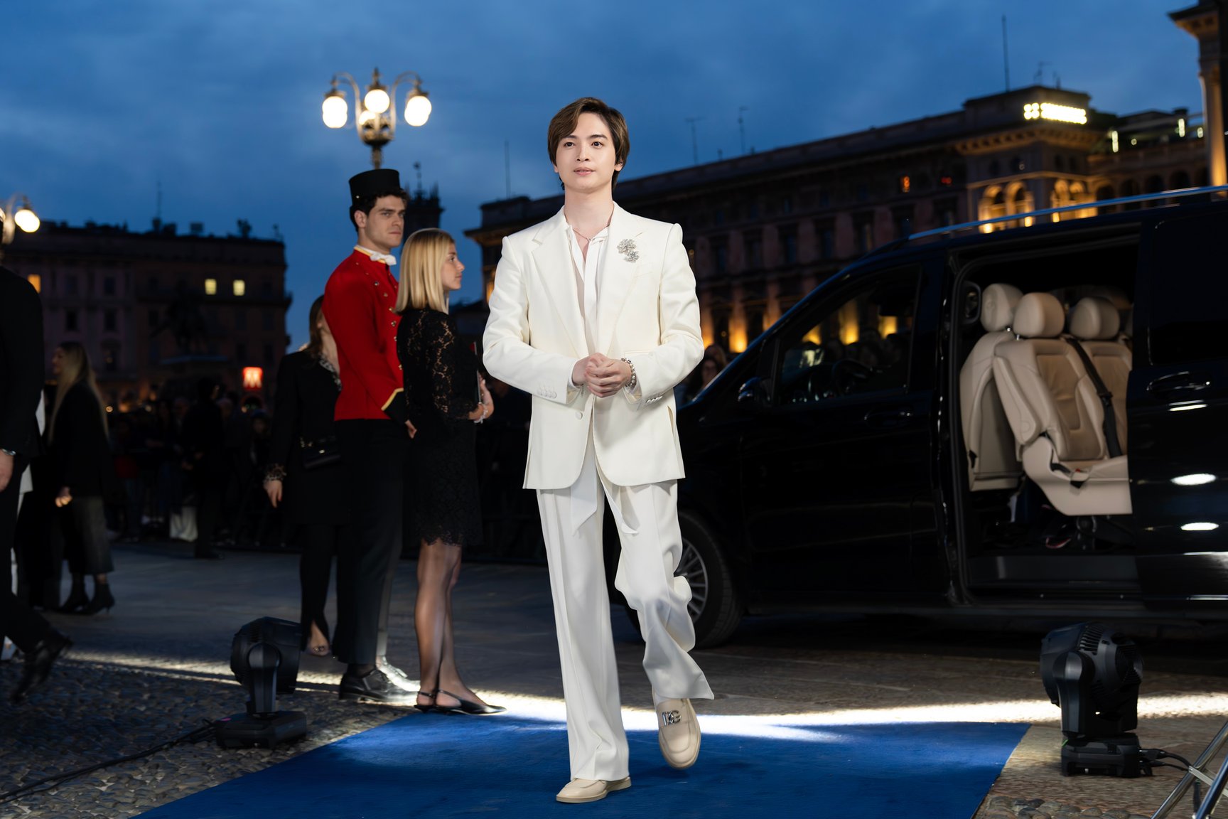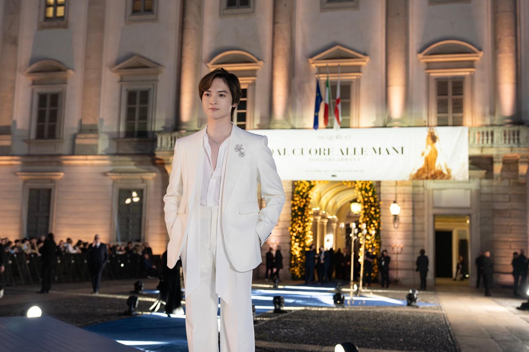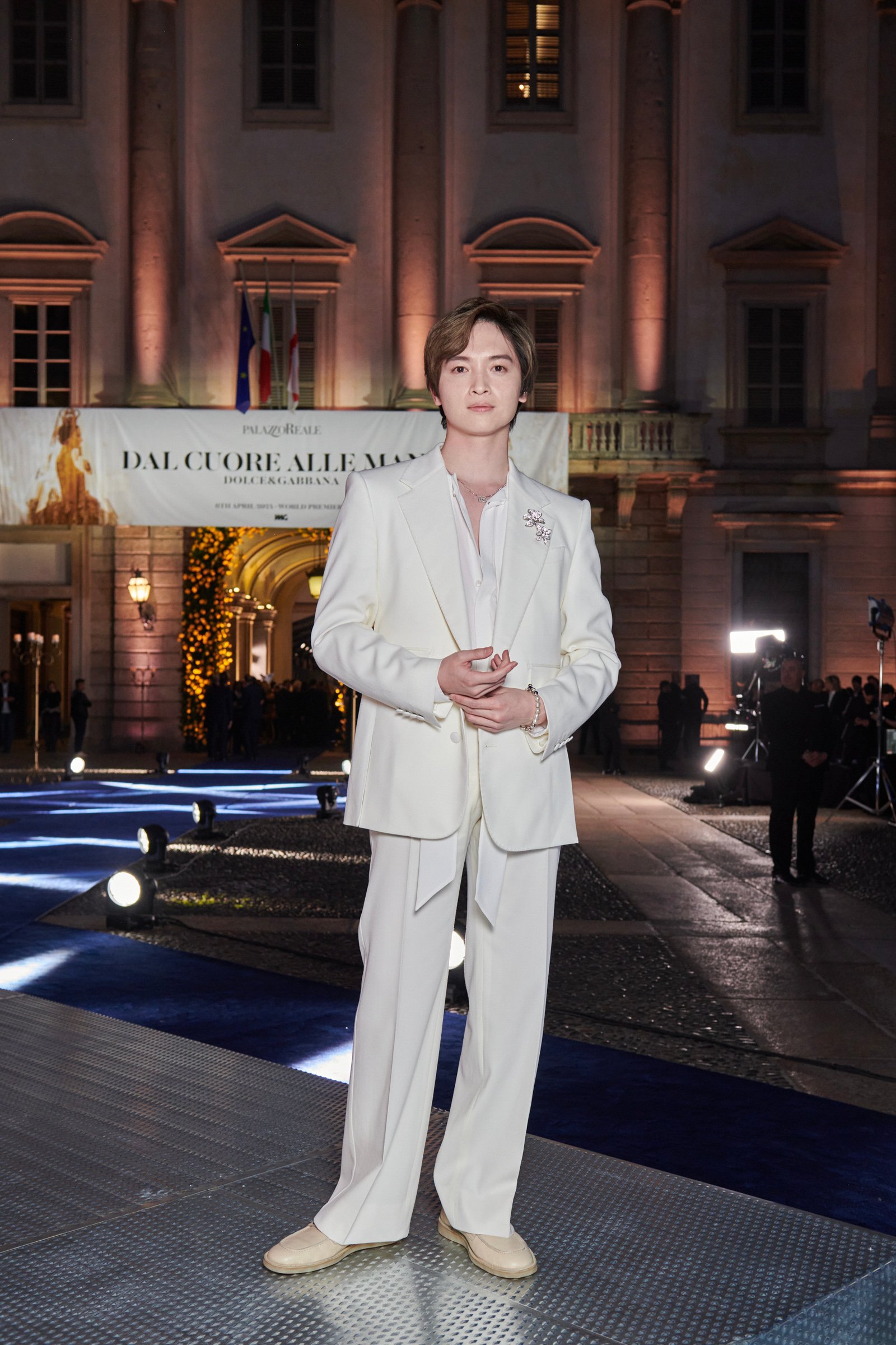 日中とは異なりドラマティックにライトアップされたドゥオモを背景に、ゲストたちが次々に来場。オープニングレセプションにはデザイナーのドメニコ&ステファノをはじめ、ブランドにゆかりのある友人や関係者、各国からアルタ モーダの顧客やセレブリティが招待されました。そこには歌手のシェールやモデルのナオミ・キャンベル、俳優のヘレン・ミレンやデミ・ムーアといった錚々たるビッグネームの姿も。ブルーカーペットに登場した玉森さんは、フォトコールやコンテンツ撮影を行ったほか、周辺に集まったファンへのサインに応じるなど会場の華やかな雰囲気に溶け込んでいきます。