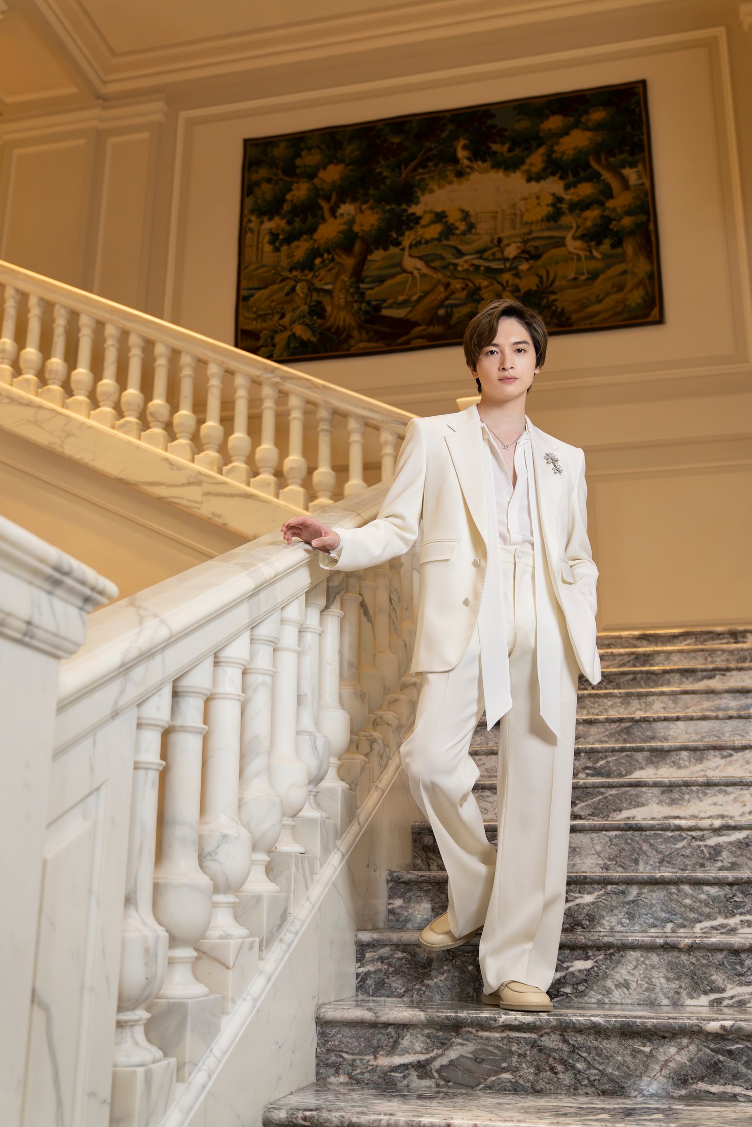 ミラノ2日目はいよいよ本番当日。前日のリラックスした雰囲気とは打って変わって、オールホワイトのスーツスタイルで登場した玉森さん。上品で凛としたフォーマルな出立ちでホテルでの準備を済ませ、今回のメインイベントであるエキシビションのオープニングレセプションが行われる会場へと向かいます。
